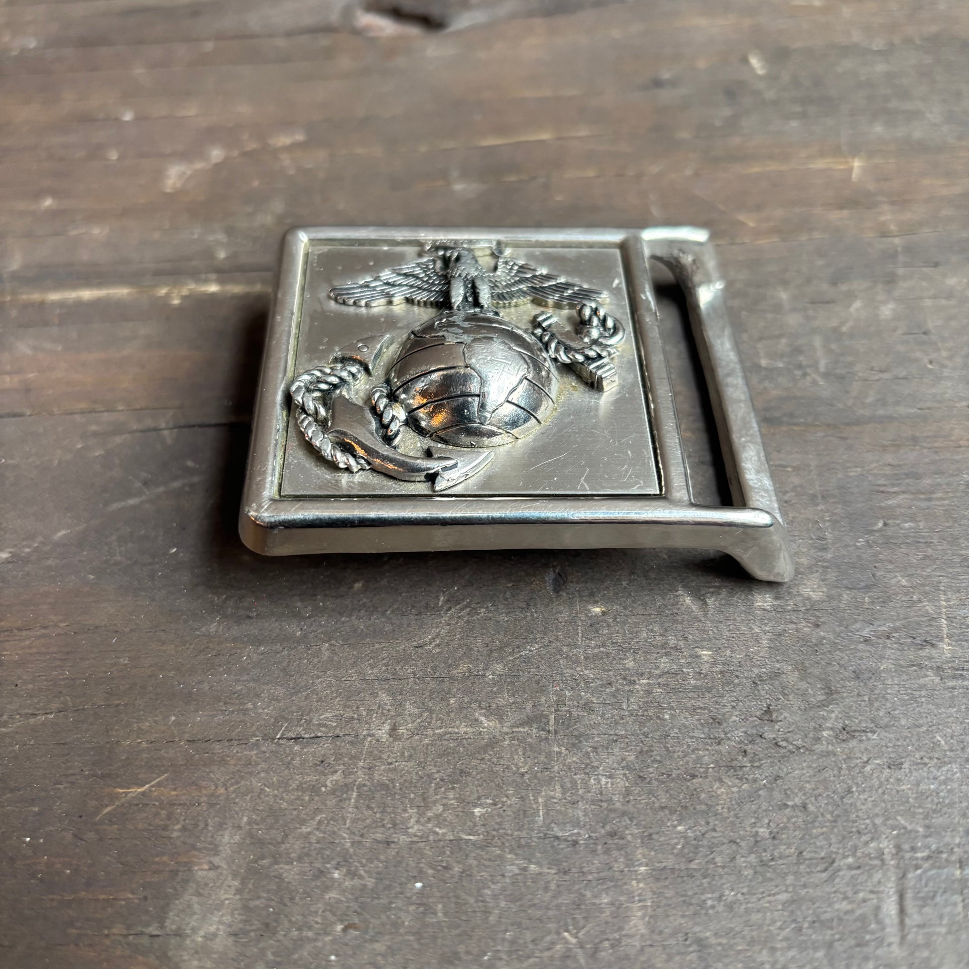 Square shaped US Marine silver belt buckle featuring the US Marine Corp emblem, made by Crestcraft