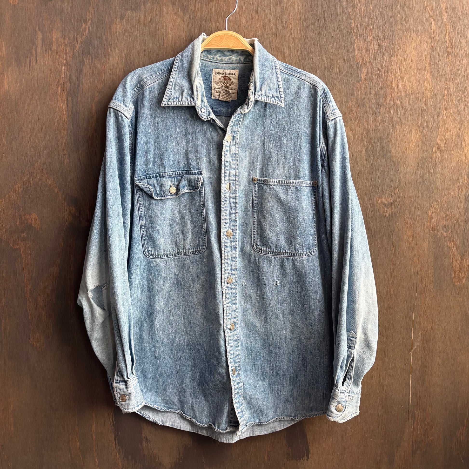 Perfectly worn and rugged vintage Banana Republic denim button up shirt, likely from 1980s, in worn condition with rip in elbow and on front - see photos, 100% cotton, size M, sold as is