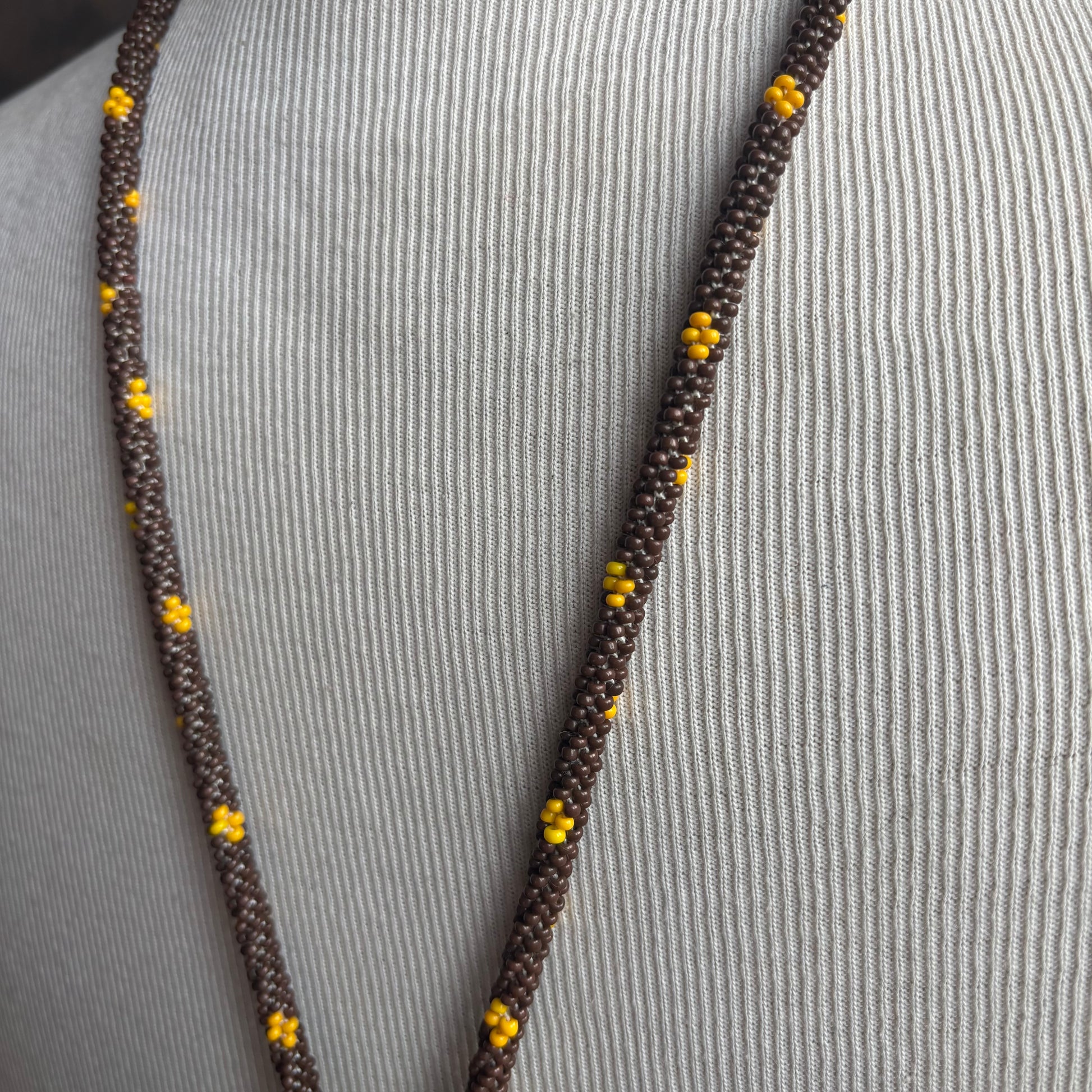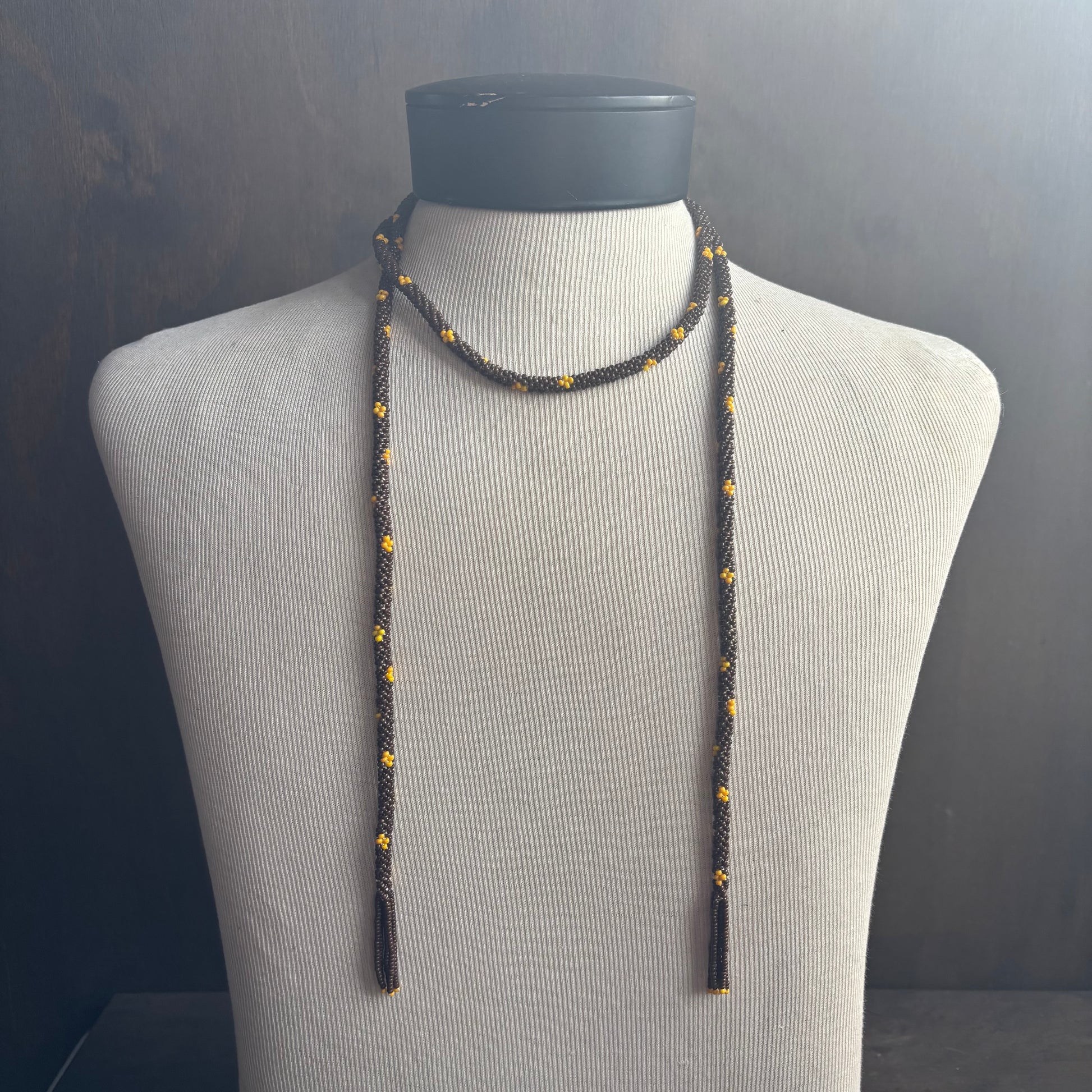 Open-ended seed bead brown and yellow rope necklace that can be worn many ways, fun a unique piece from 1950's era.