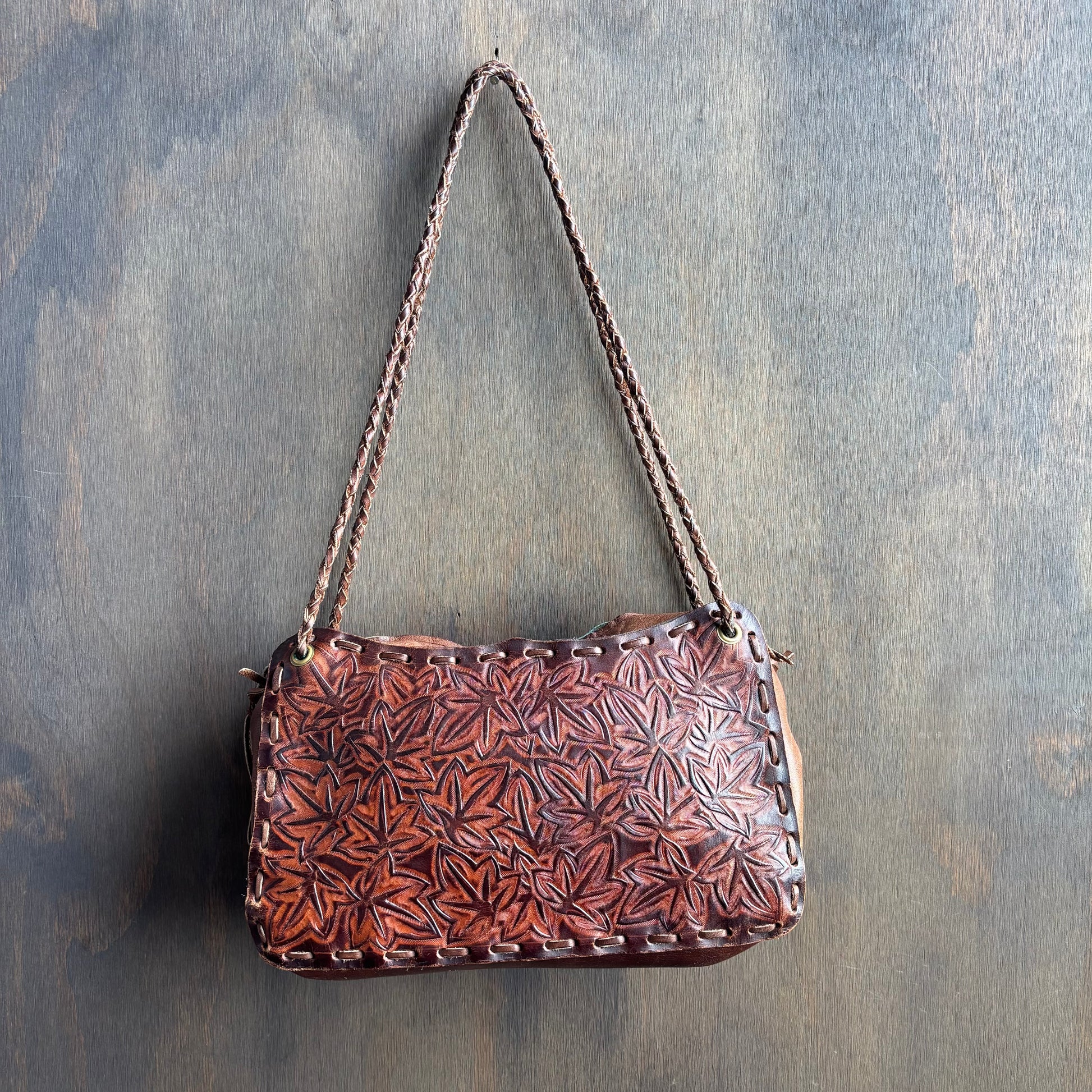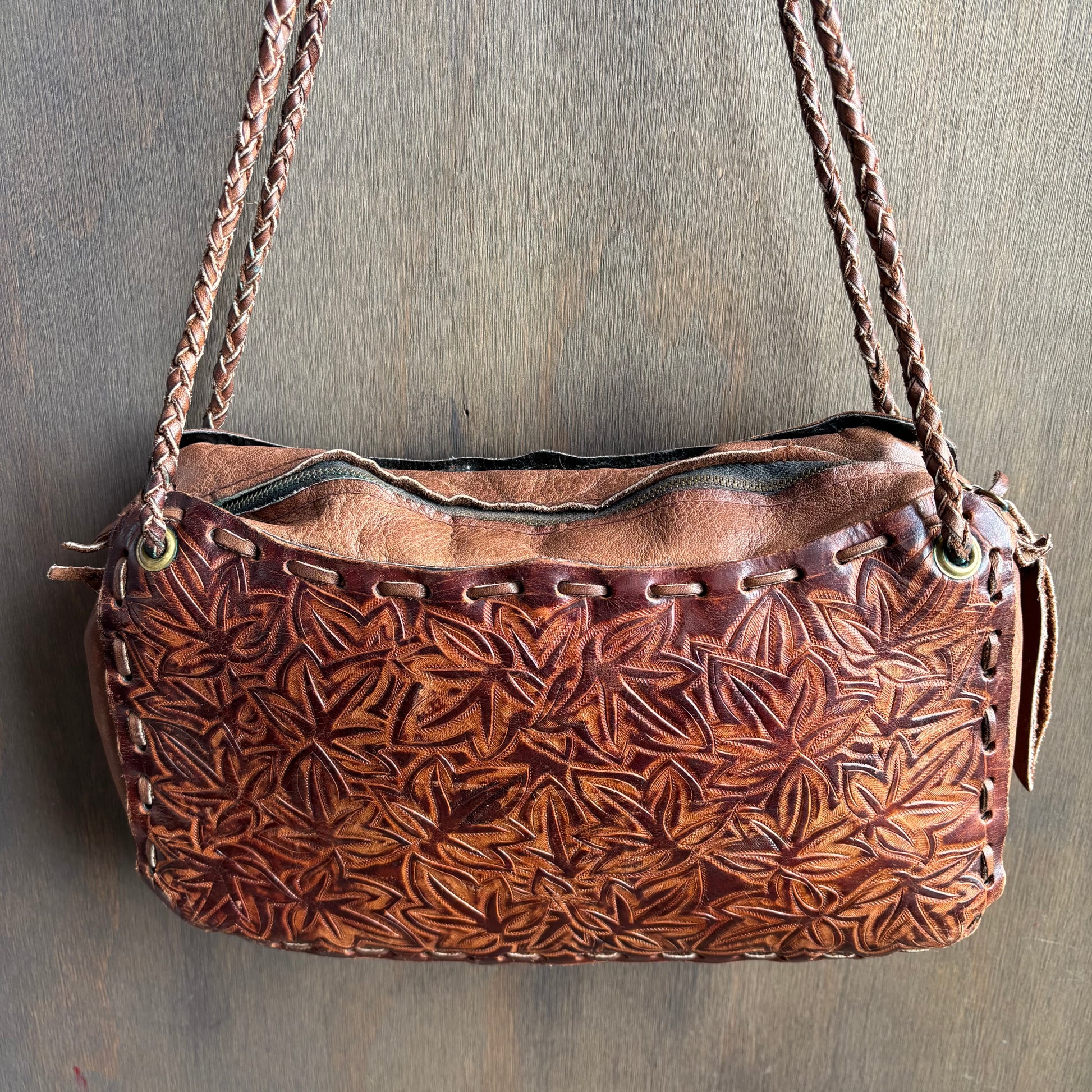 Funky and authentic vintage brown leather bag with braided straps and leaf details, in good vintage condition