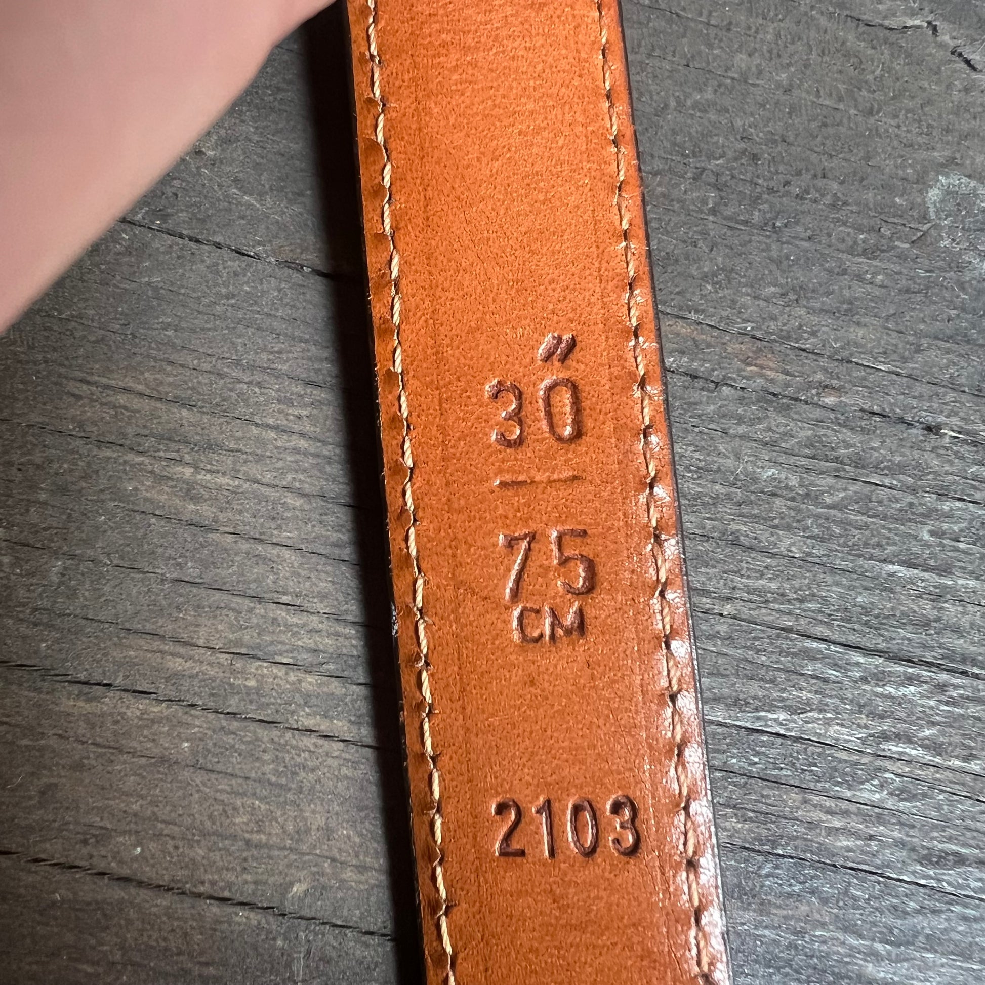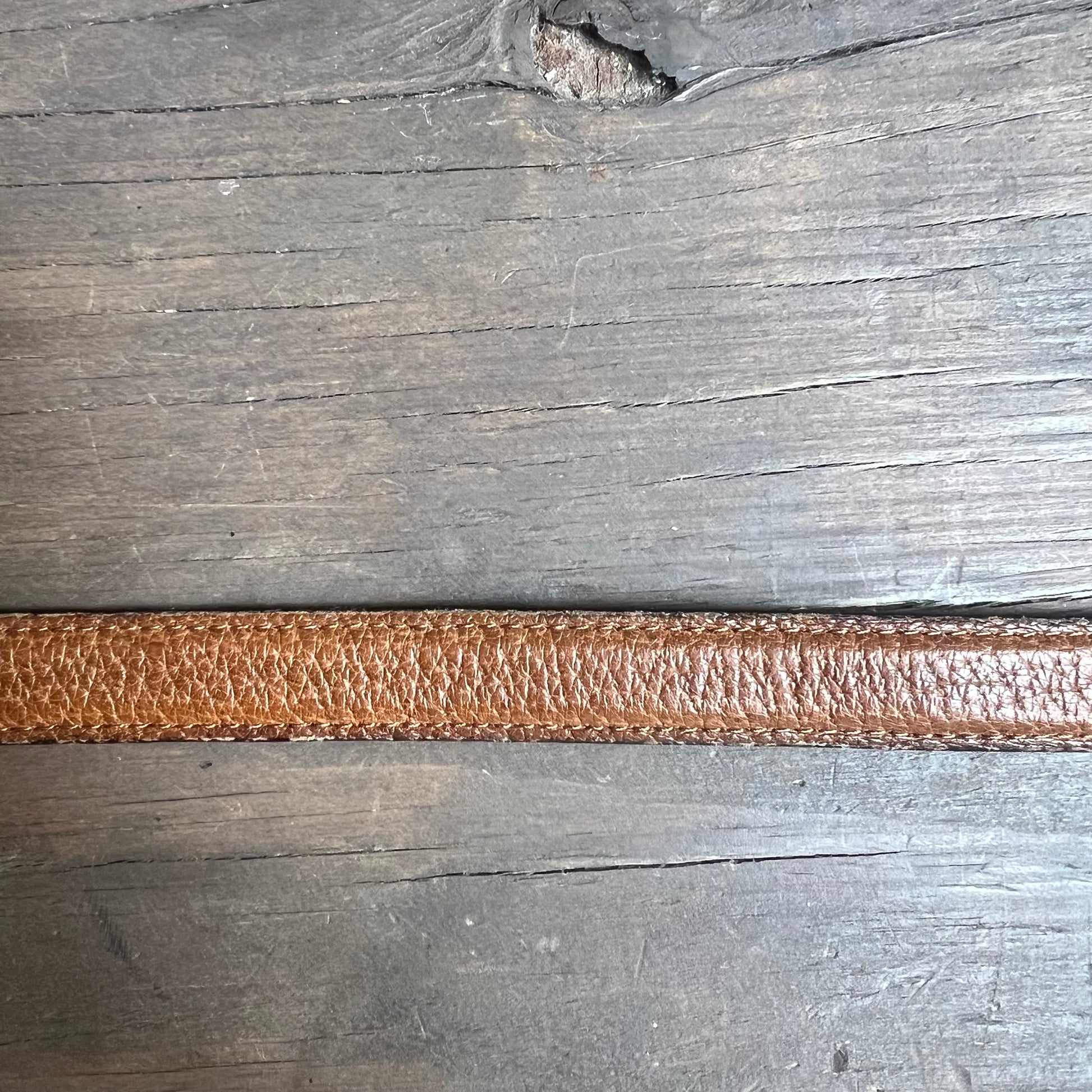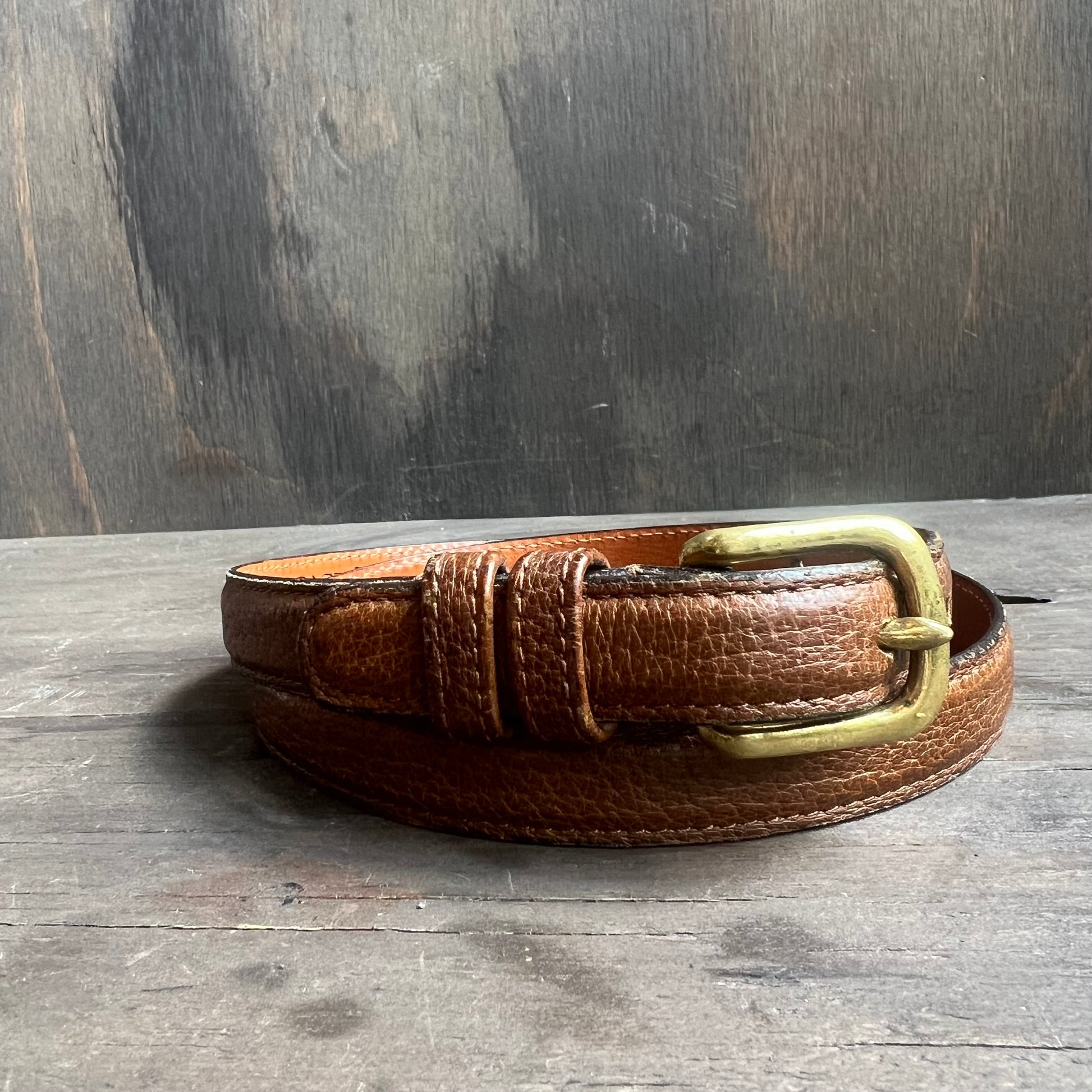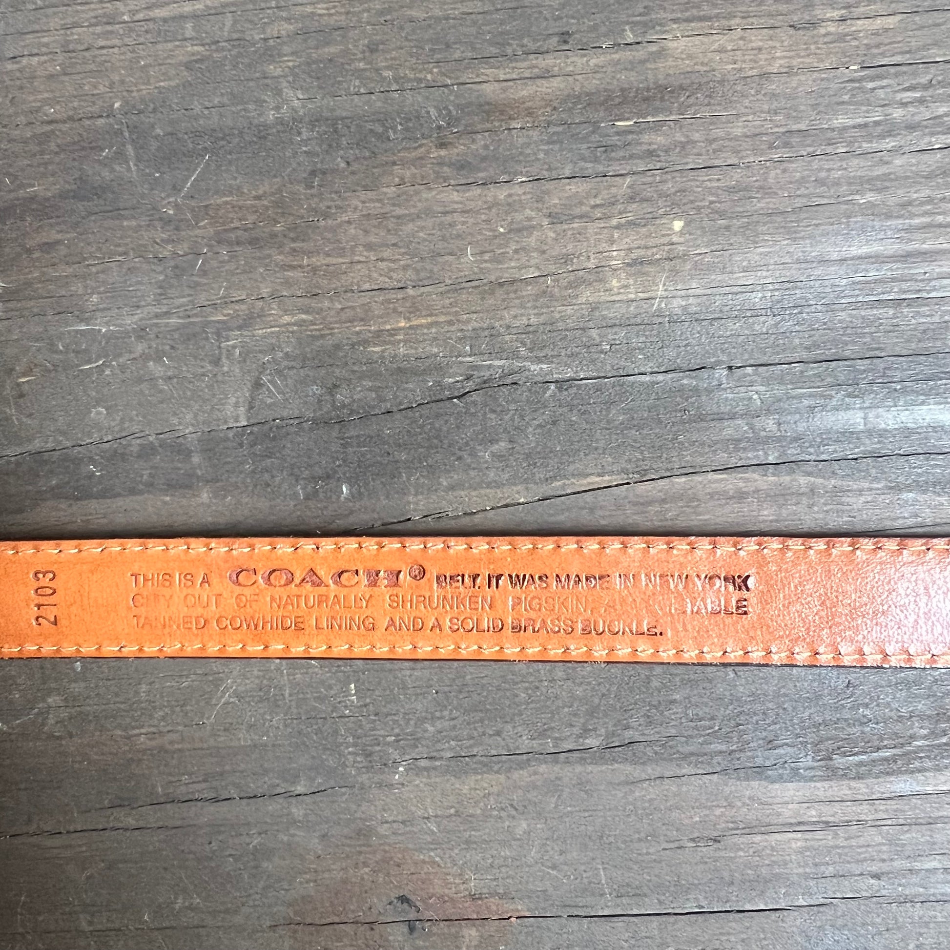 Simple and classy thin brown leather coach belt. Made in NYC from pigskin and vegetable tanned cowhide with a solid brass buckle. In excellent condition. Fits a 30” waist (size S).