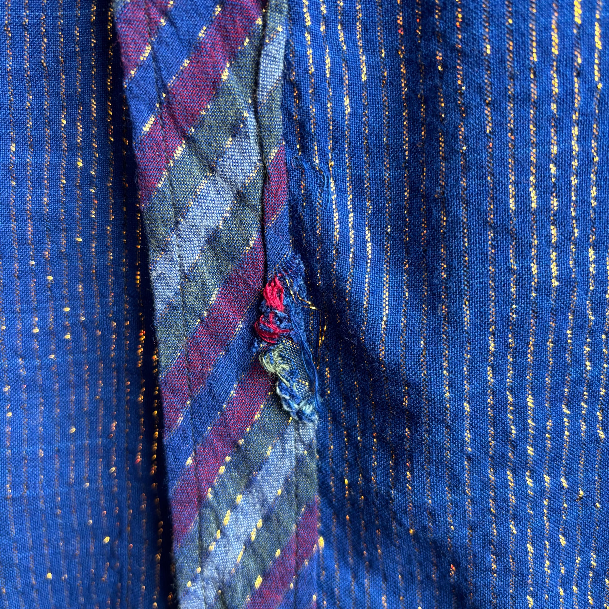 Absolutely incredible vintage Cutter Bill metallic button up featuring gold thread on a blue shirt with jewel tone details, good vintage condition with small fray at front - see photo, not size listed but fits like a S/M
