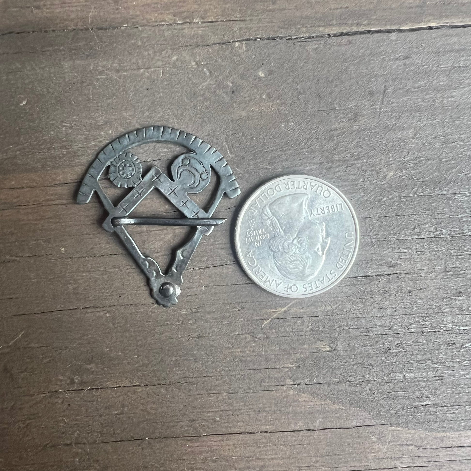 Unique handcrafted vintage caliper tool pin. Use it to customize a hat at our hat bar, pin it to your bag, or a jacket! In excellent condition. Pin is stamped with initials of the creator. See quarter for scale.