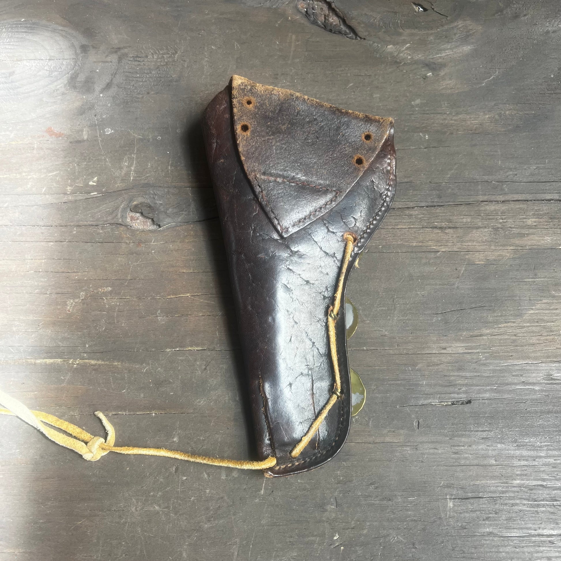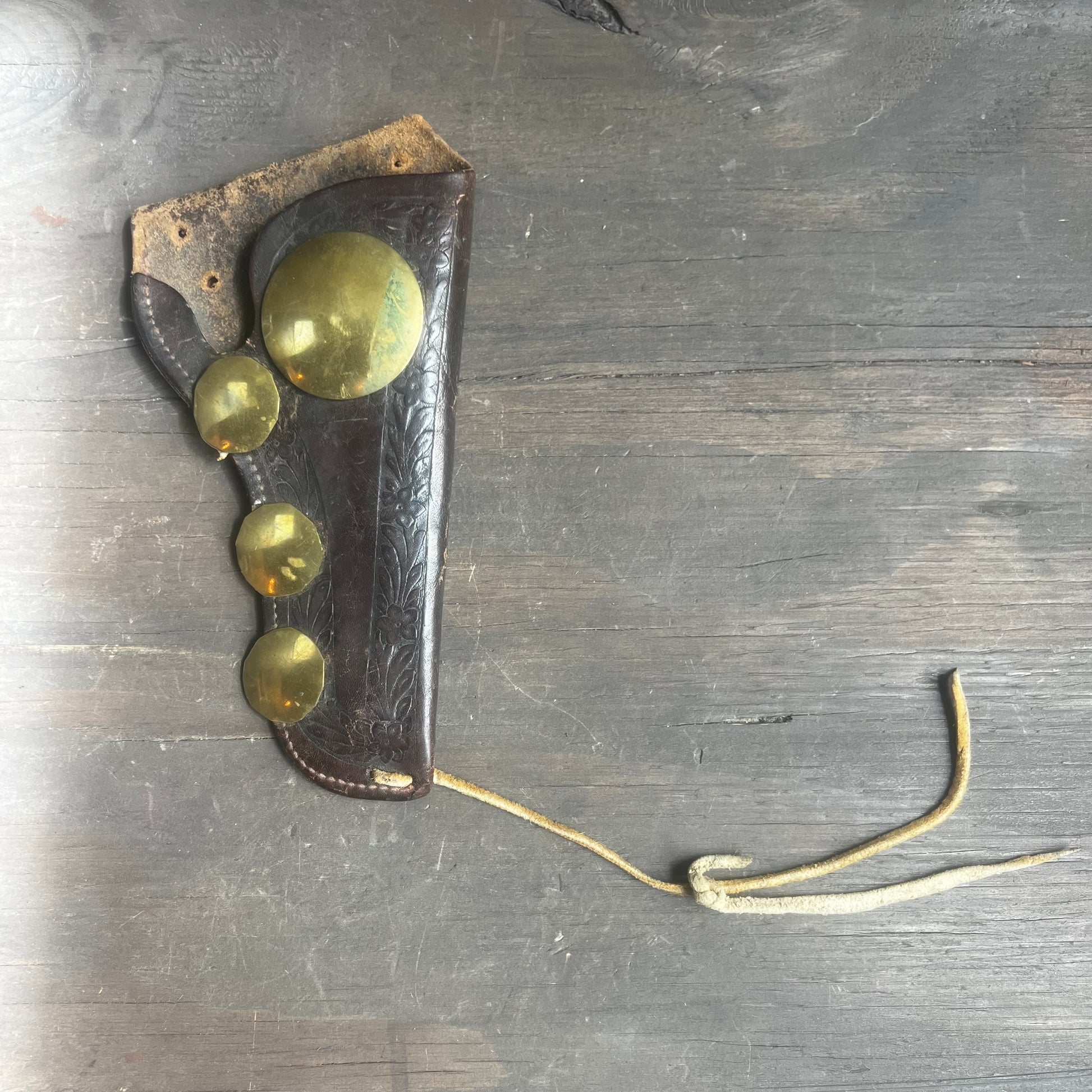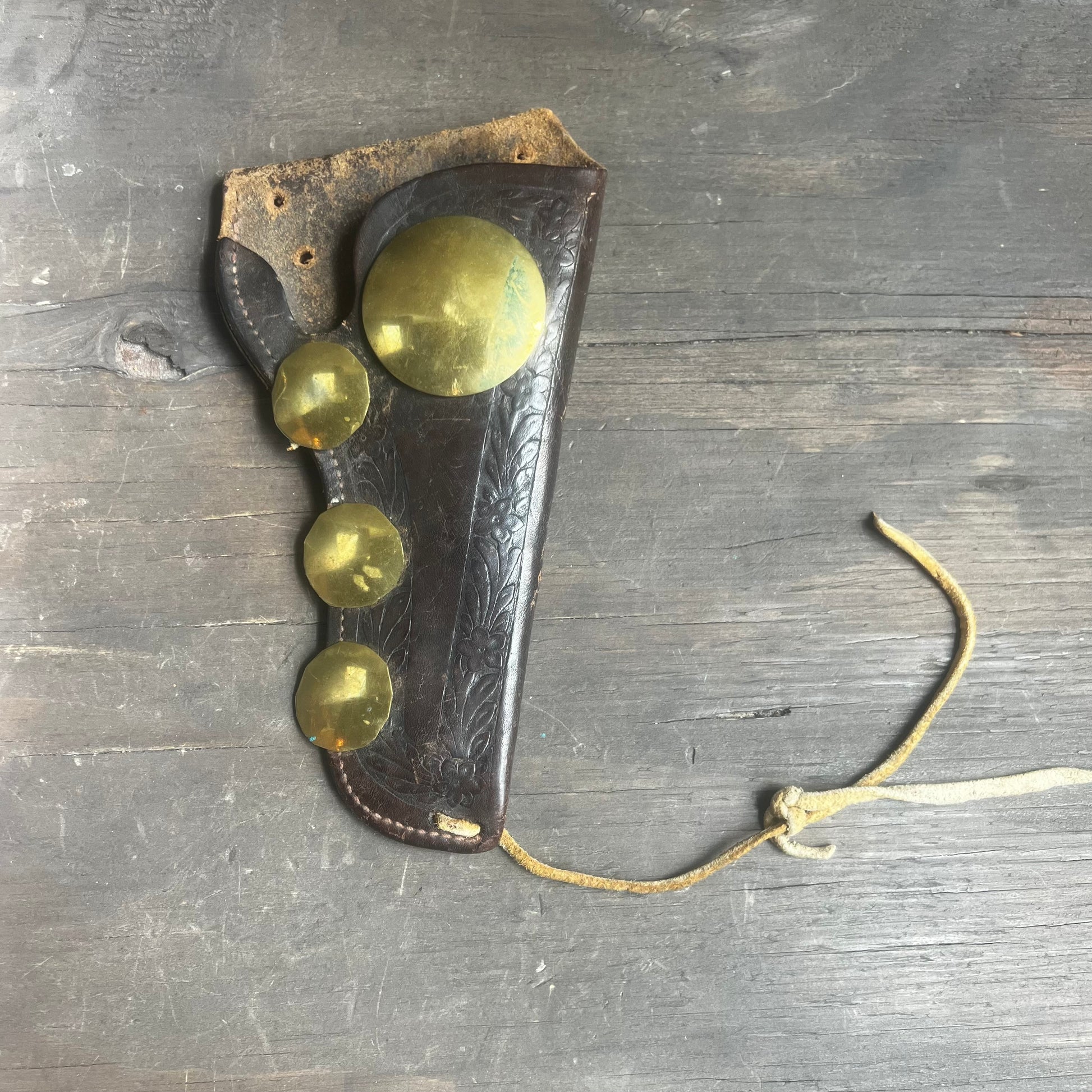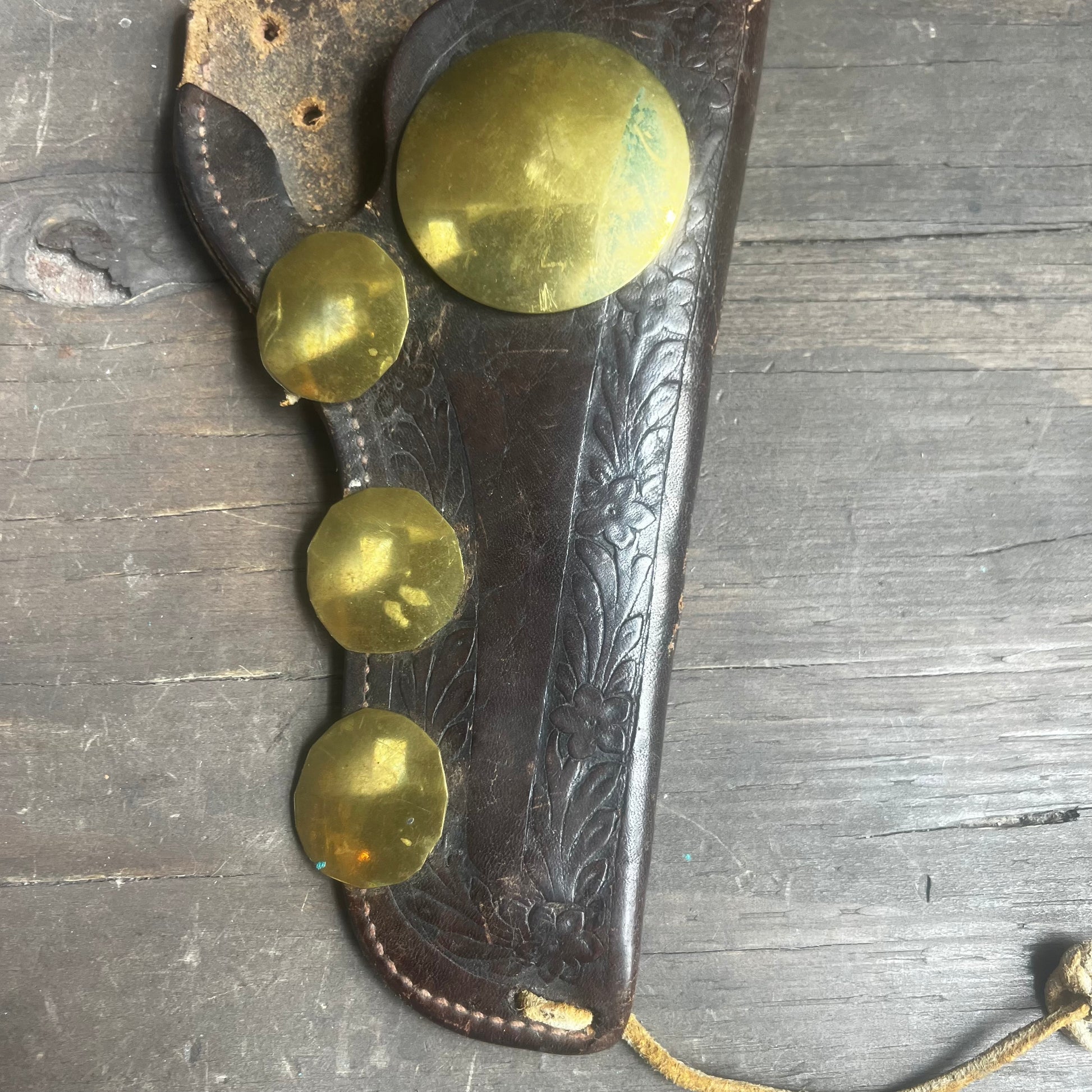 Small vintage holster with brass circle decals. Cool vintage collectors item. In great condition, 9” long.