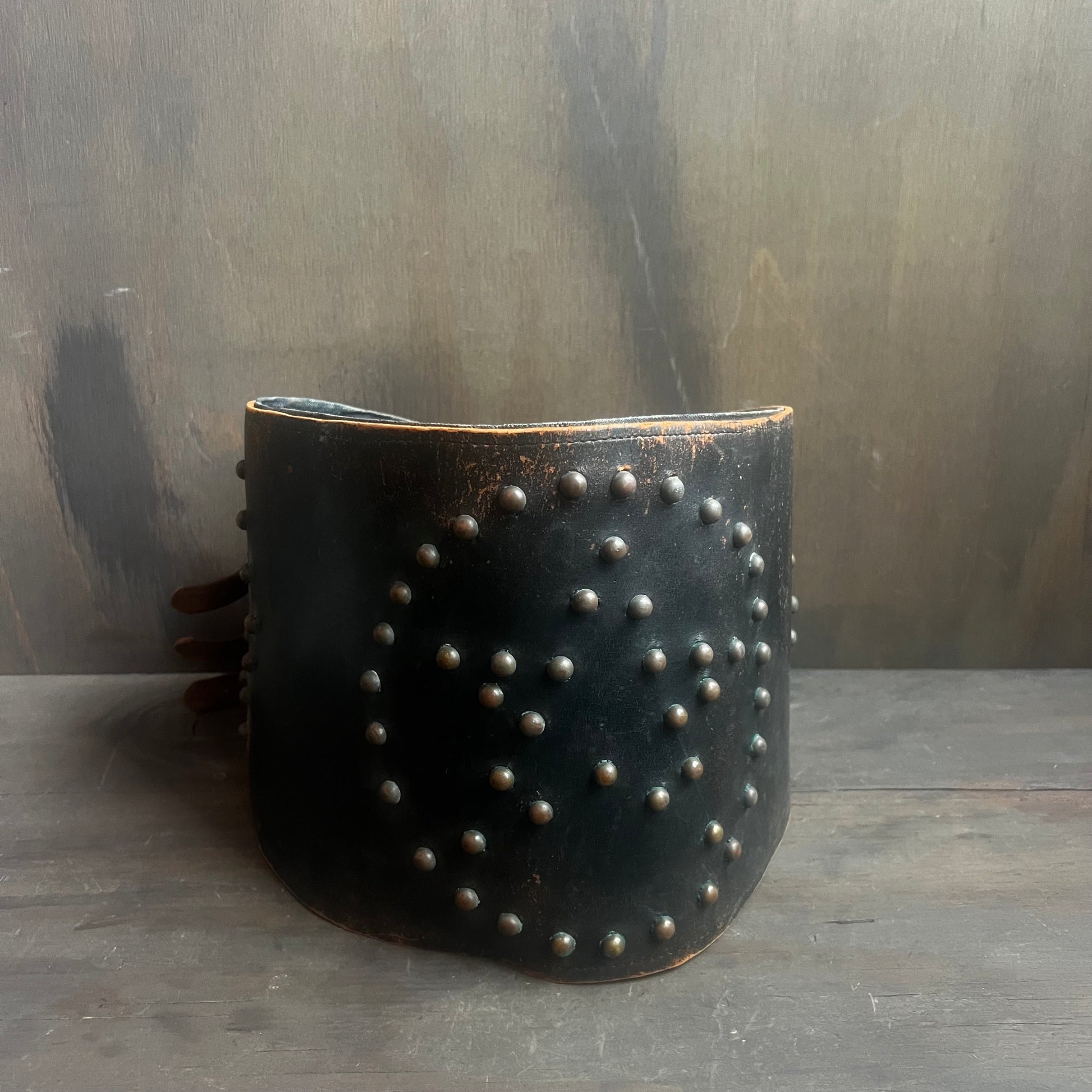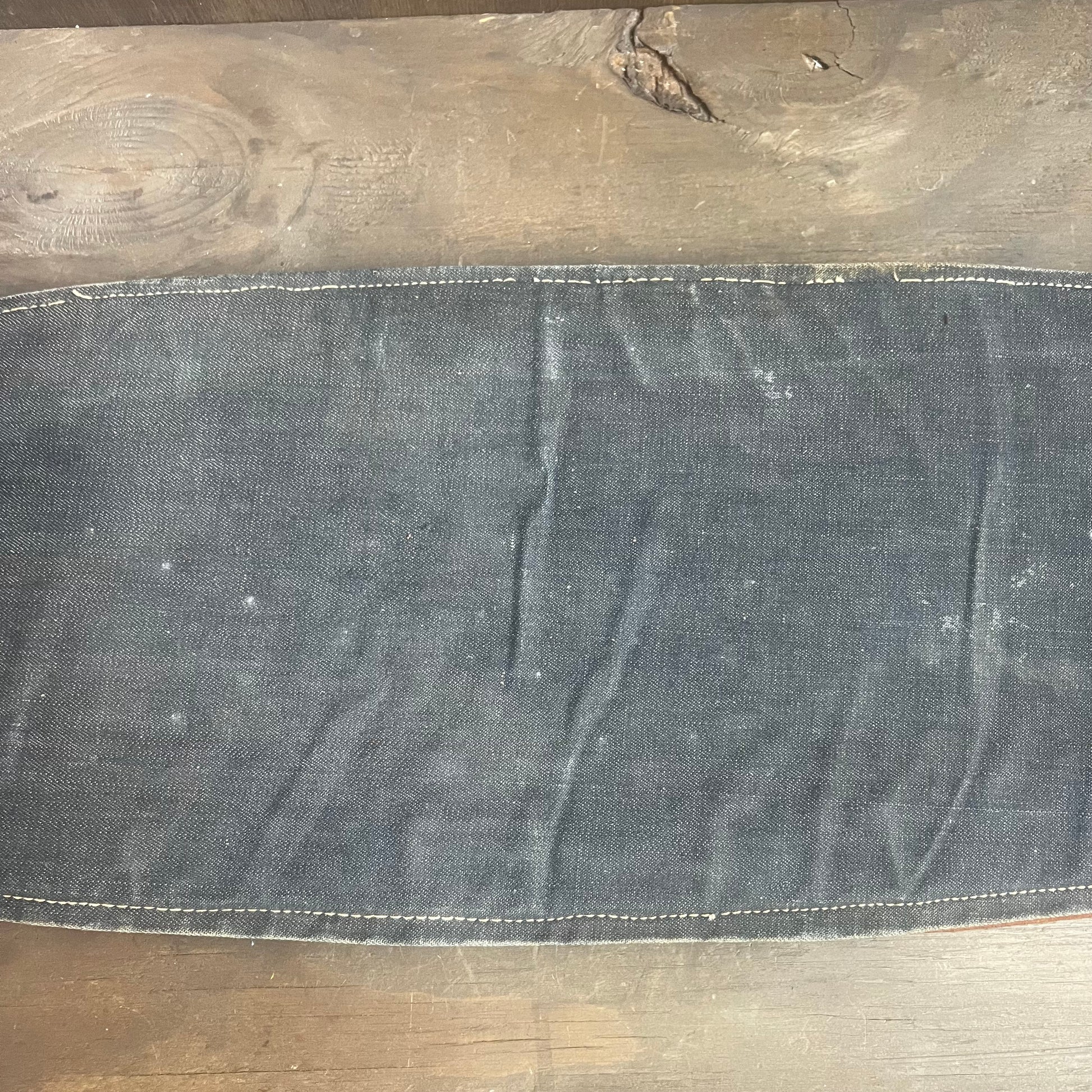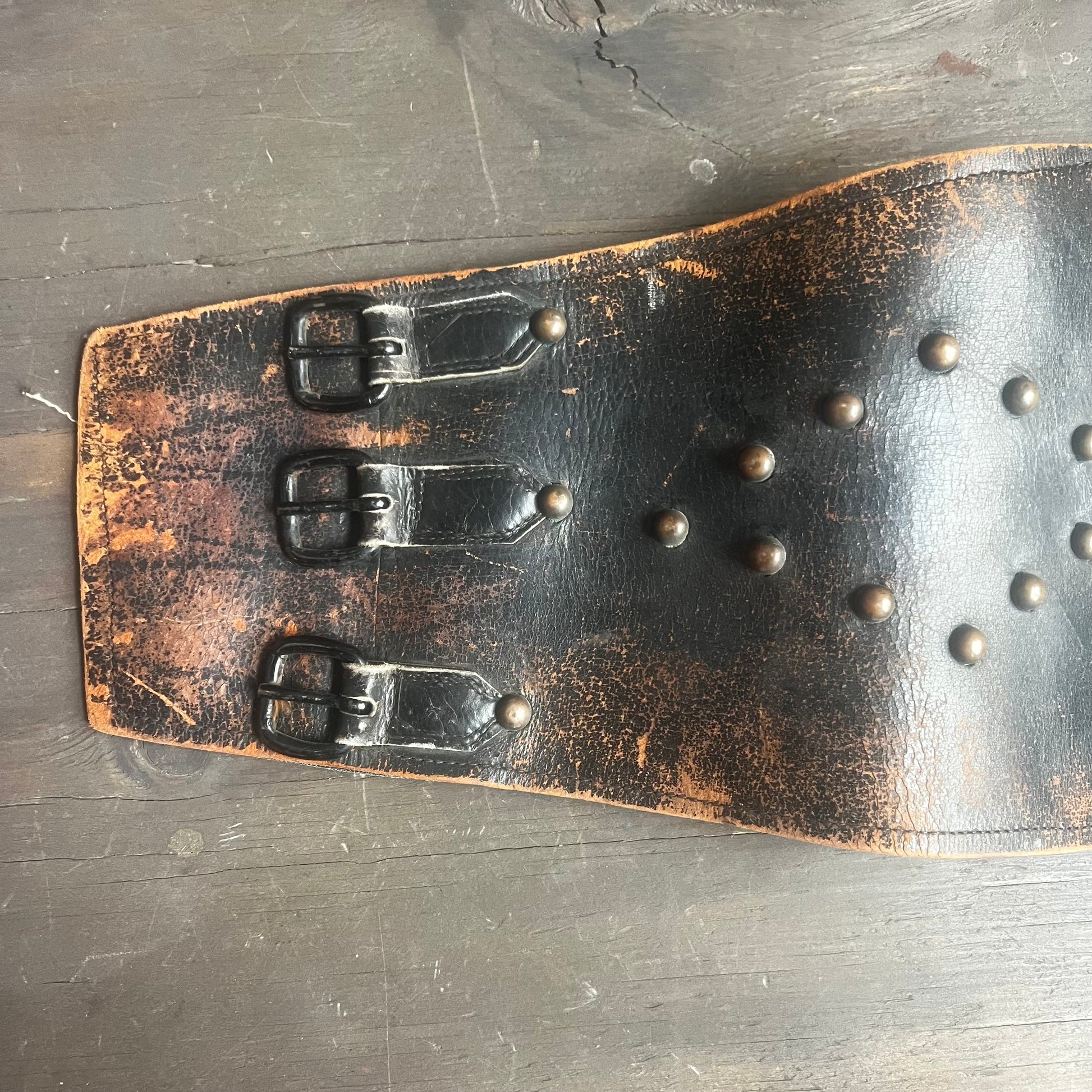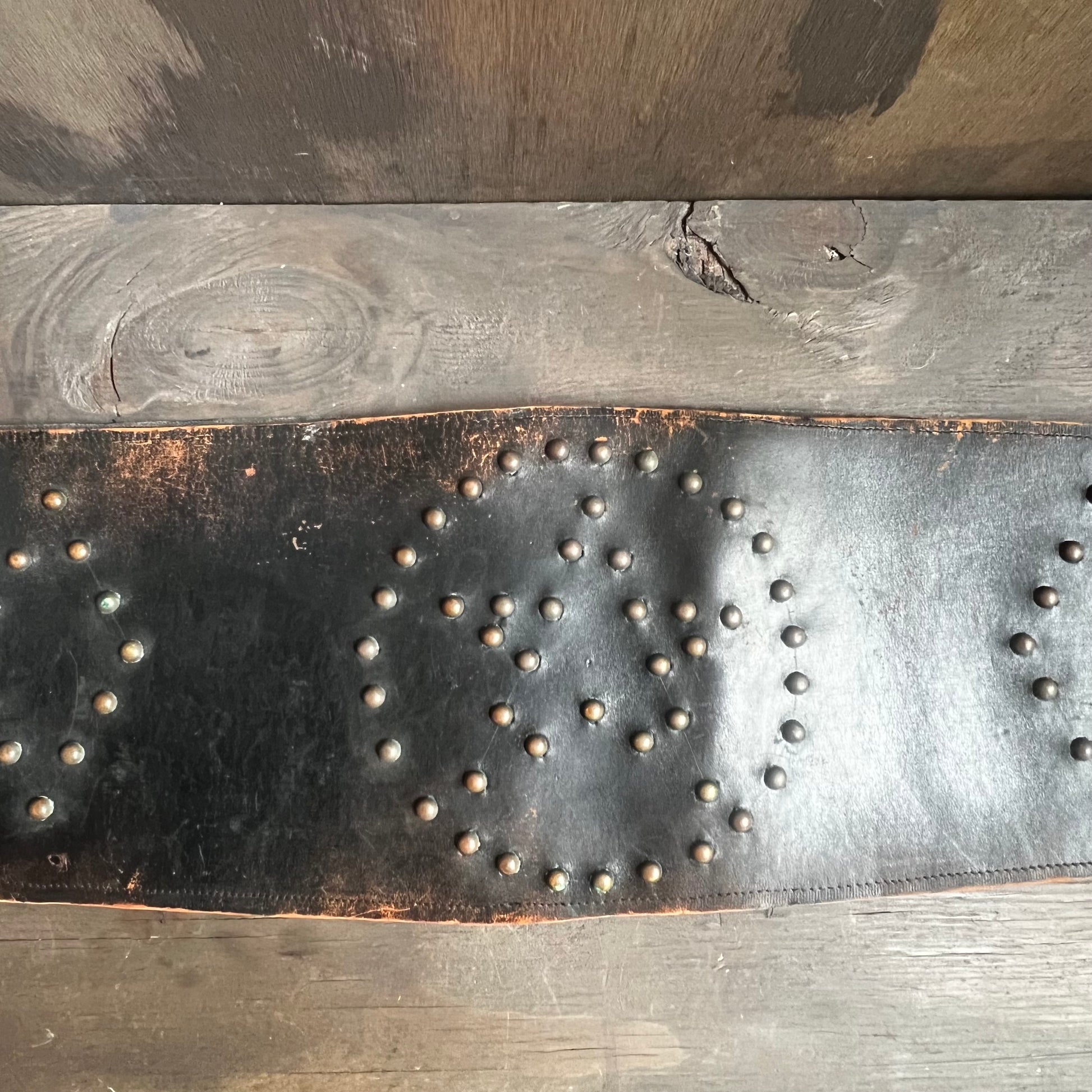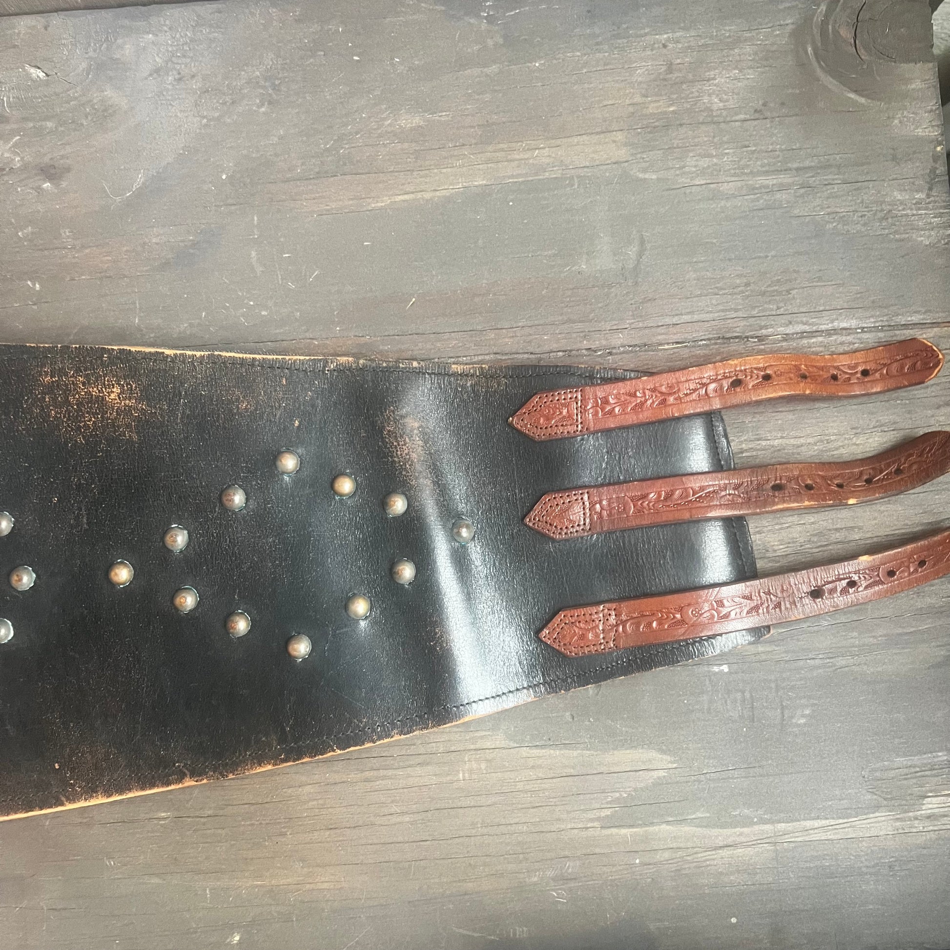Beautiful leather belt with brass studs. Belt has three buckles and belt straps made from tooled leather, with denim lining. In good vintage condition. 46” long, fits a size L/XL.