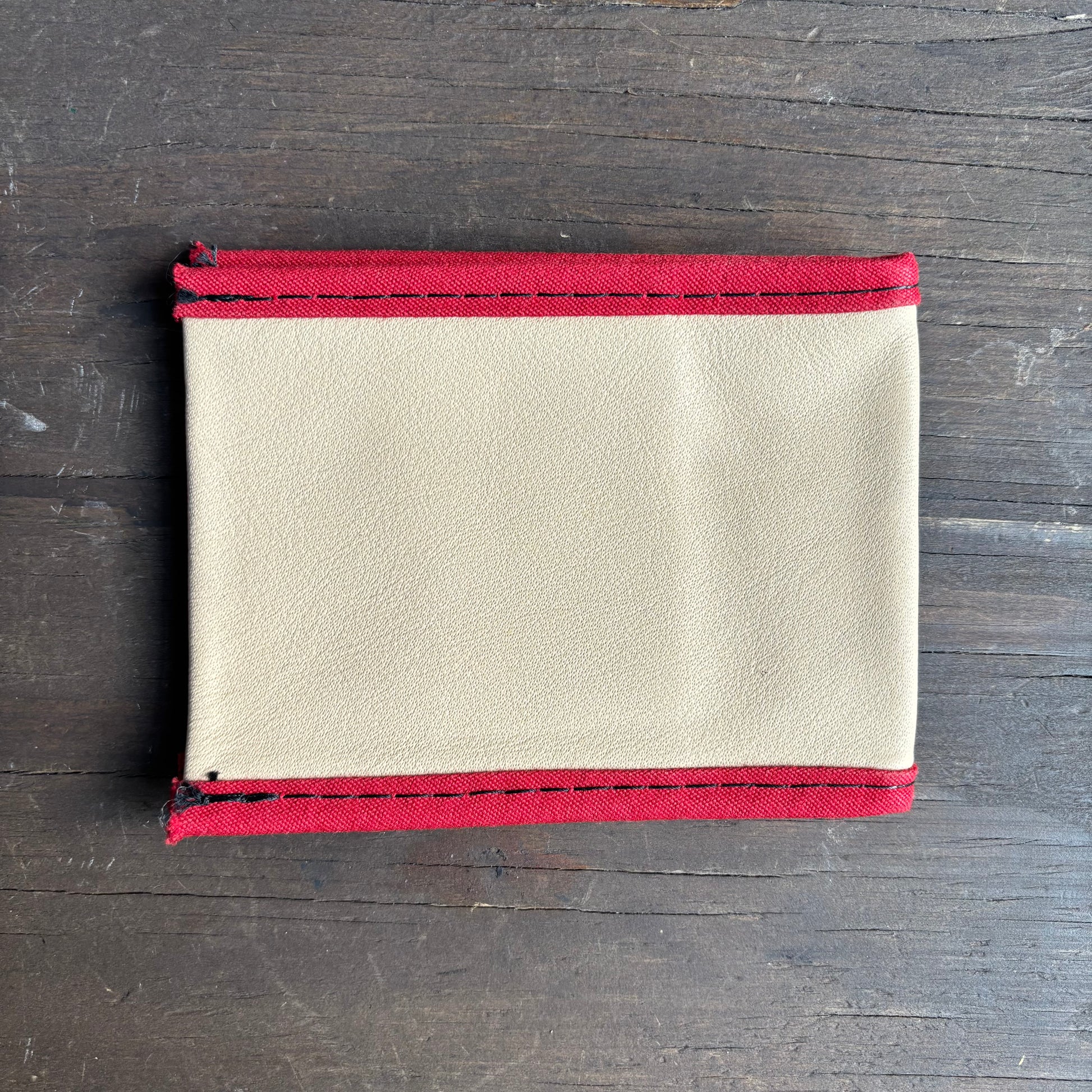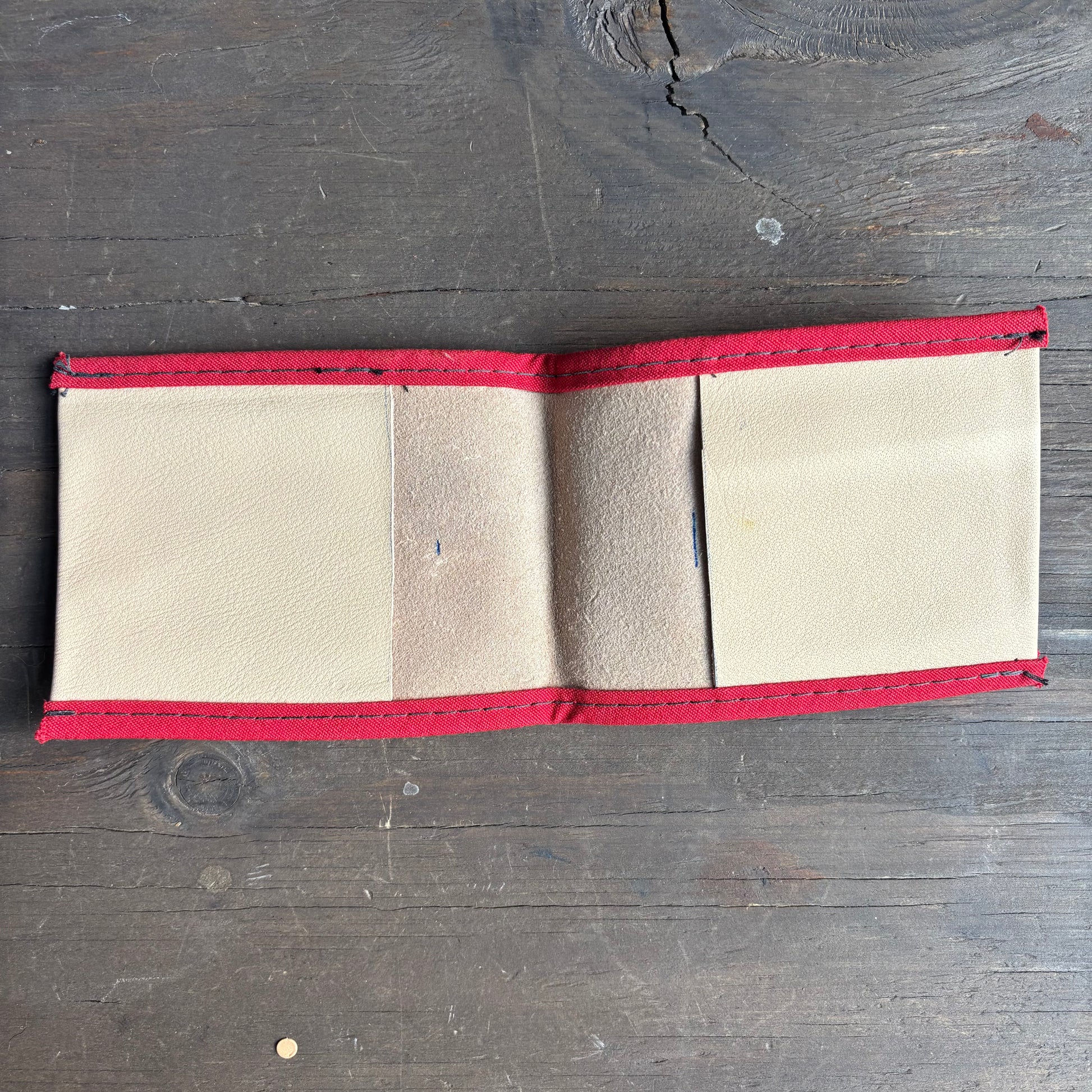 Red-trimmed handmade vintage leather single-fold wallet in good vintage condition