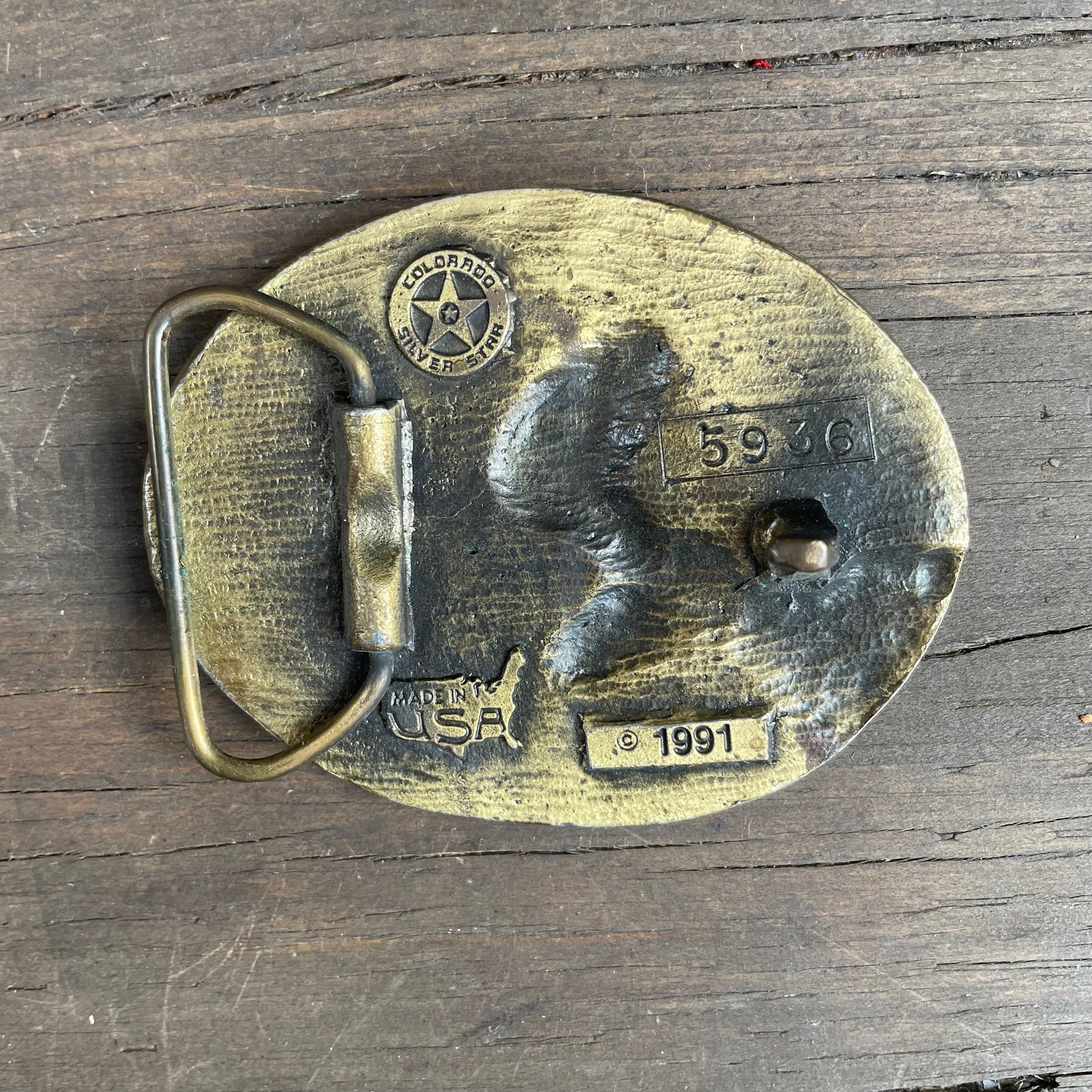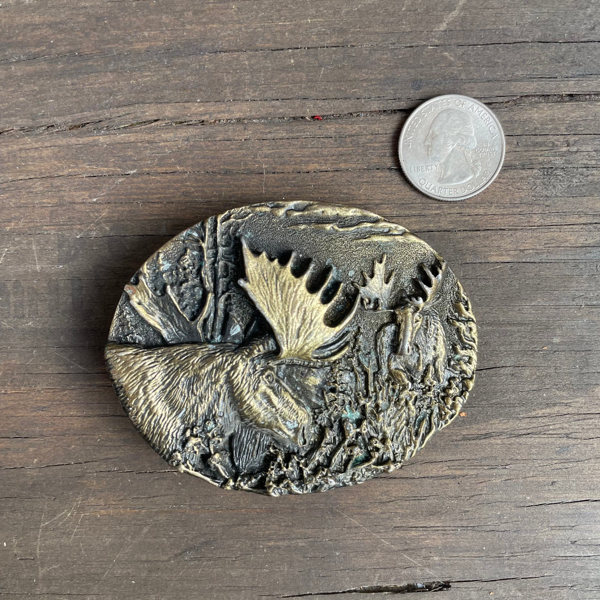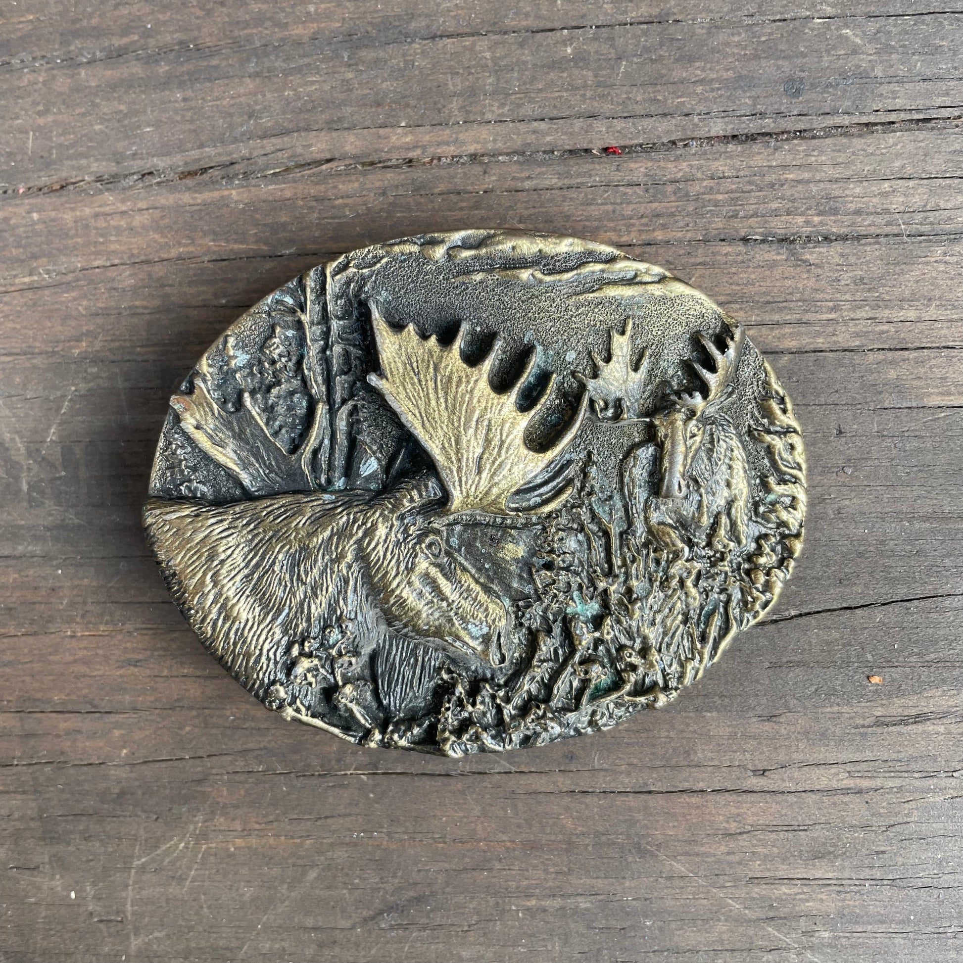 Vintage western brass-tone belt buckle featuring two moose bulls. Cast in 5936 stainless steel. Made in Colorado, USA in 1991. 3.5” across and pictured with a quarter for scale.
