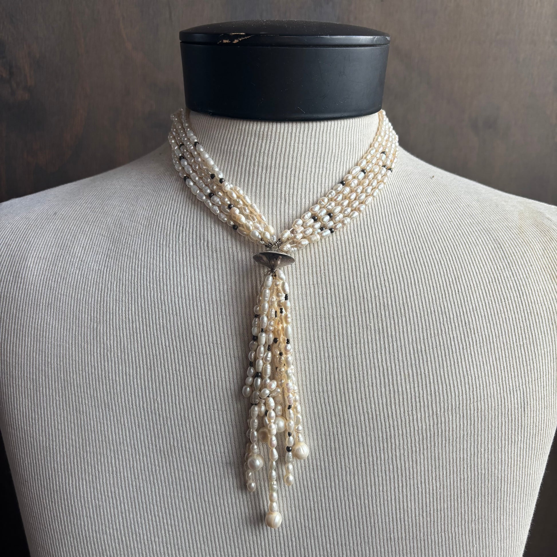 Unique and pretty multi-strand freshwater rice pearl necklace with large silver bead at center and throughout, unstuffy pearls perfect for a more casual look, pearls in good condition considering age.