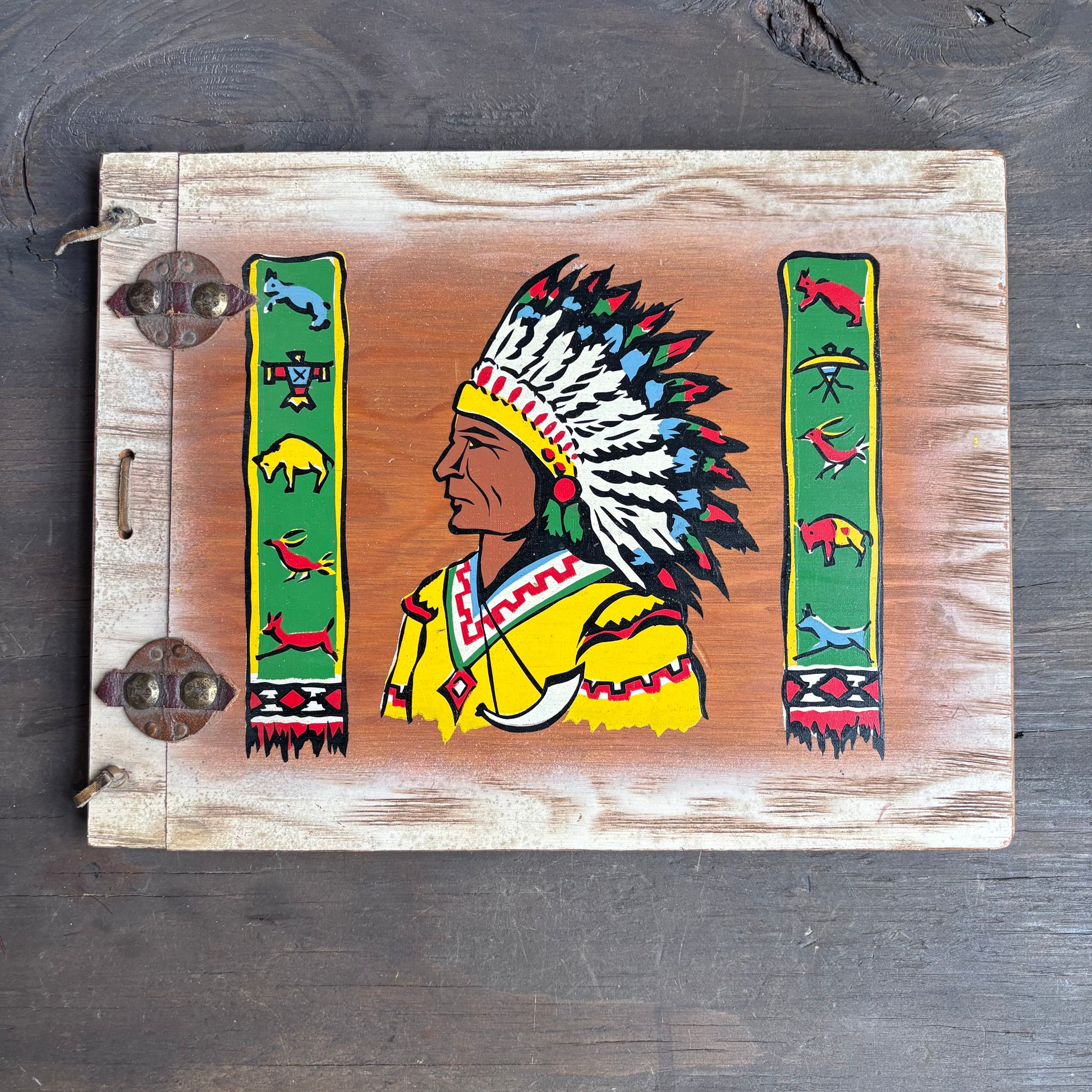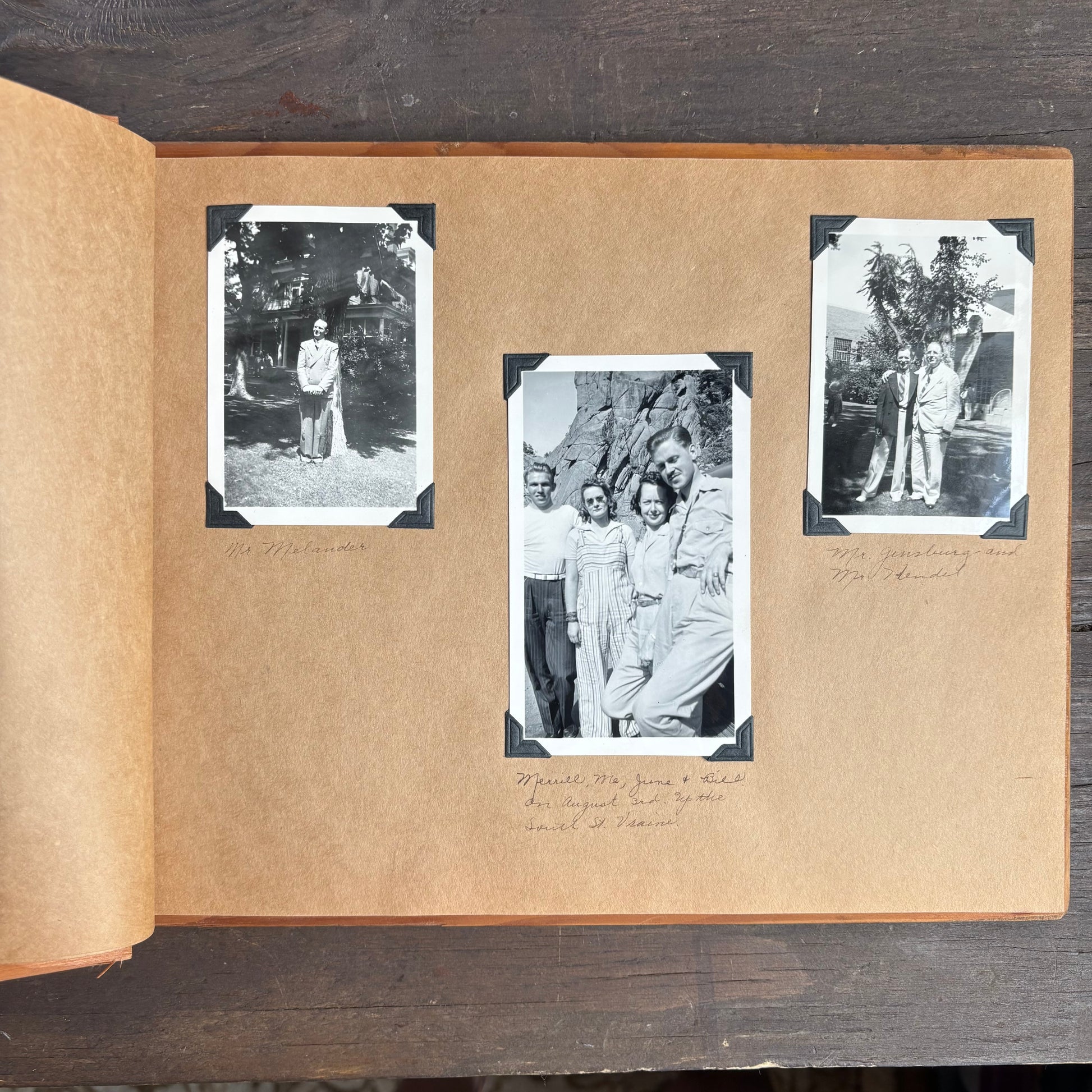 Unique vintage painted photo album with leather and brass hinges, half filled with previous owners beautiful black and white photos.