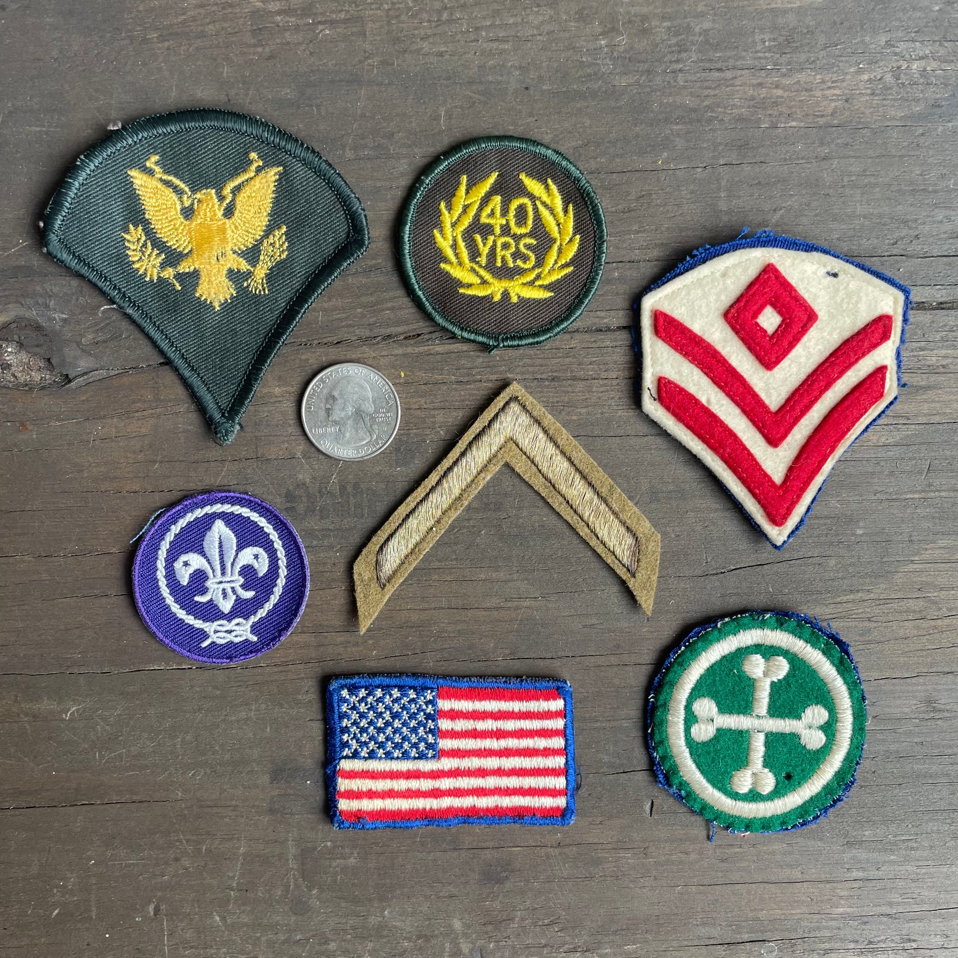 Various vintage patches: US Army SP4, Veterans of Foreign Wars 40 years, Purple World Scout, Army Chevron, Marine Corps (white and red), American Flag, Green Crossed