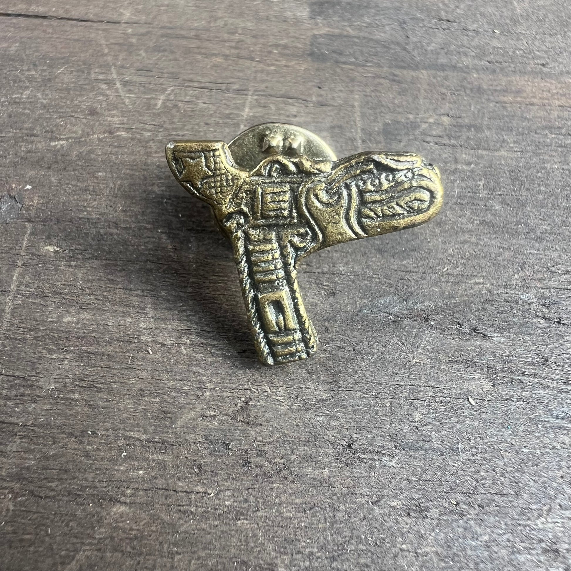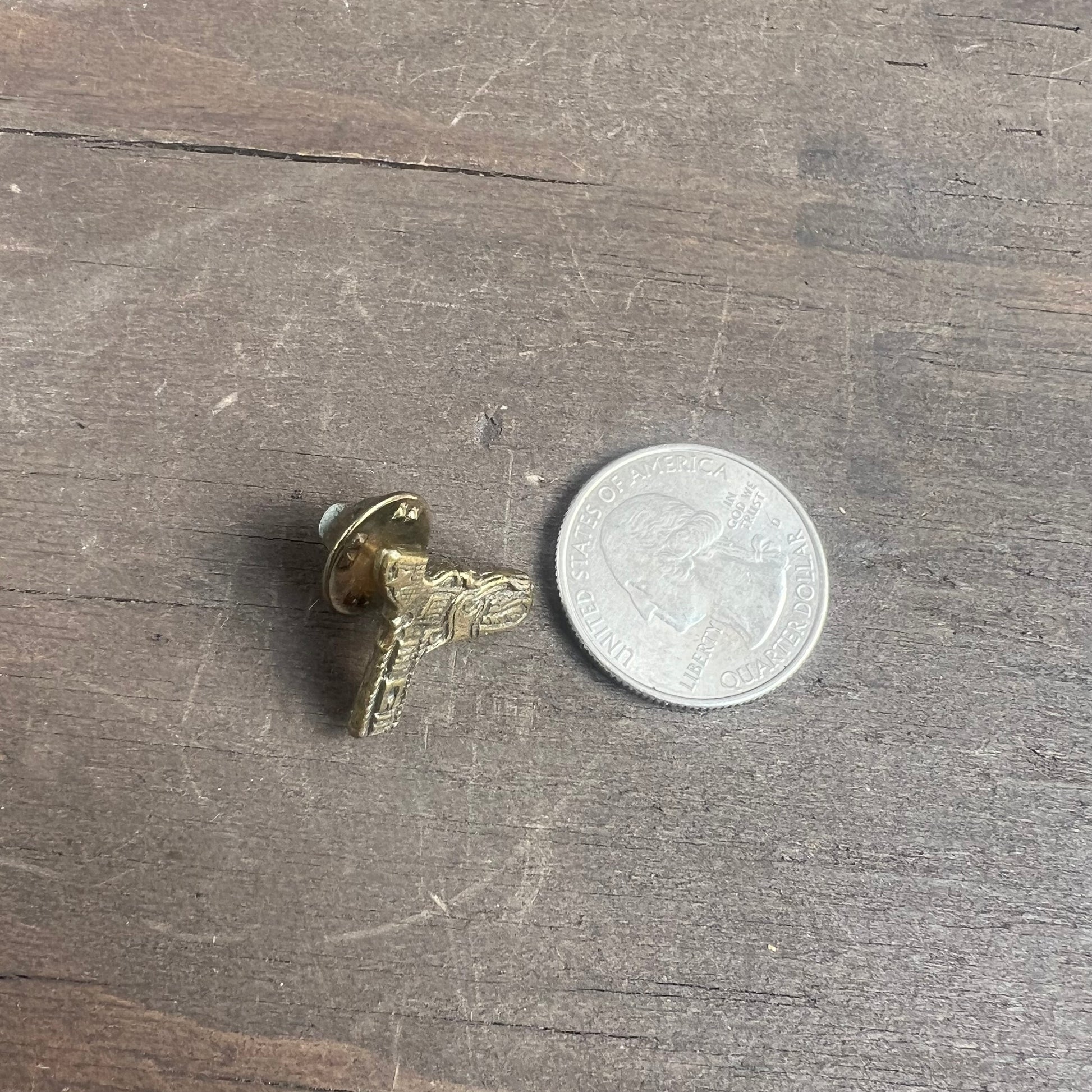 This pin is a miniature replica of a pistol with engraved details. It’s a subtle yet eye catching accessory, perfect for those with an appreciation for vintage weaponry, historical memorabilia, or unique accessories. In great condition. See image with quarter for scale.