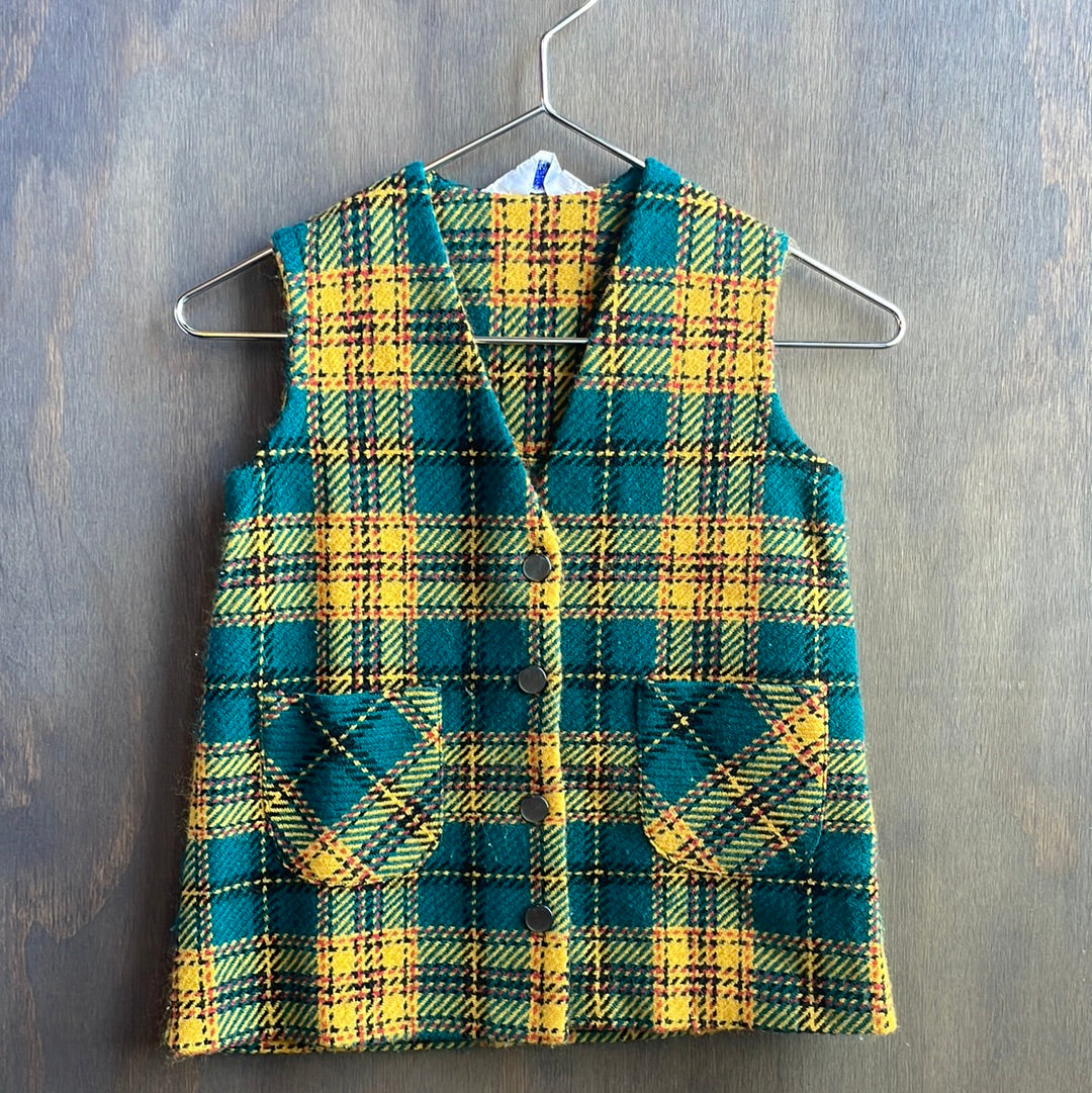 Adorable teal, yellow, red, and black kids vest. True vintage in great condition. Front pockets and pearlescent button closure. About 13” pit to pit. 100% acrylic.