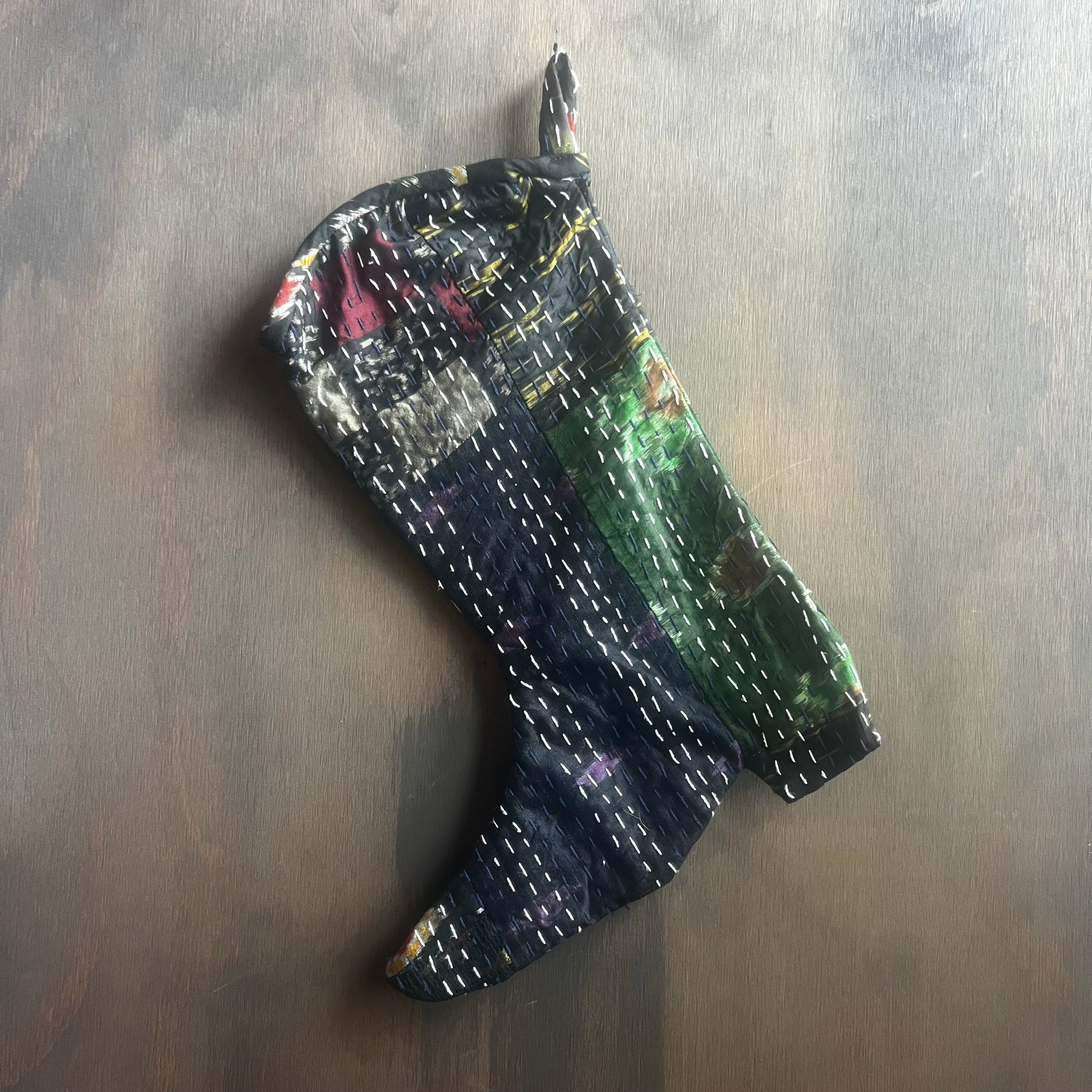 Handmade in Denver, CO from remnant beautiful multi-colored quilt with lines of white stitching. Shaped like a cowboy boot.