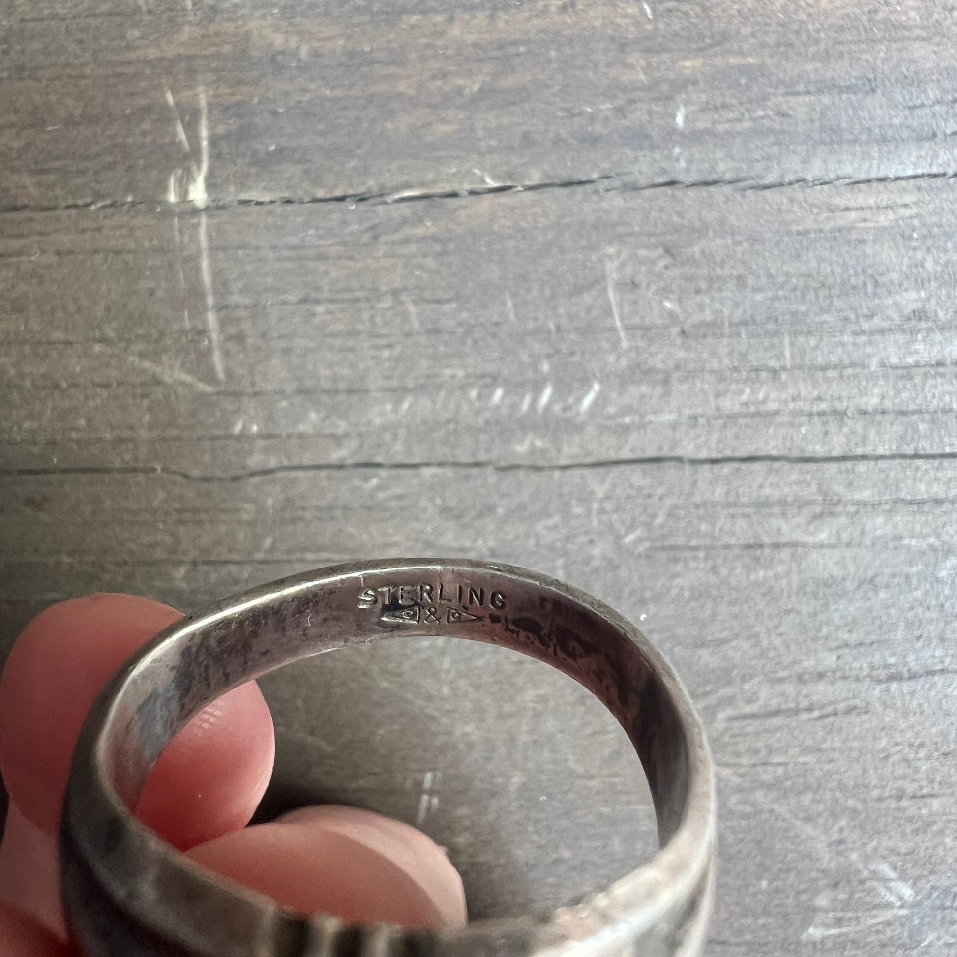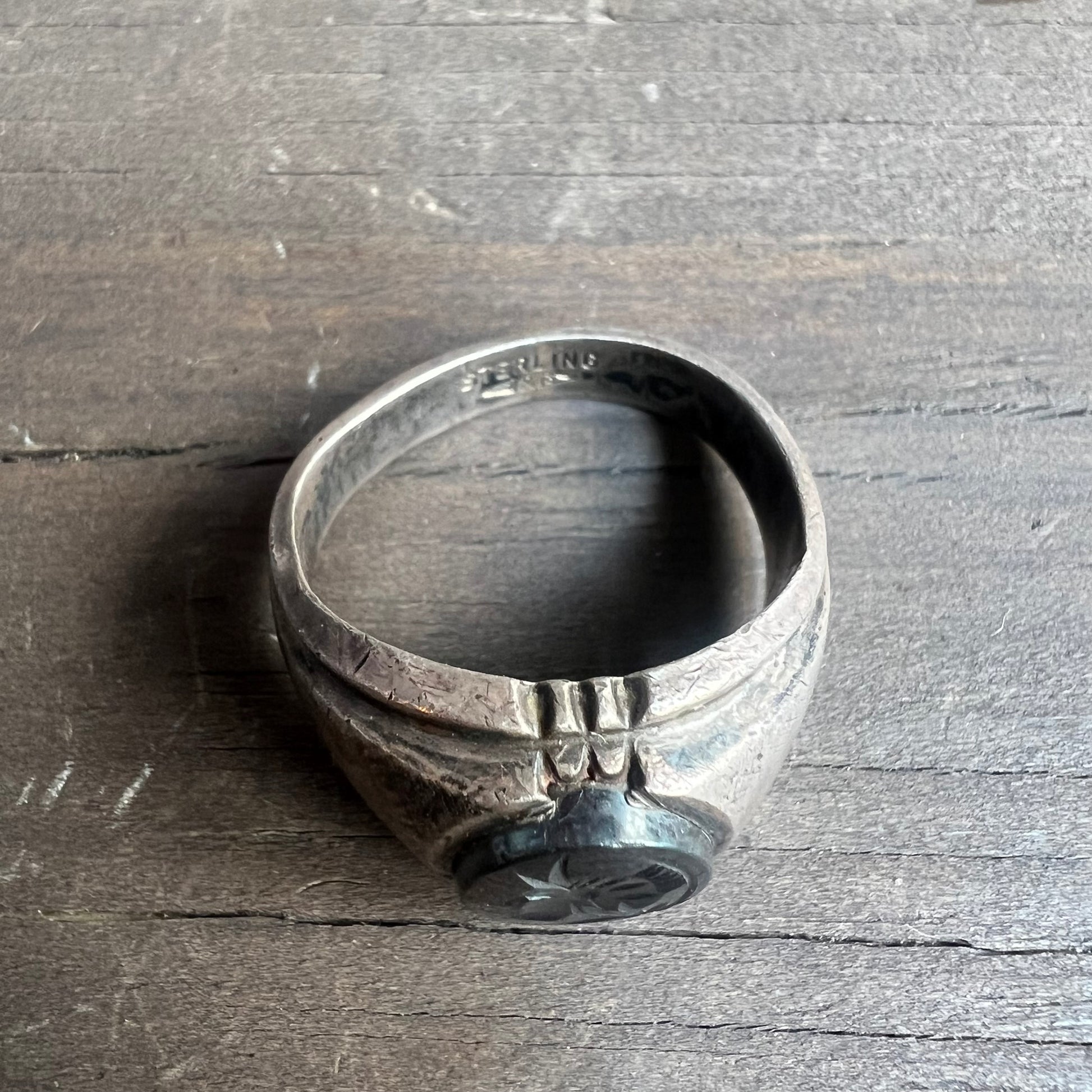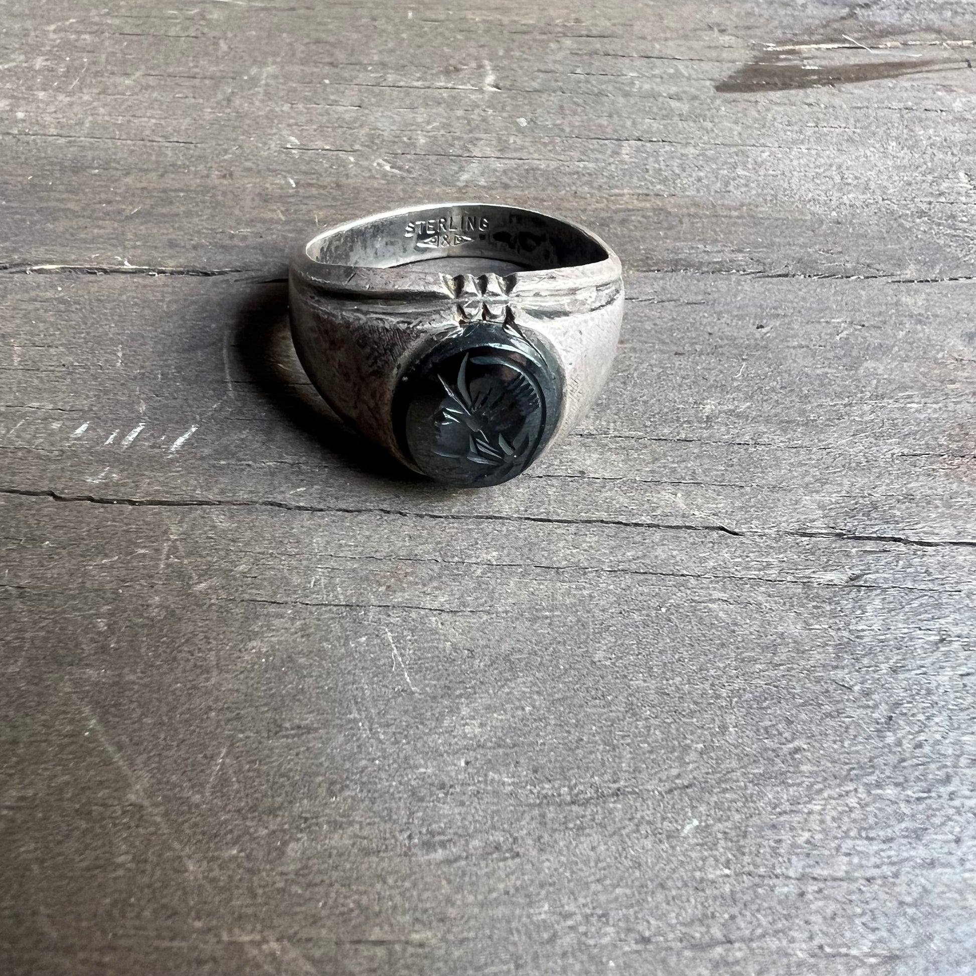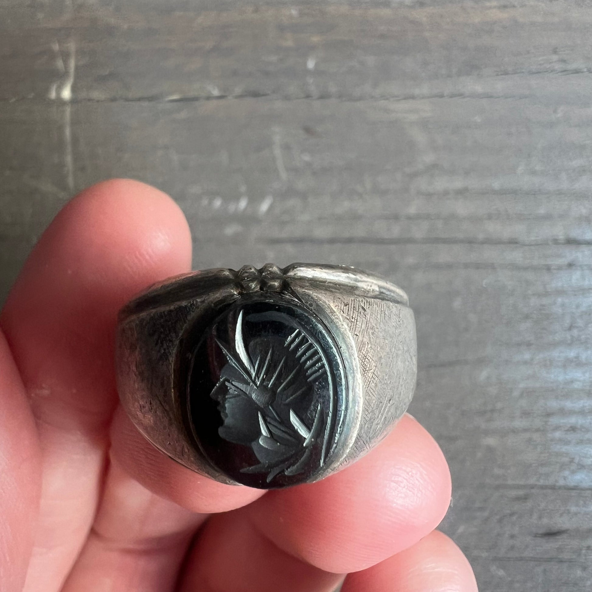 Beautiful chunky vintage ring made from marked sterling silver. The ring has a hematite stone that has a carved portrait of a side profile with floral events surrounding it. In great condition. Size 10.