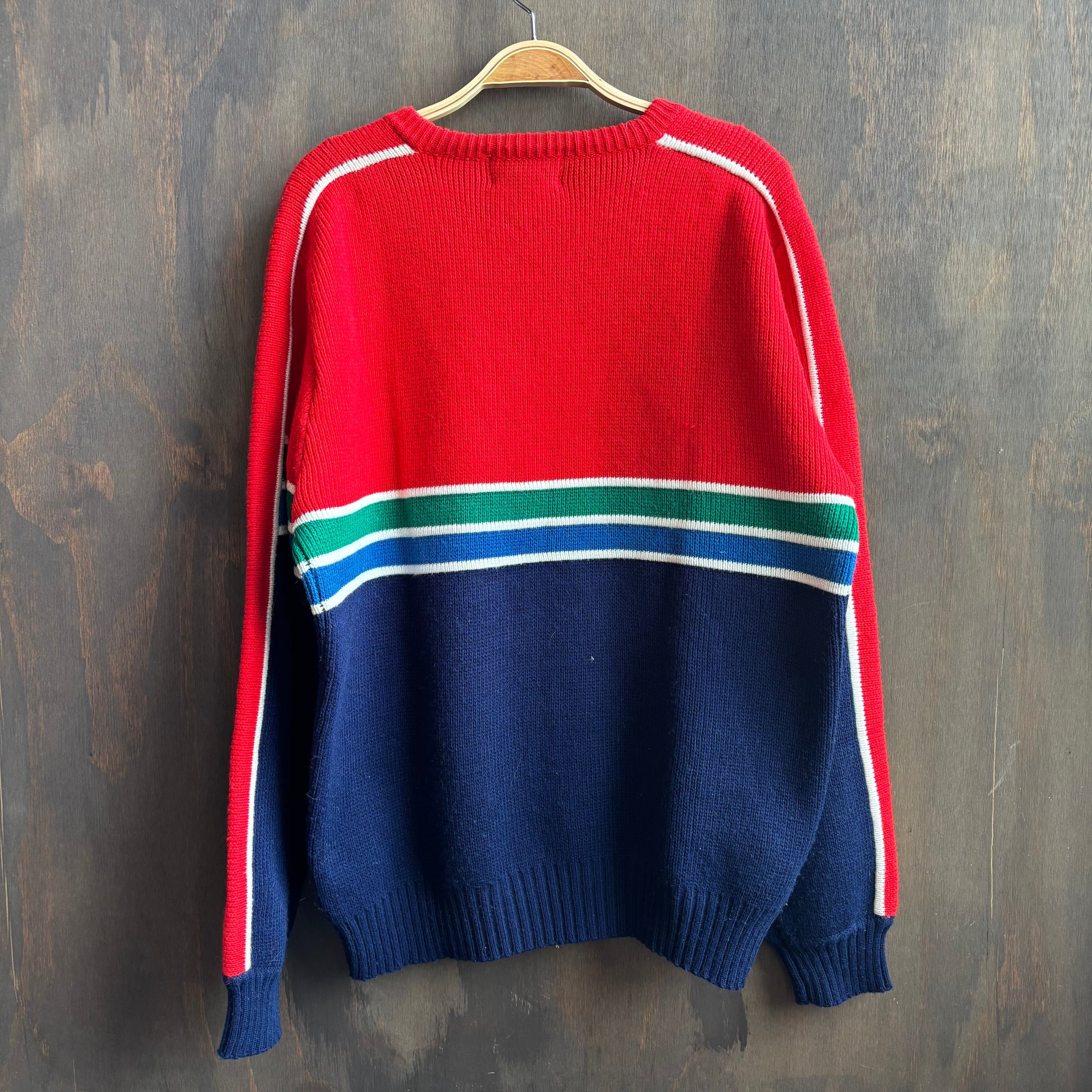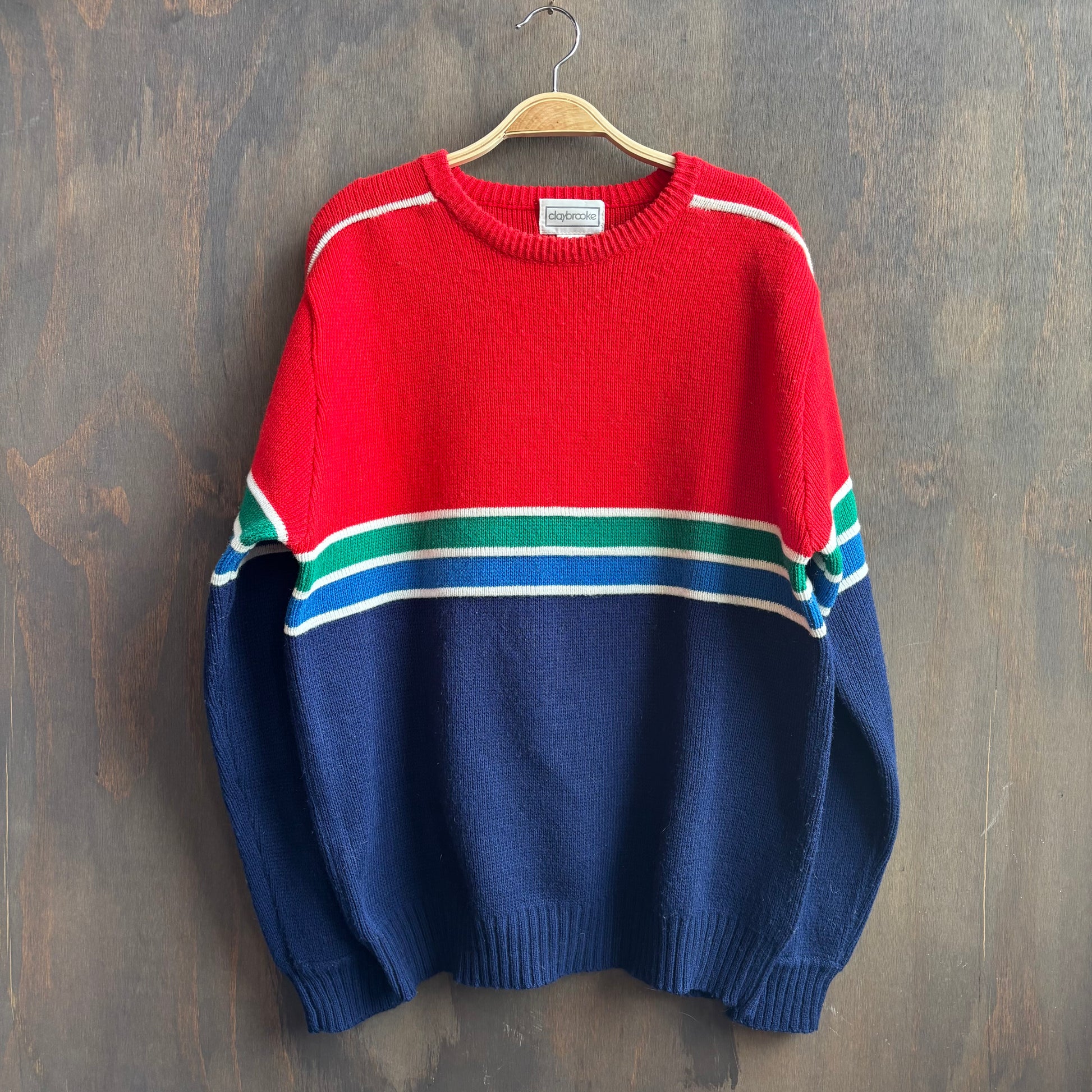 Great looking vintage Claybrooke striped ski sweater with red, navy blue, green and blue, size XL in good condition, likely 1980s.