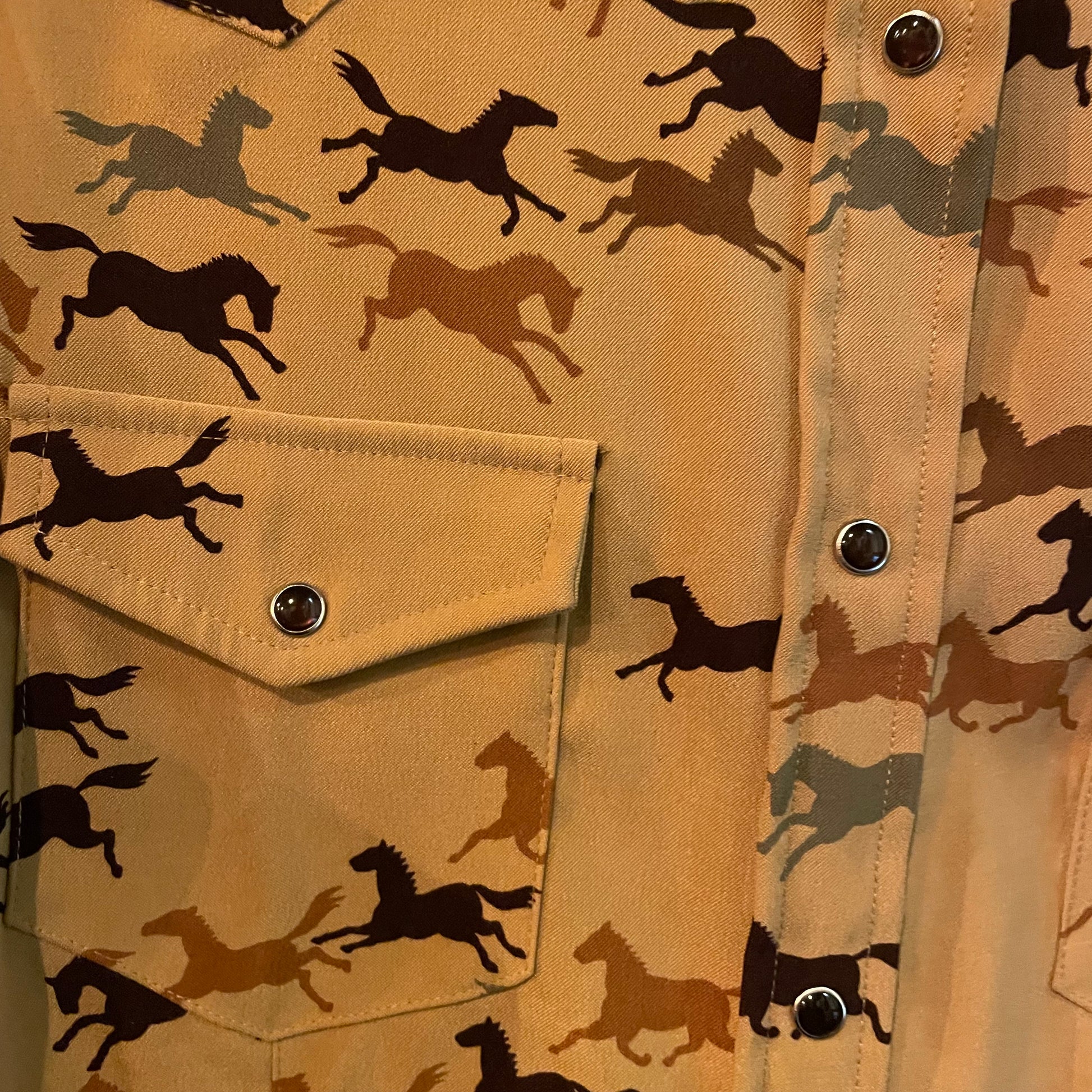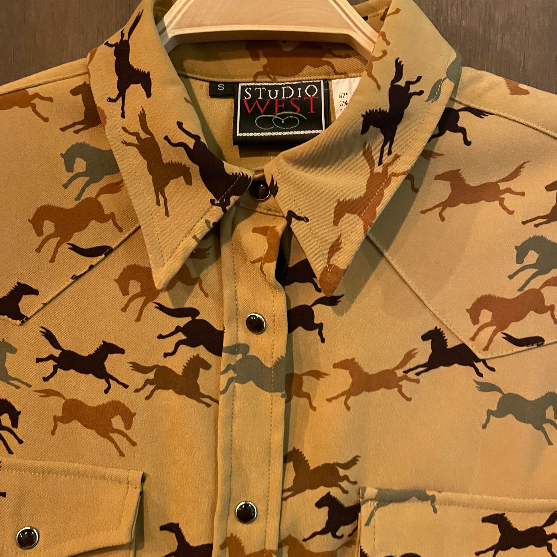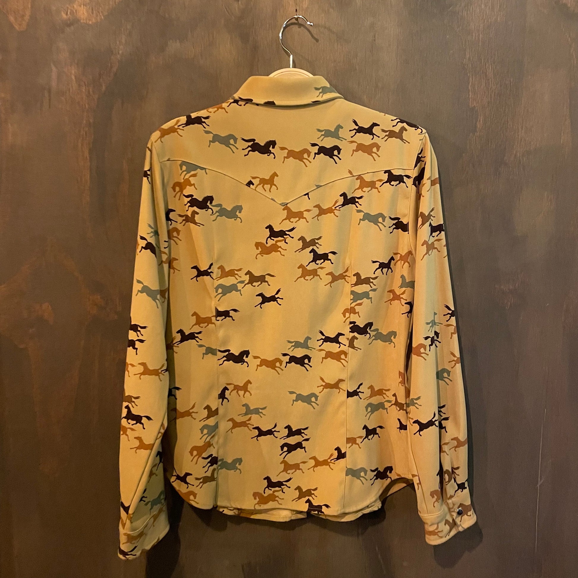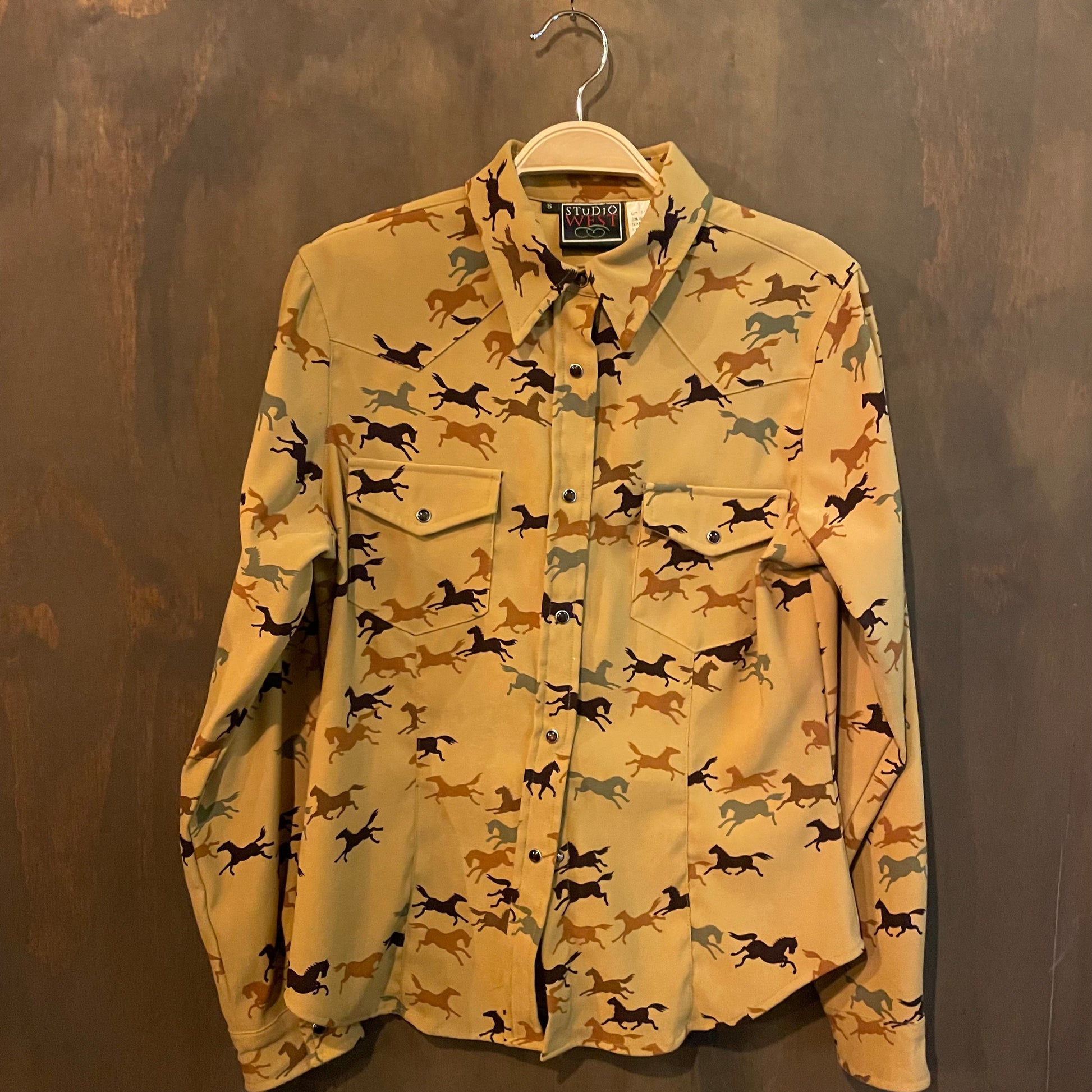 Super fun horse patterned pearl snap by studio west, women’s small.