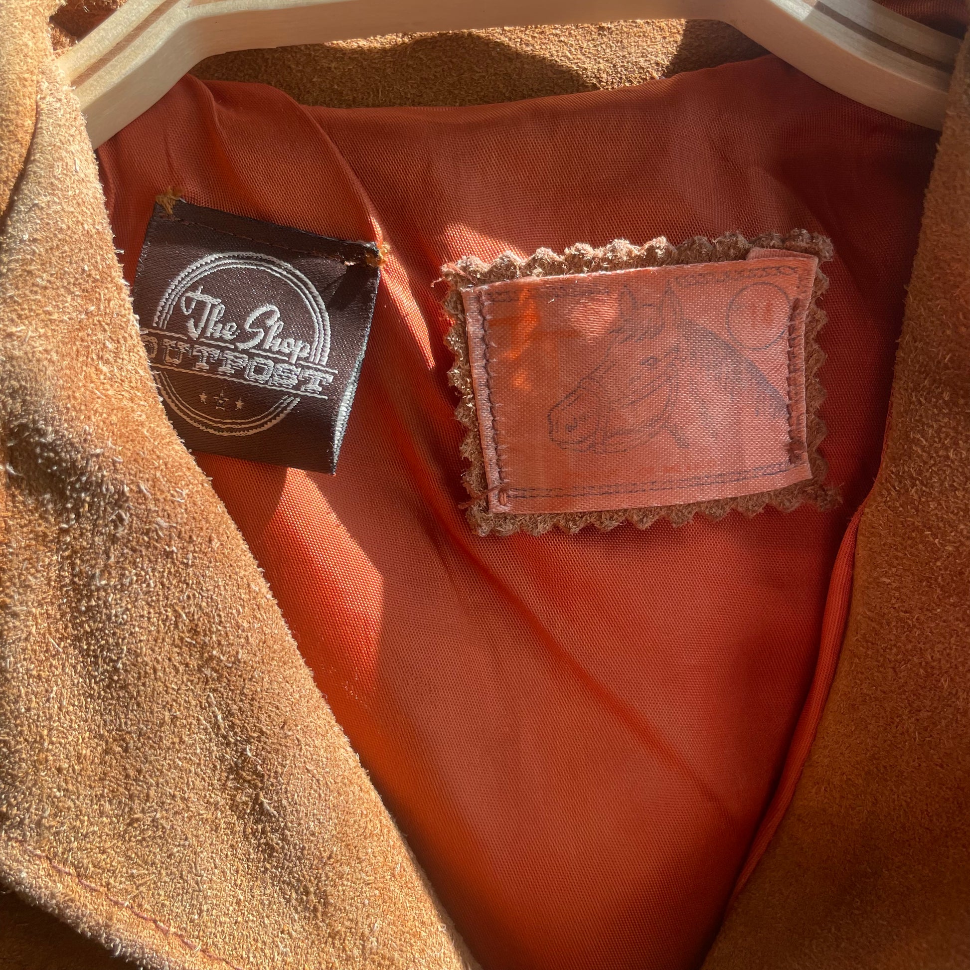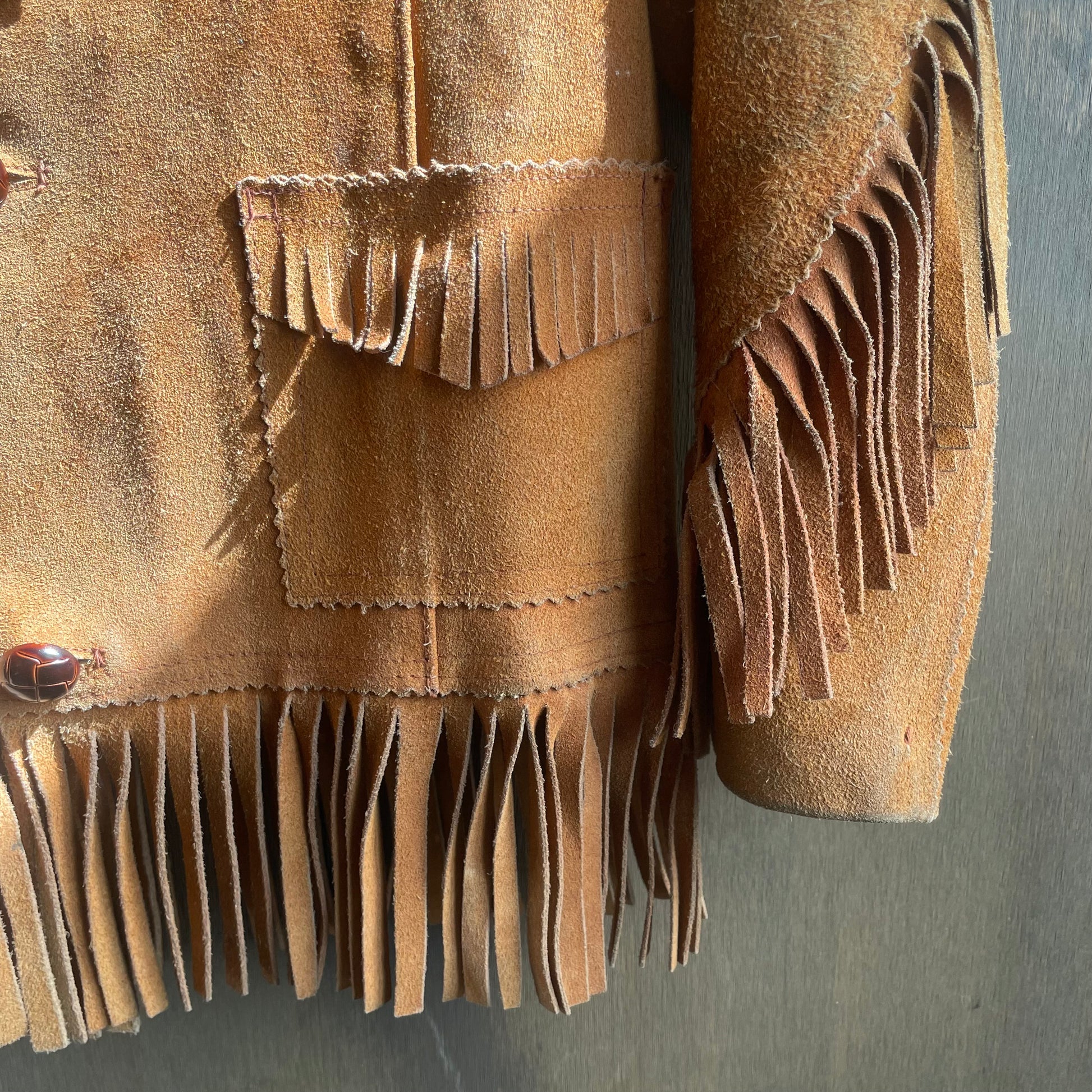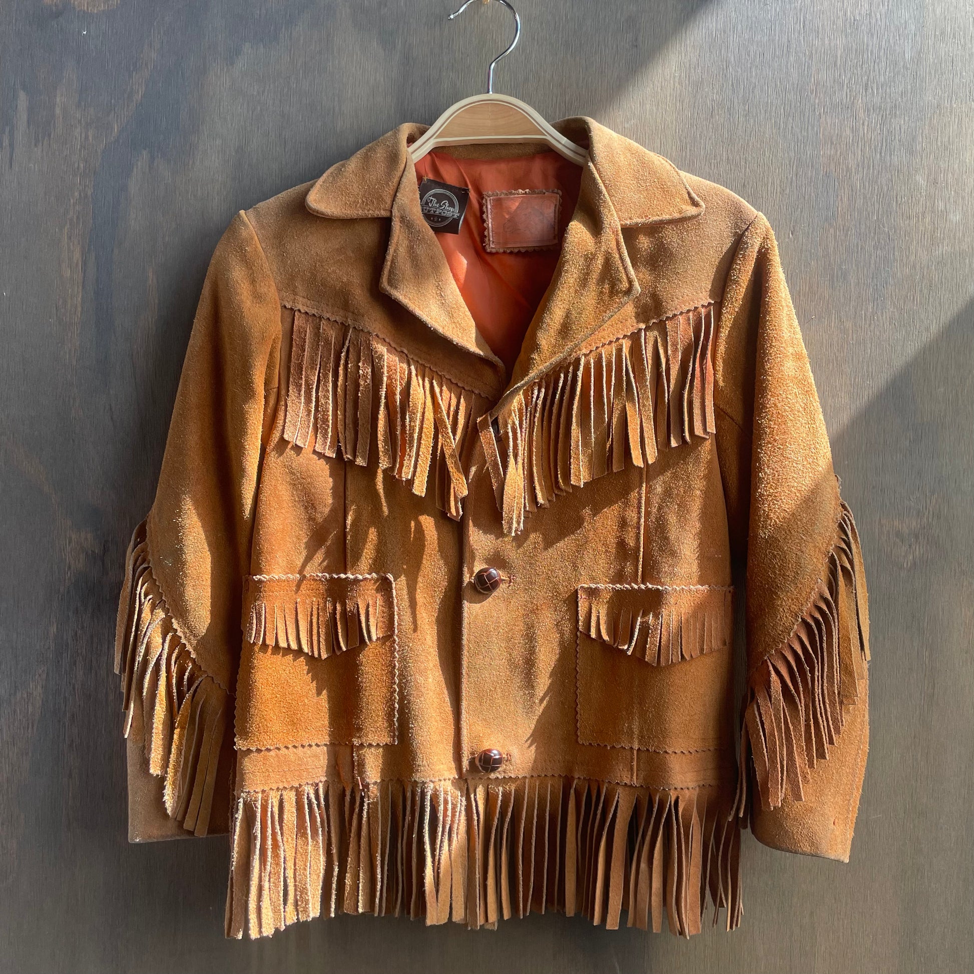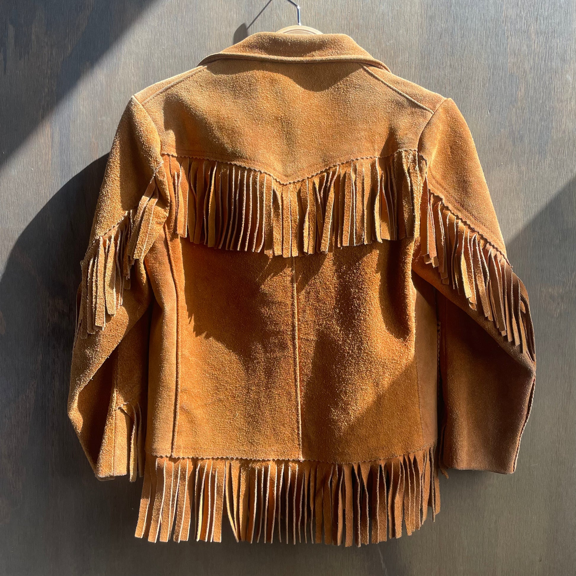 Get your mini-me ready for the Wild West with our true vintage, caramel suede fringe kids jacket! Crafted from soft suede, this jacket features a playful fringe trim. Perfect for any budding cowboy or cowgirl No size tag, measures like a kids size 9/10: 16.5" flat, pit to pit!