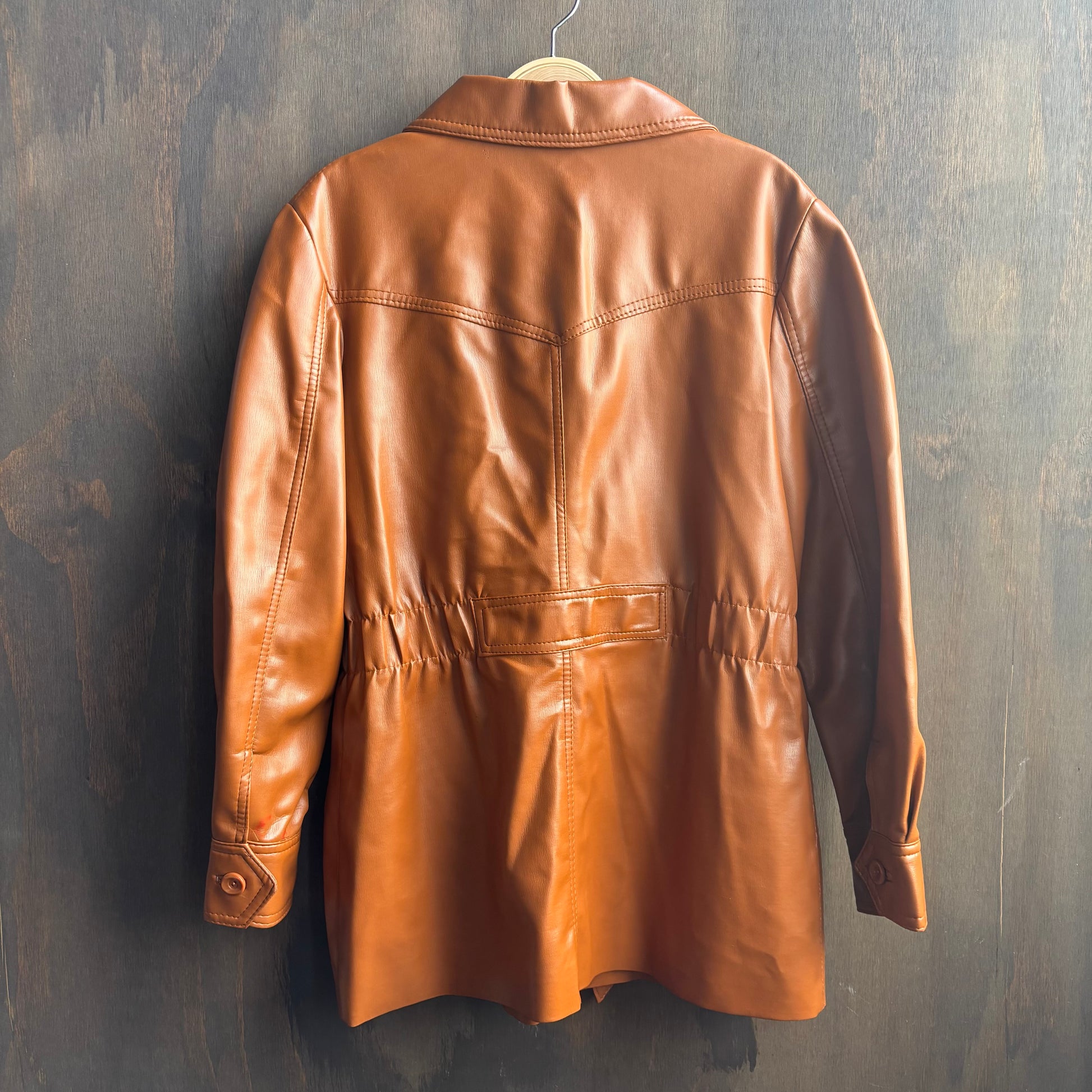 Great looking vintage tan safari jacket in faux leather with belt and four pockets, missing right breast pocket button and has small red marks on cuff - see photos - otherwise good condition, marked 13 /14 but fits like a L