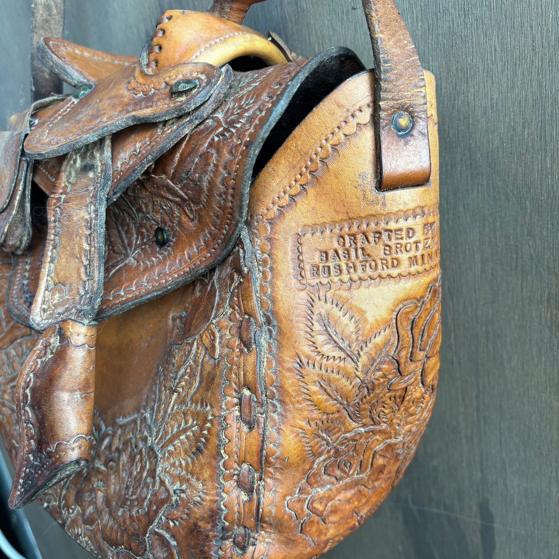 Stunning and authentic vintage tooled leather saddle bag featuring a real horse saddle on top of the bag, crafted by Basil Brotzman in Rushford, Minnesota, stamped with maker information, absolutely stunning!