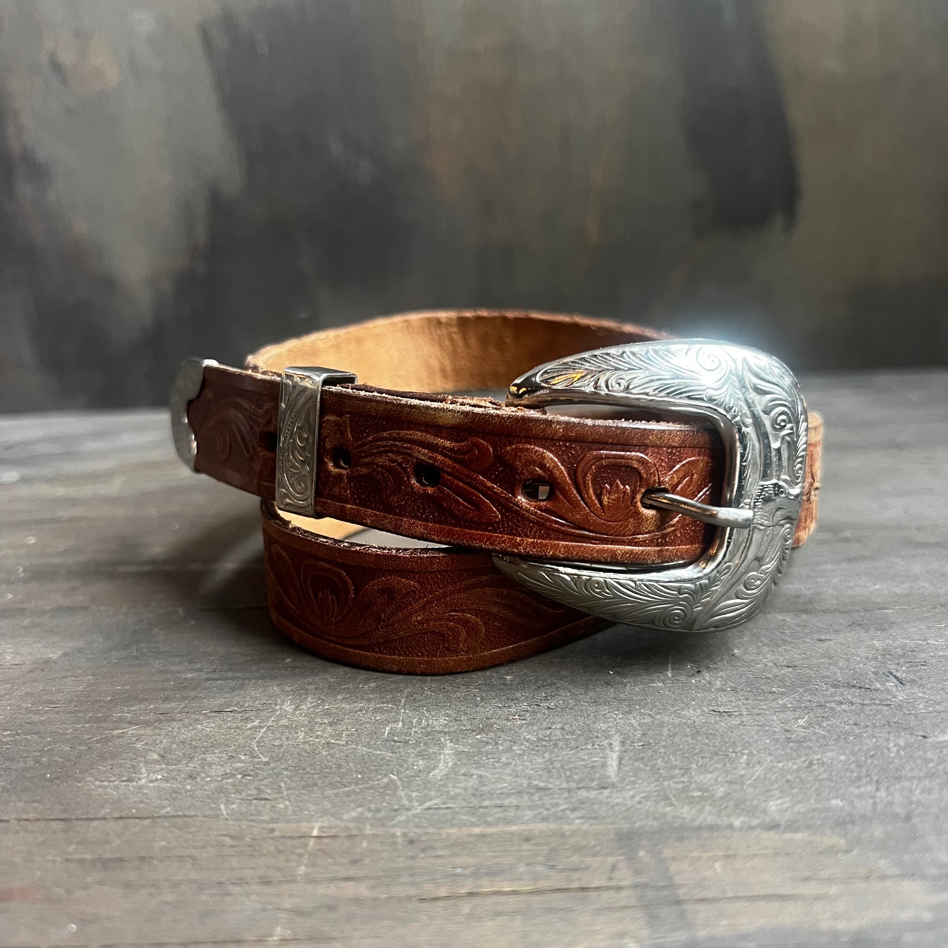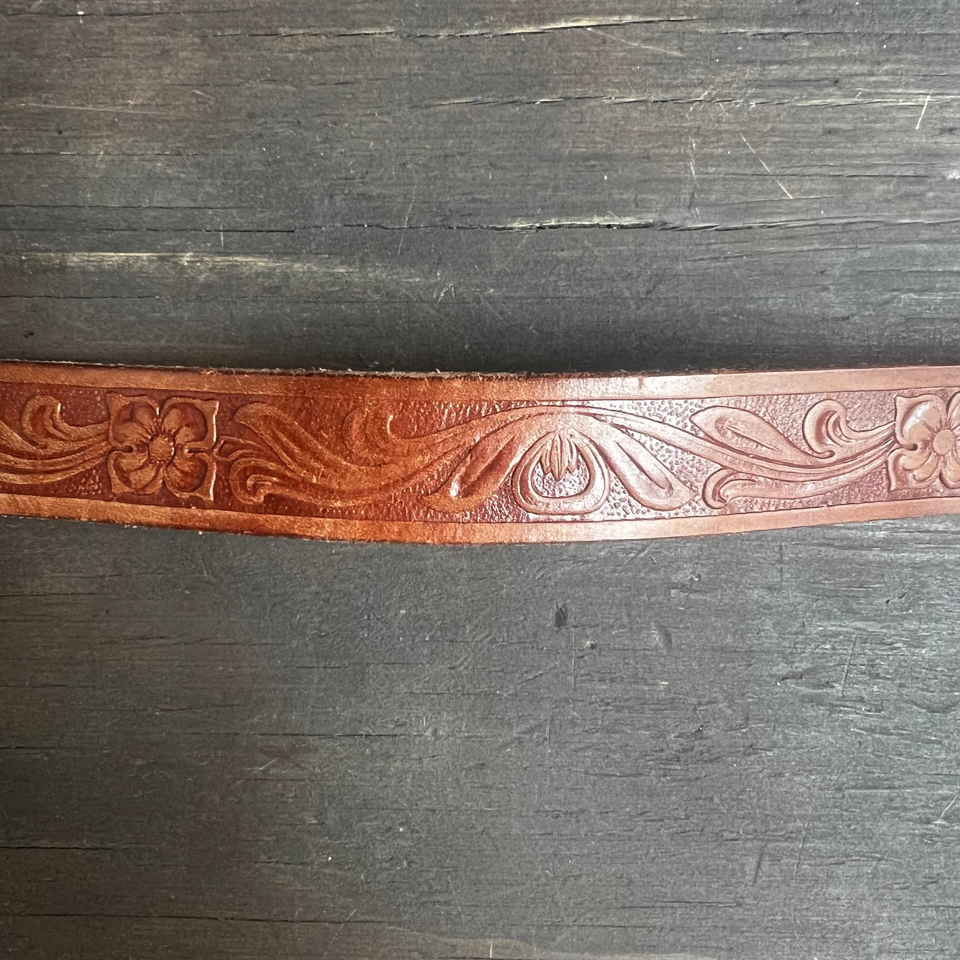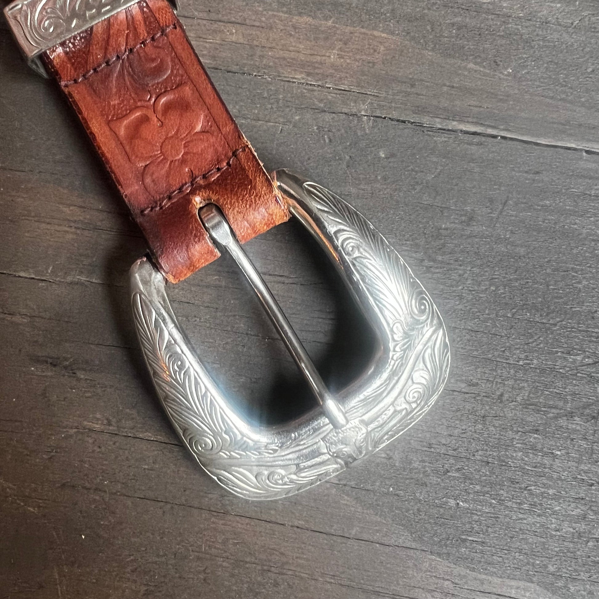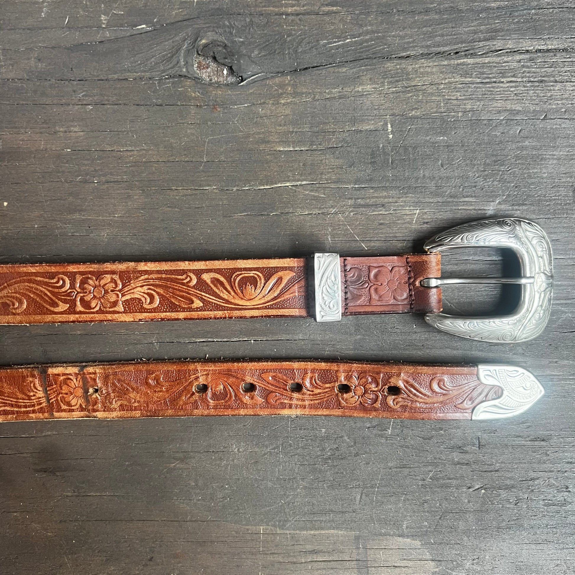 Gorgeous tooled leather belt with floral patterns. Silver colored belt buckle has a carved longhorn. In great condition, fits a 30-32” waist (size M).
