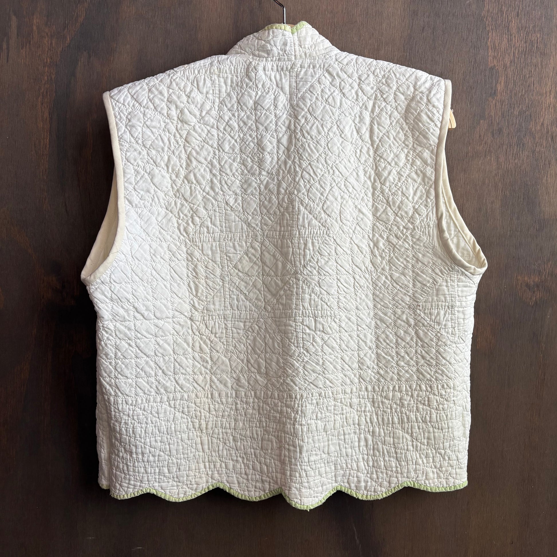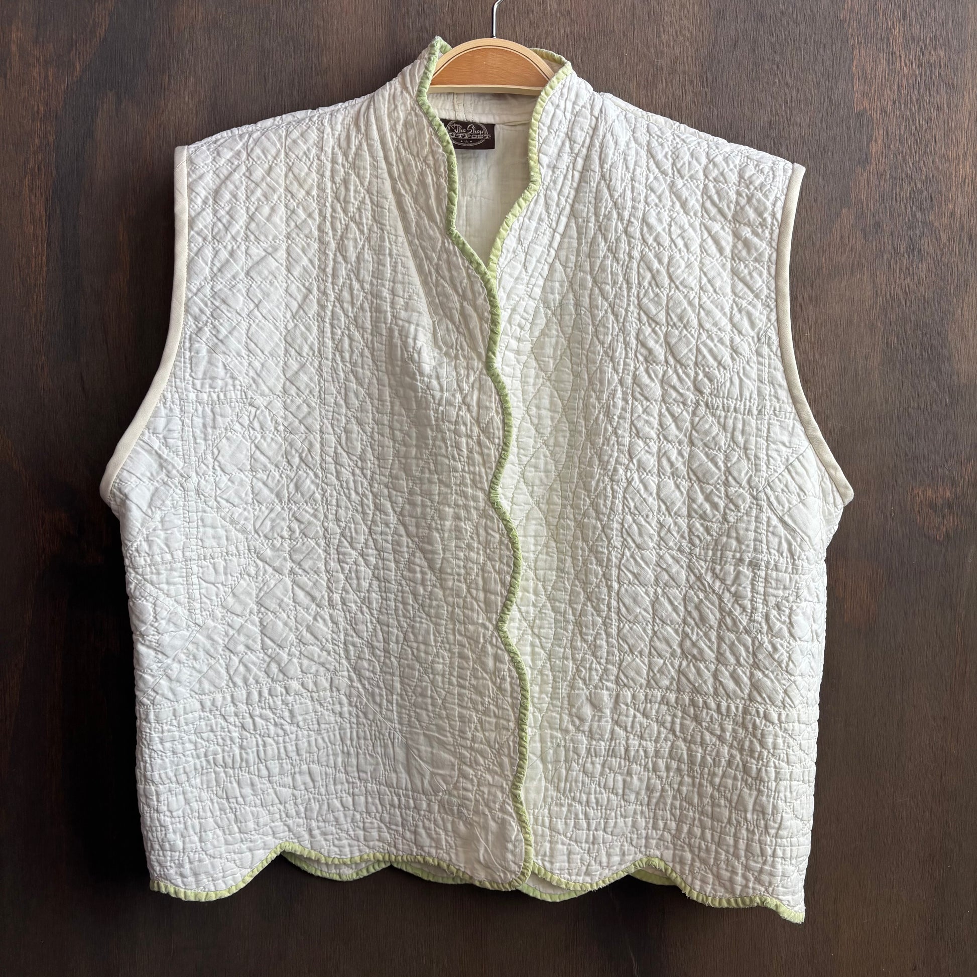 Handmade vintage white quilt vest with green trim, a beautiful neutral addition to any outfit.