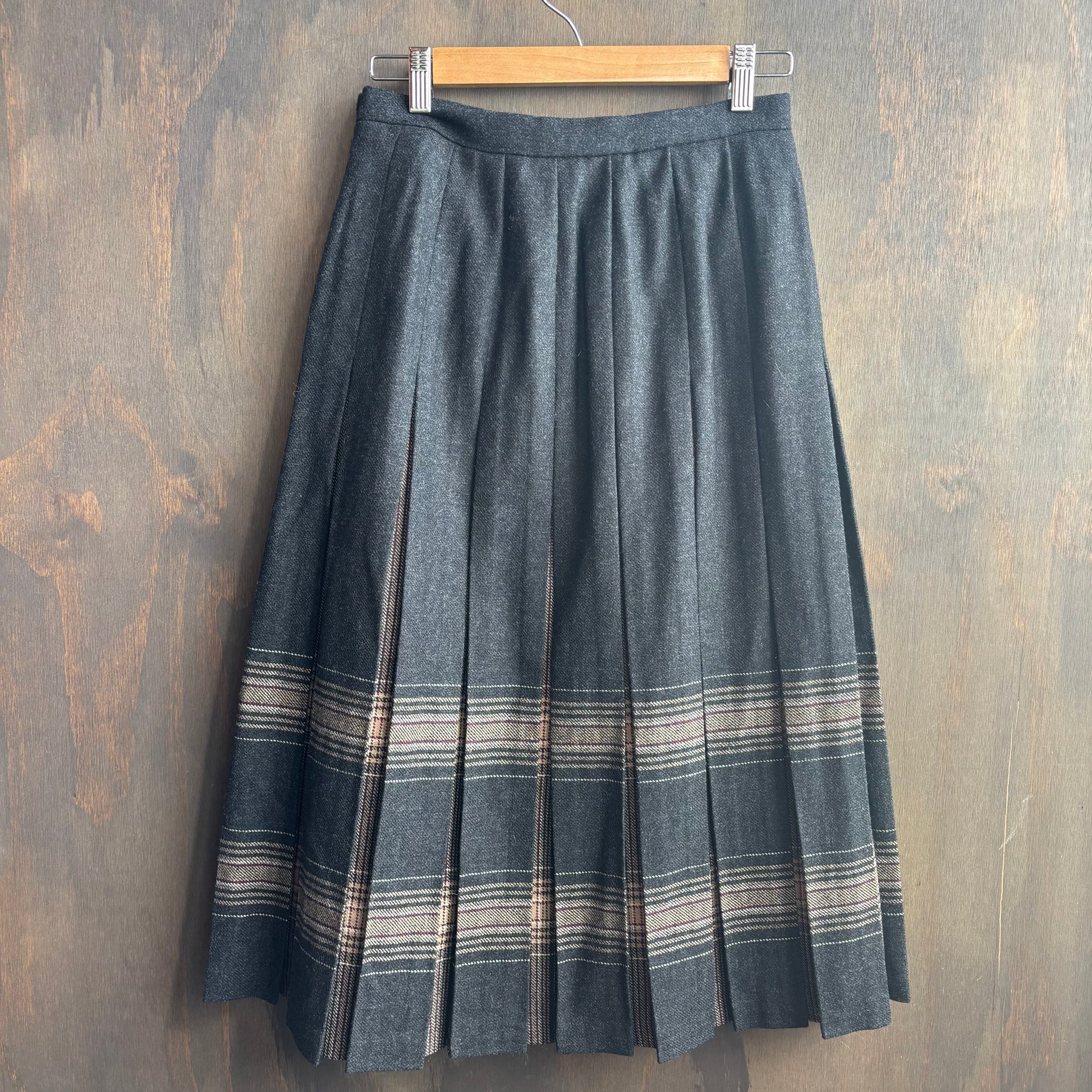 Pretty and classic vintage wool pleated skirt, charcoal grey with beige plaid details, vintage size 12 fits like a size L