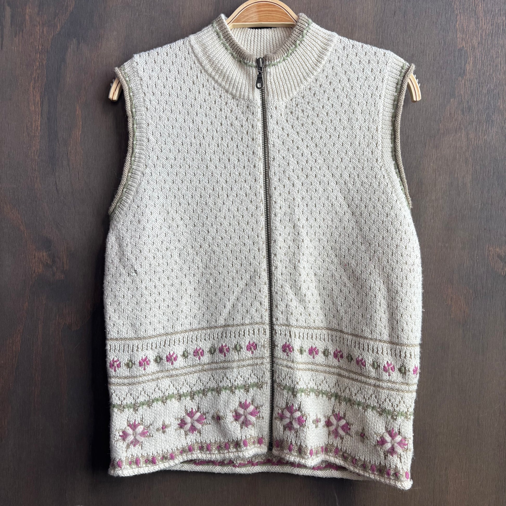 Adorable vintage Woolrich cream sweater vest with pink and green details and full zip, size L