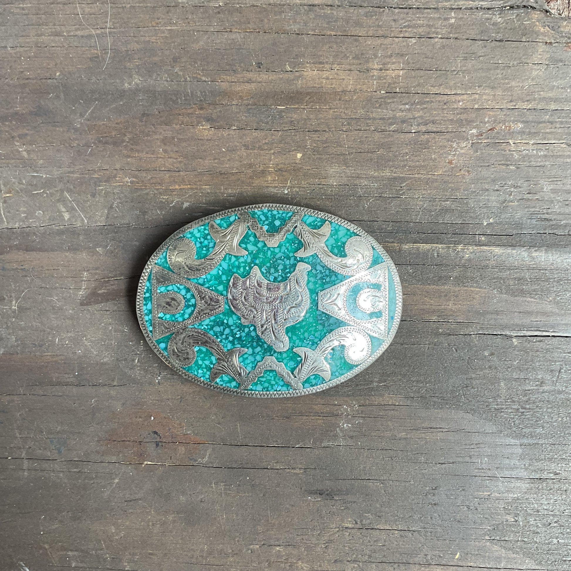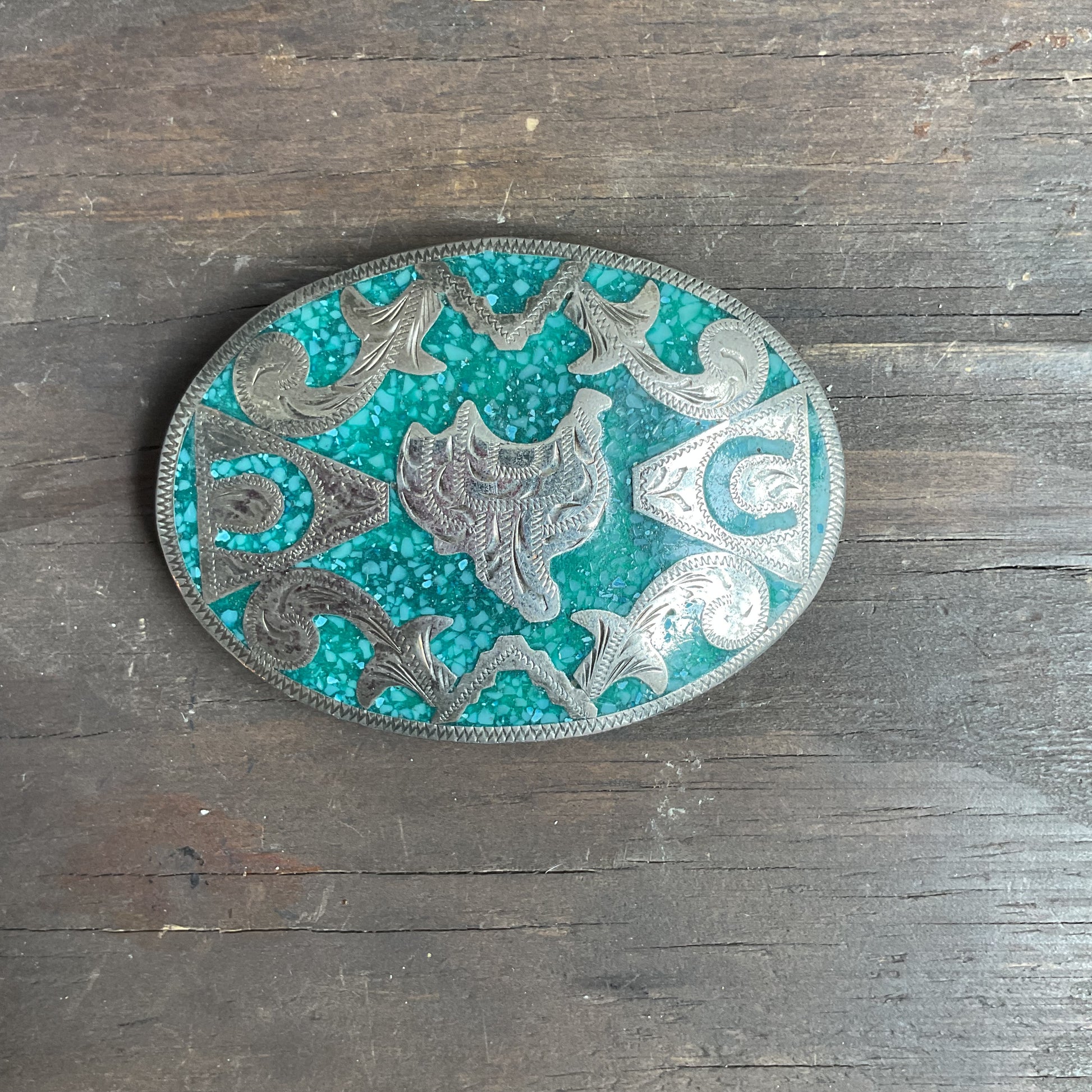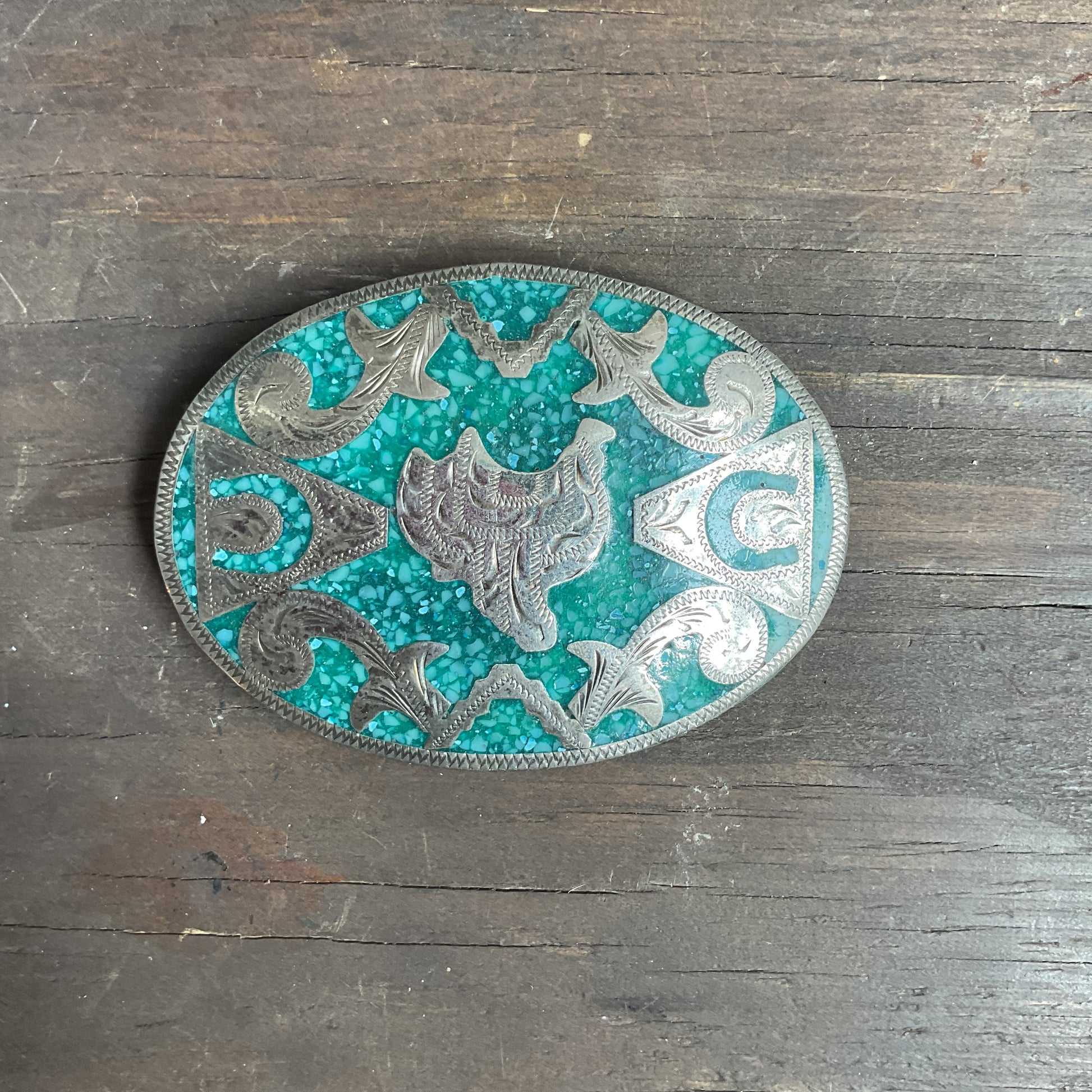 Pretty belt buckle with saddles and horseshoes on a turquoise chip backing. In excellent condition, 4" across.