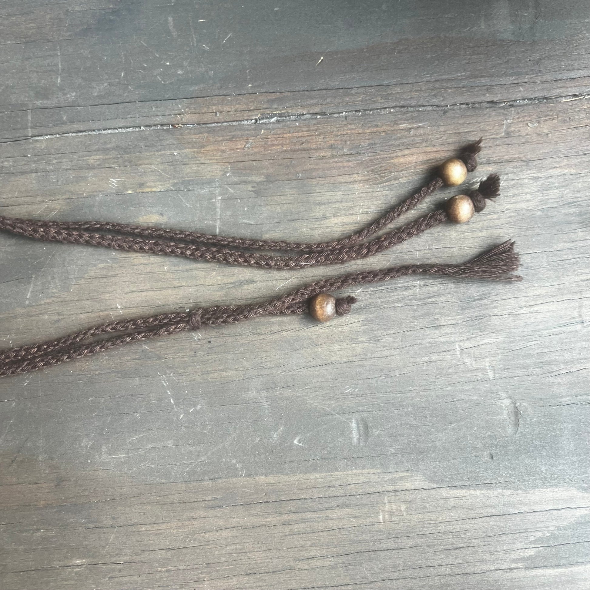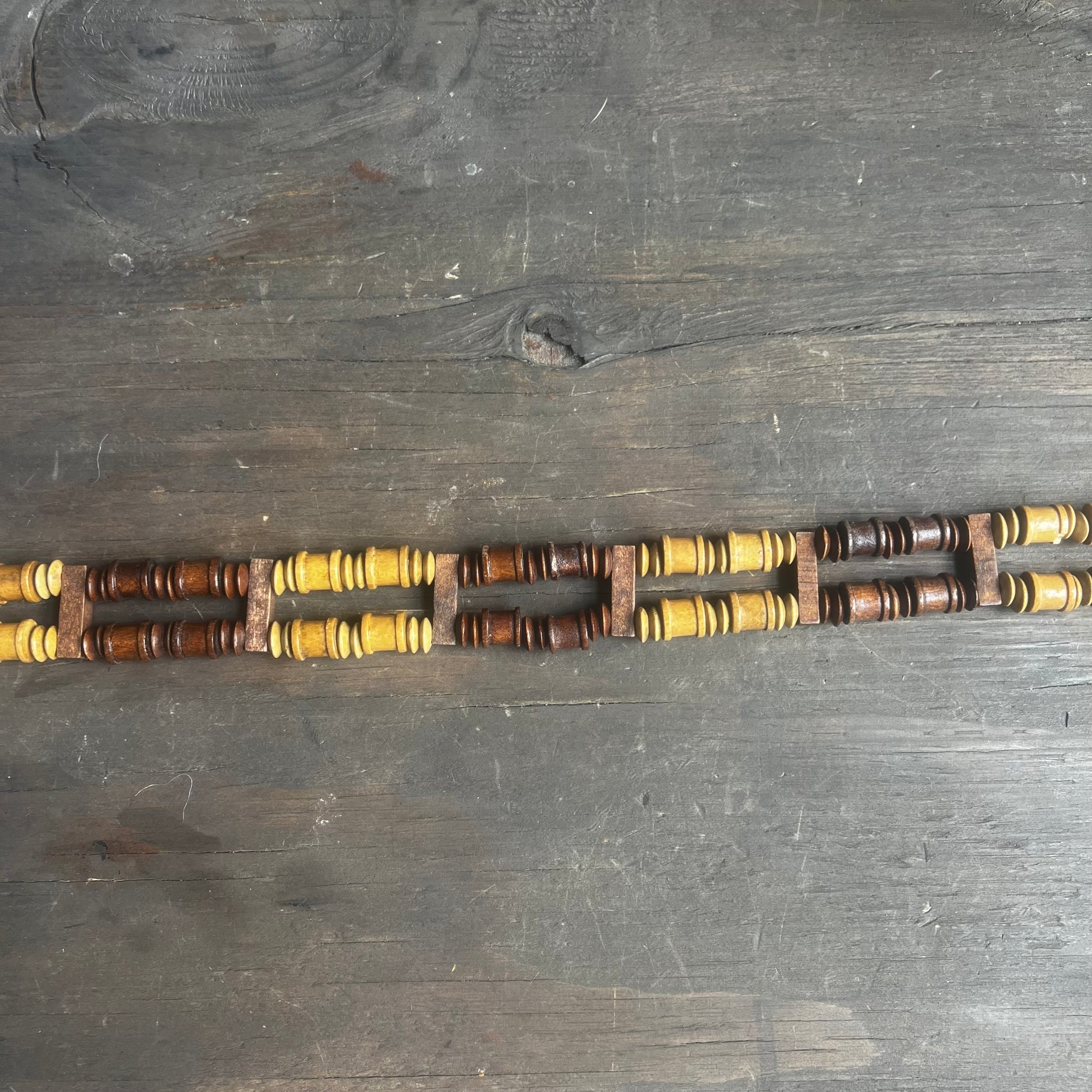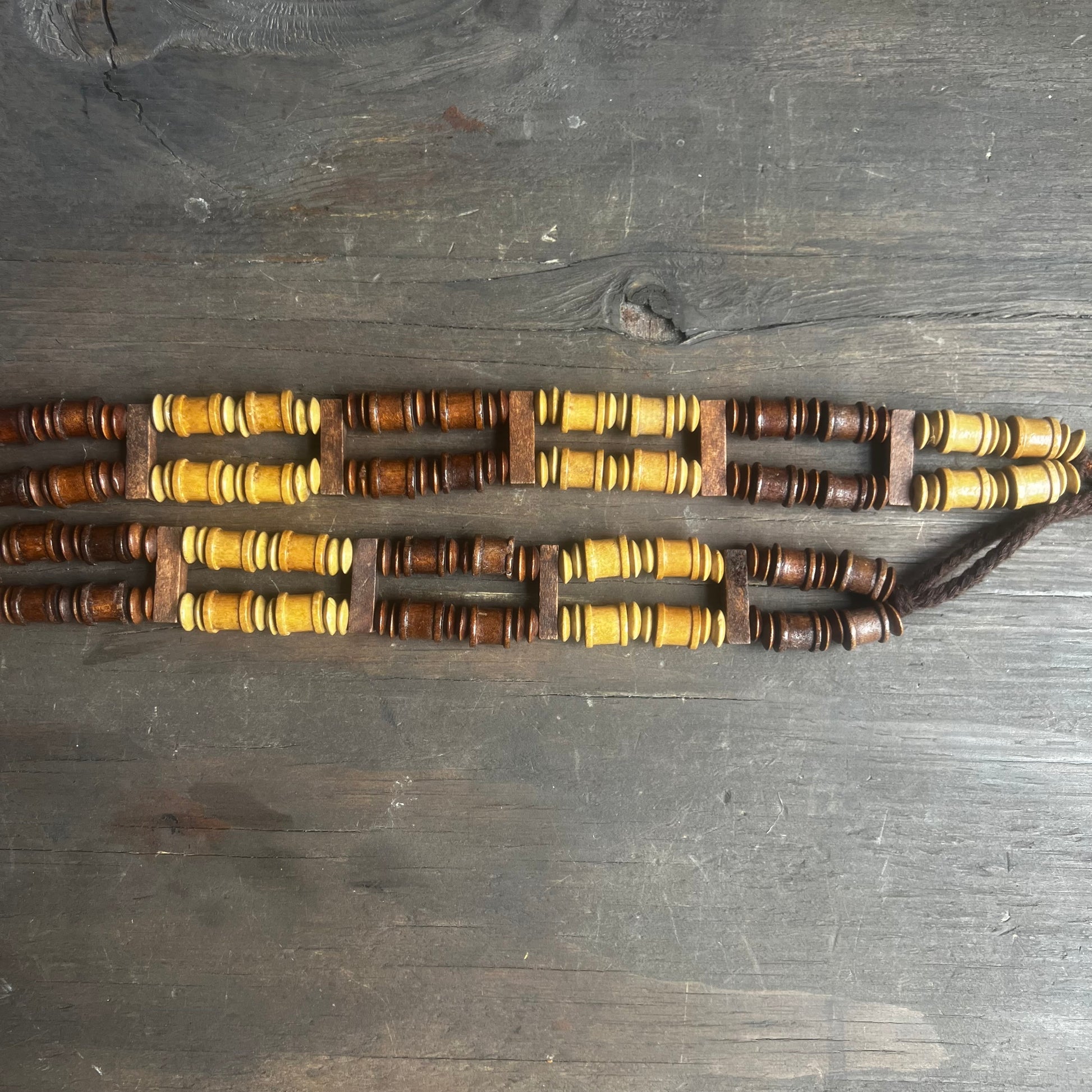 Pretty belt made from wood beads. Belt can be fastened by tying the cotton cords. Measures to about 3’, sizing is flexible/fits all.