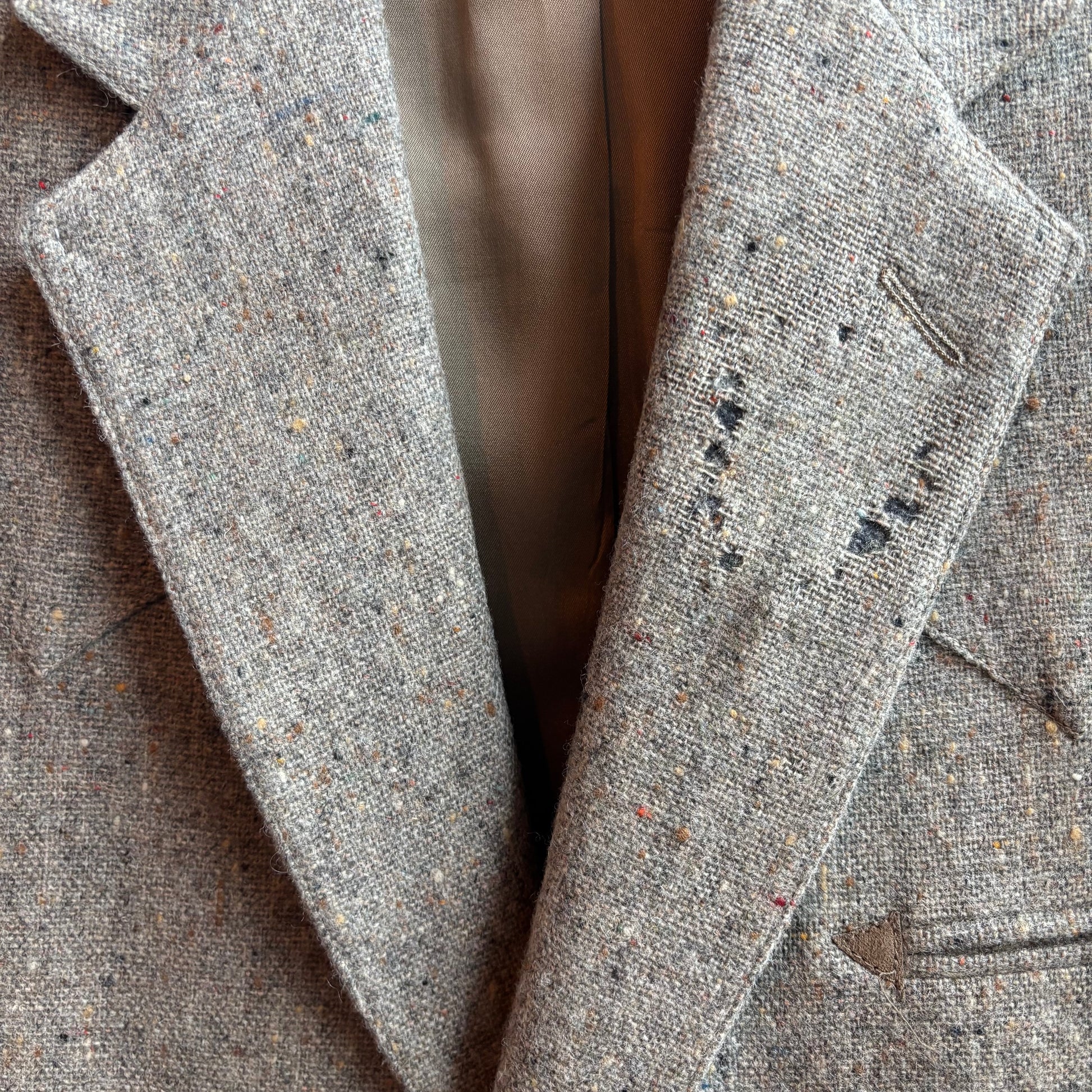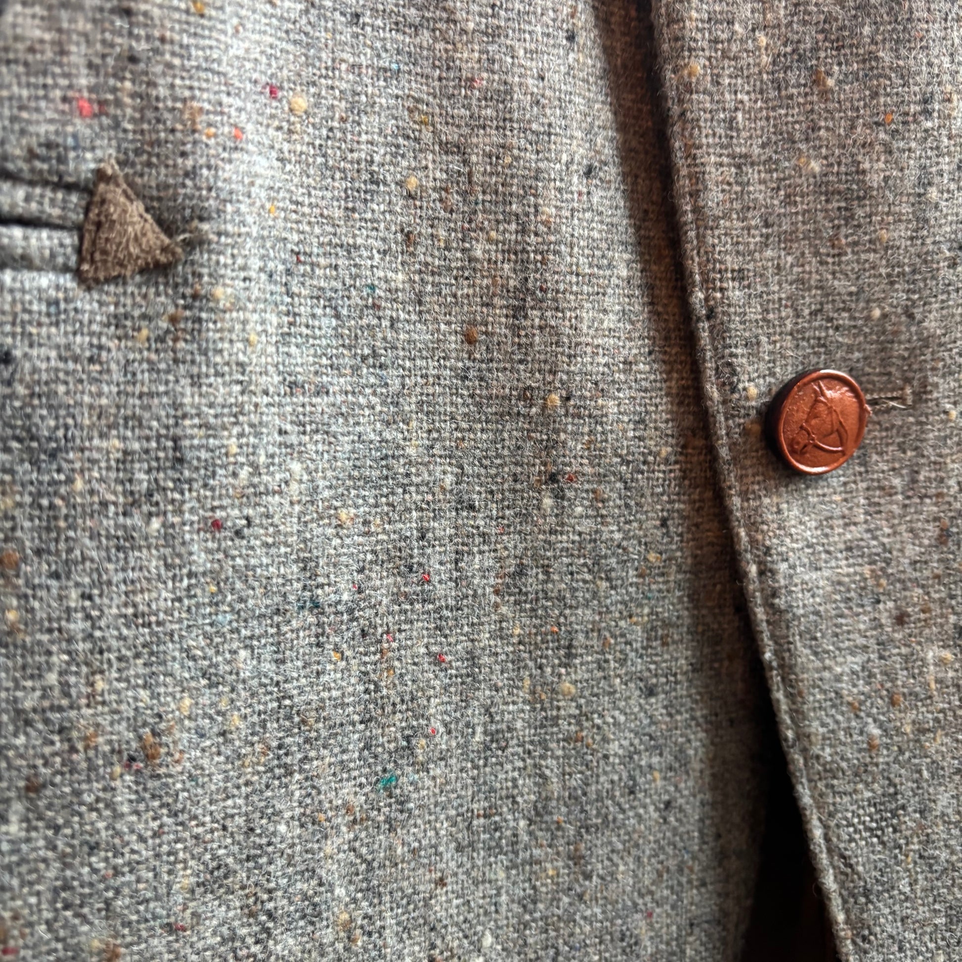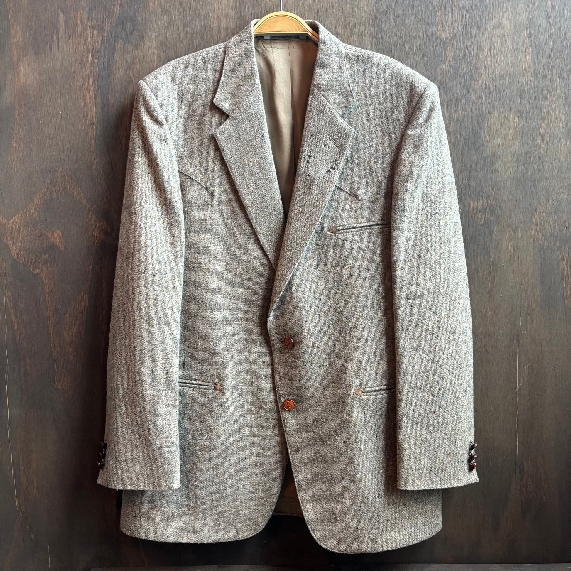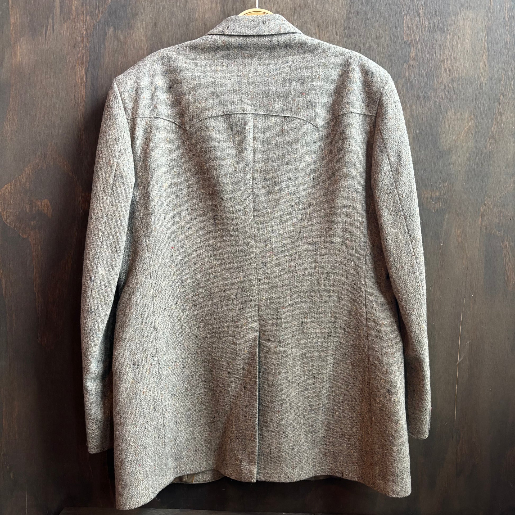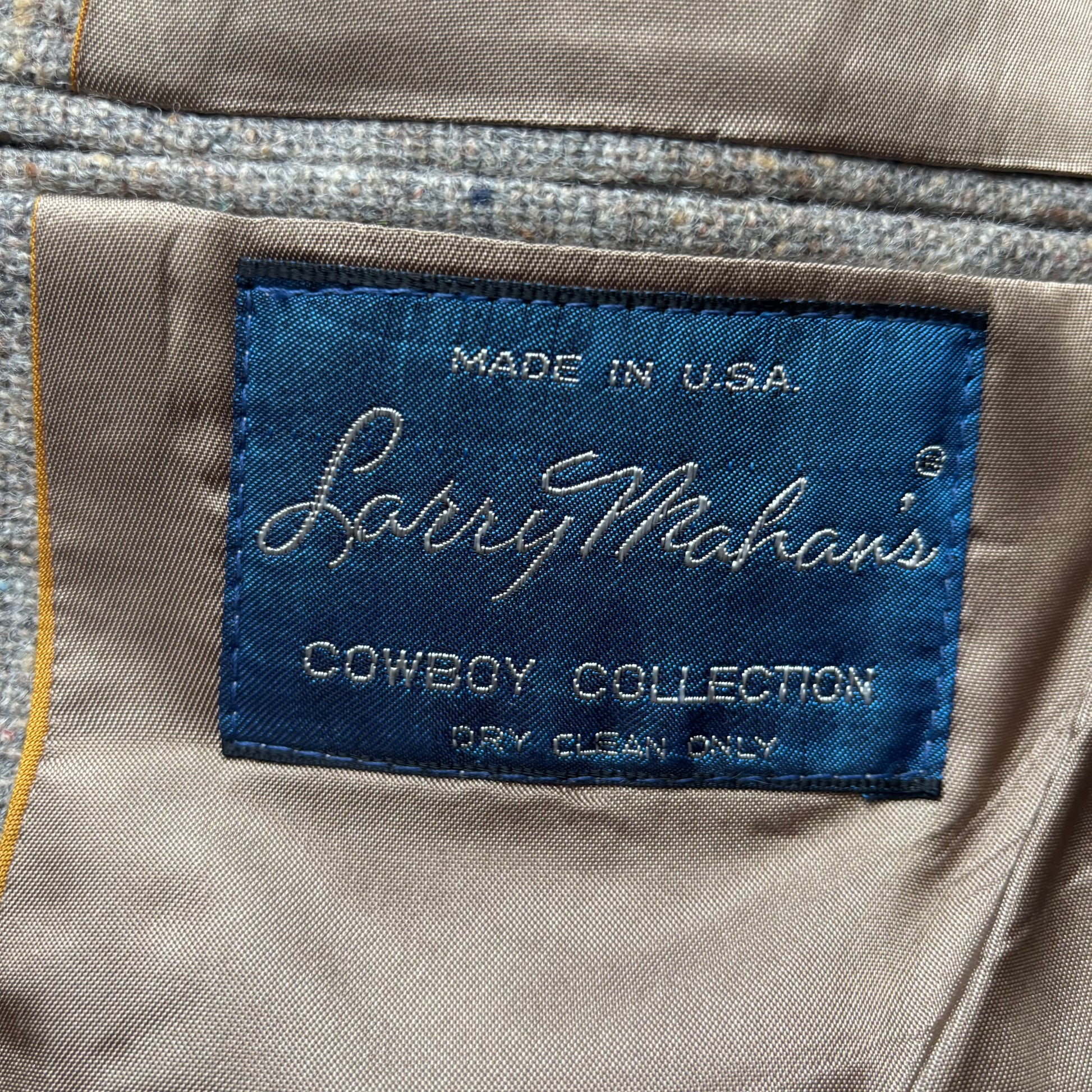 Great looking Larry Mahan Cowboy Collection vintage tweed jacket with Western pocket details, yoke and wooden horse bust buttons, size 42L, damage to lapel - see picture, priced as is.
