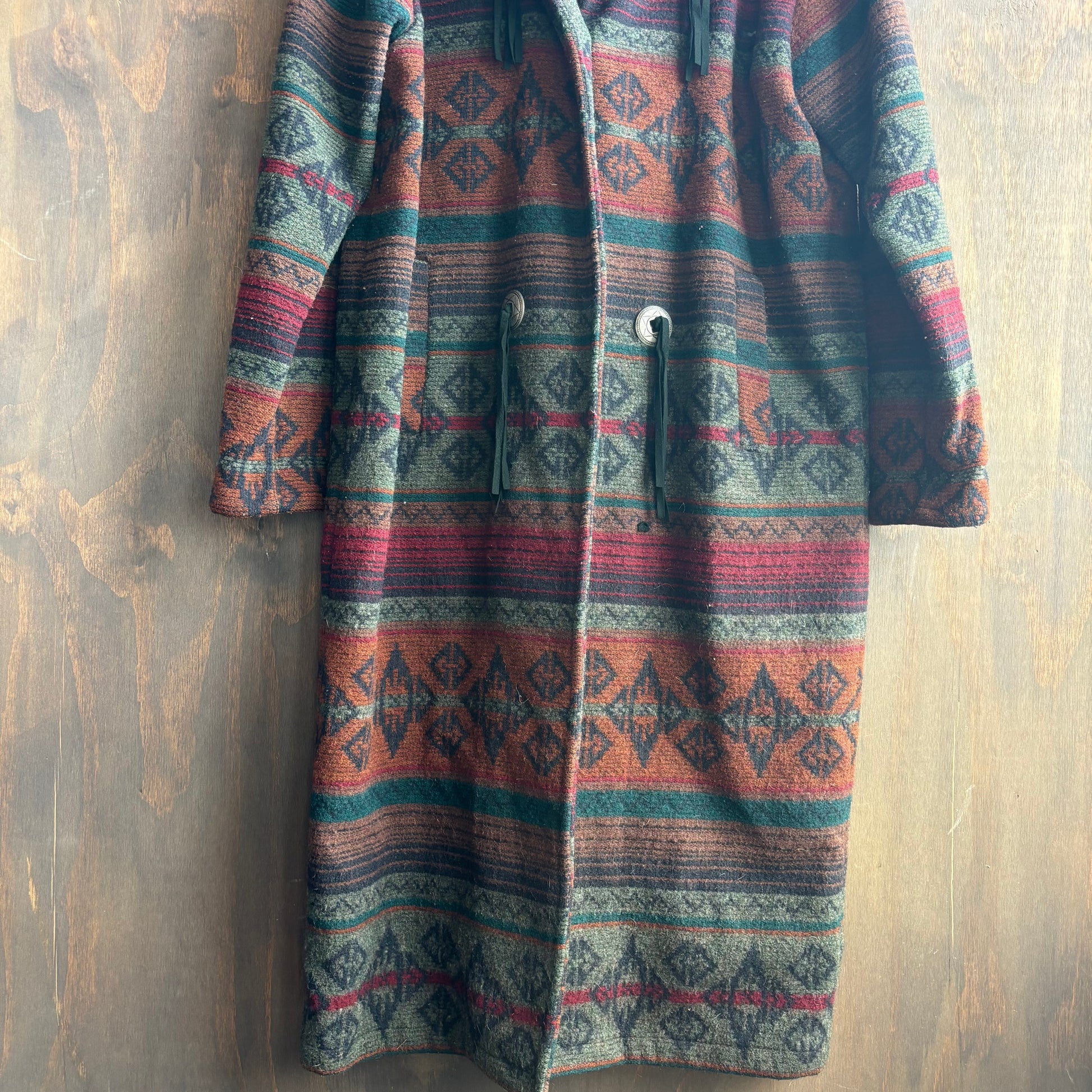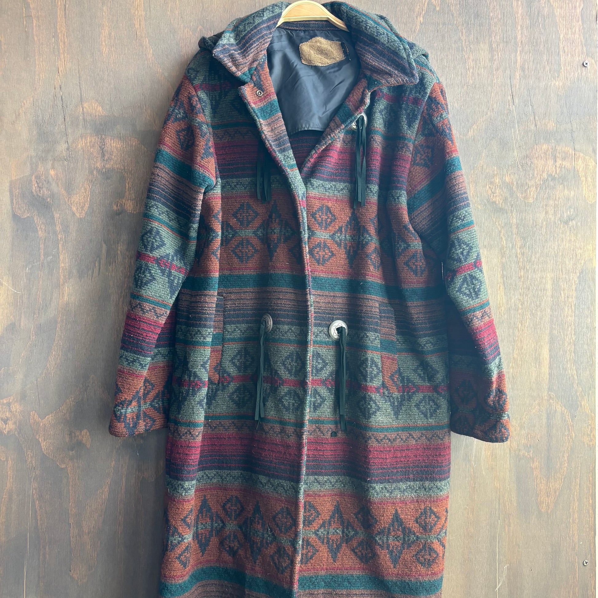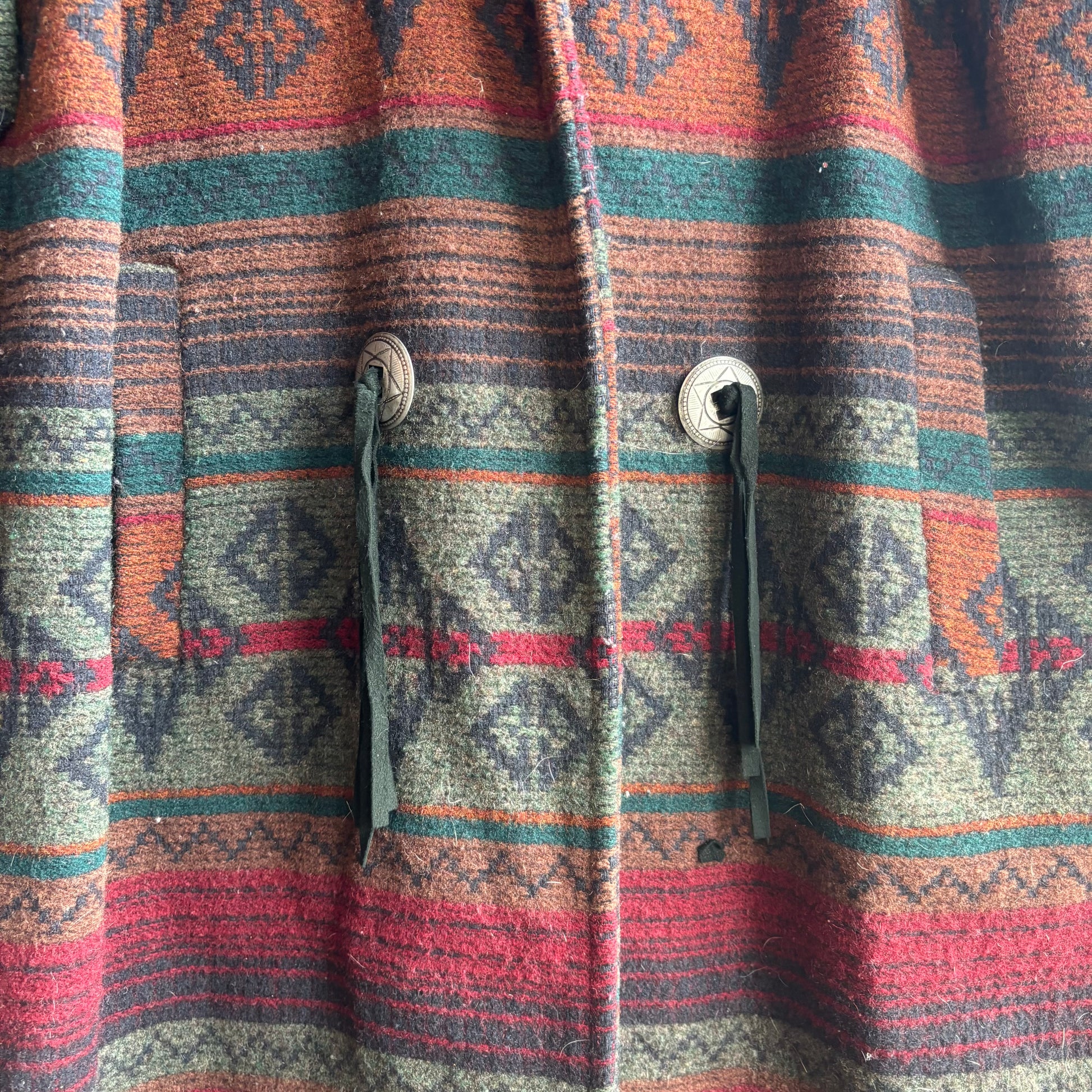 Fabulous, likely 1990's era long woven Woolrich jacket with southwestern patterns, conchos and leather tassels, as well as a detachable hood. Super warm and stylish!