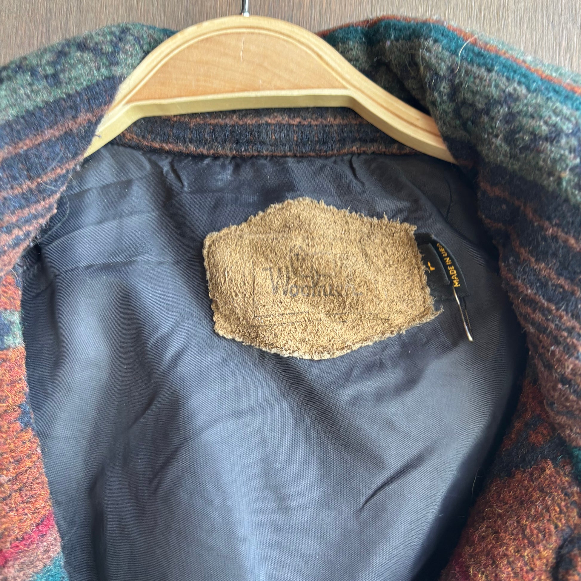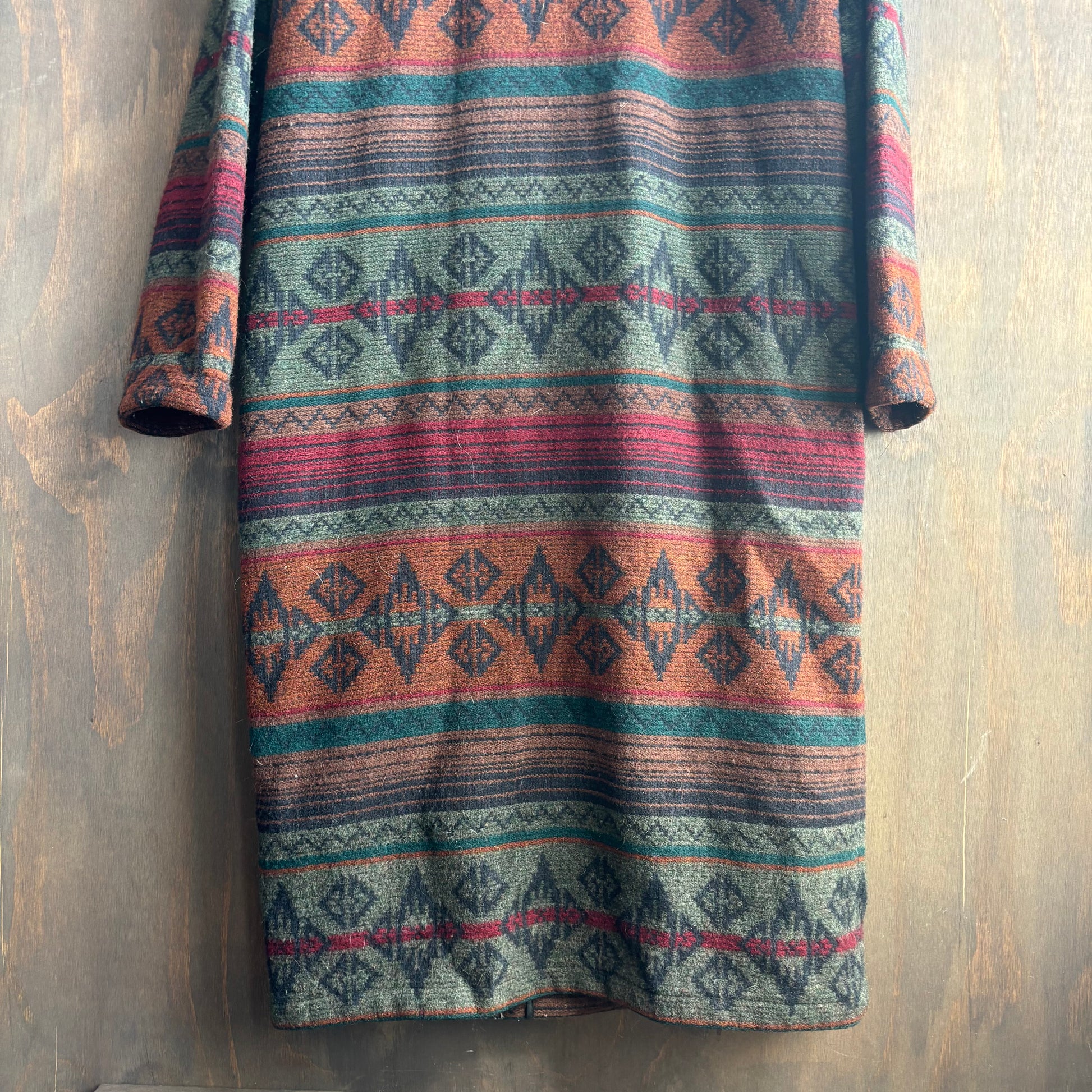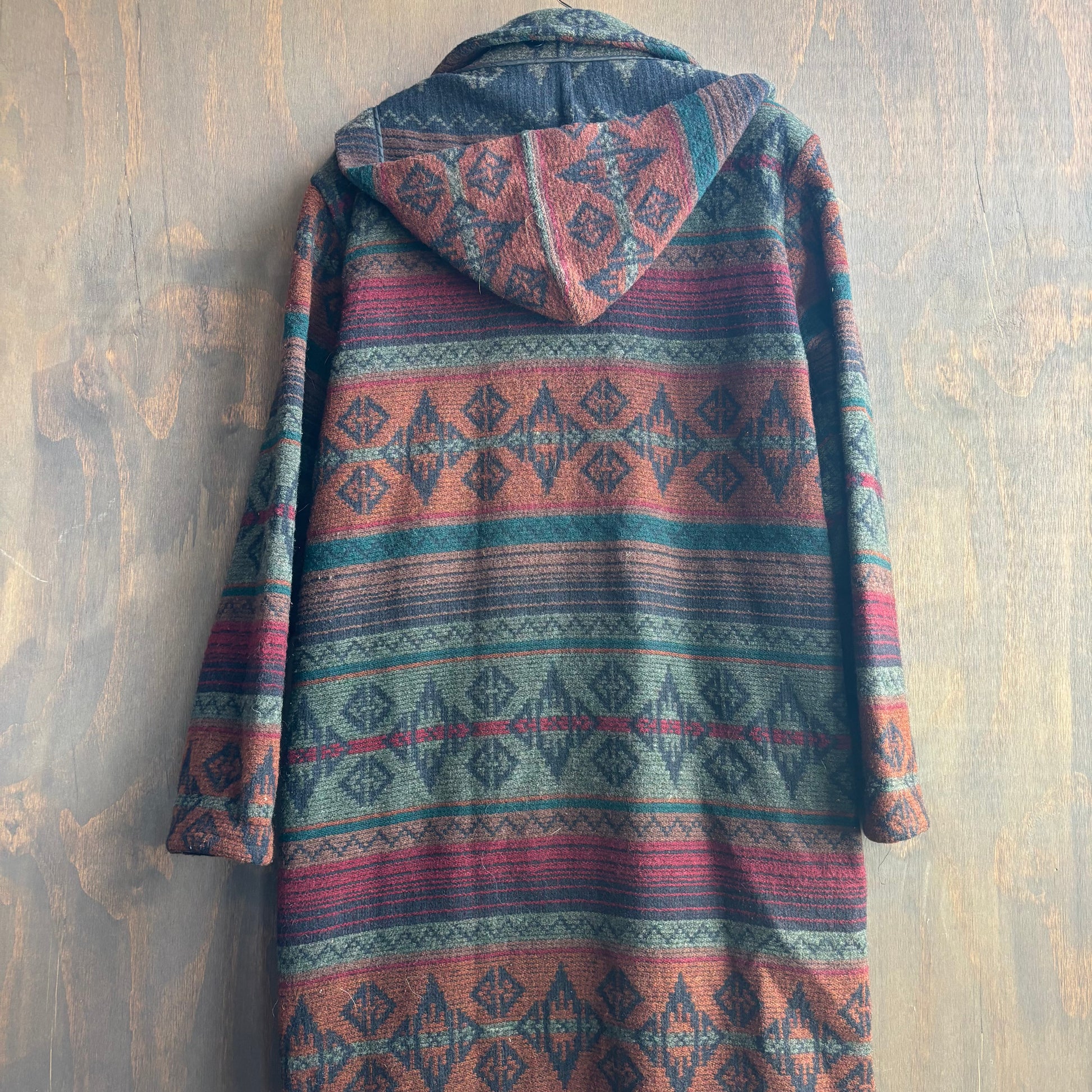 Fabulous, likely 1990's era long woven Woolrich jacket with southwestern patterns, conchos and leather tassels, as well as a detachable hood. Super warm and stylish!
