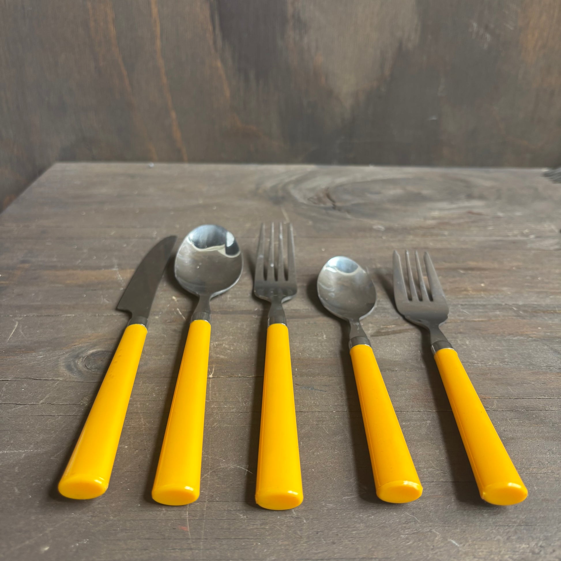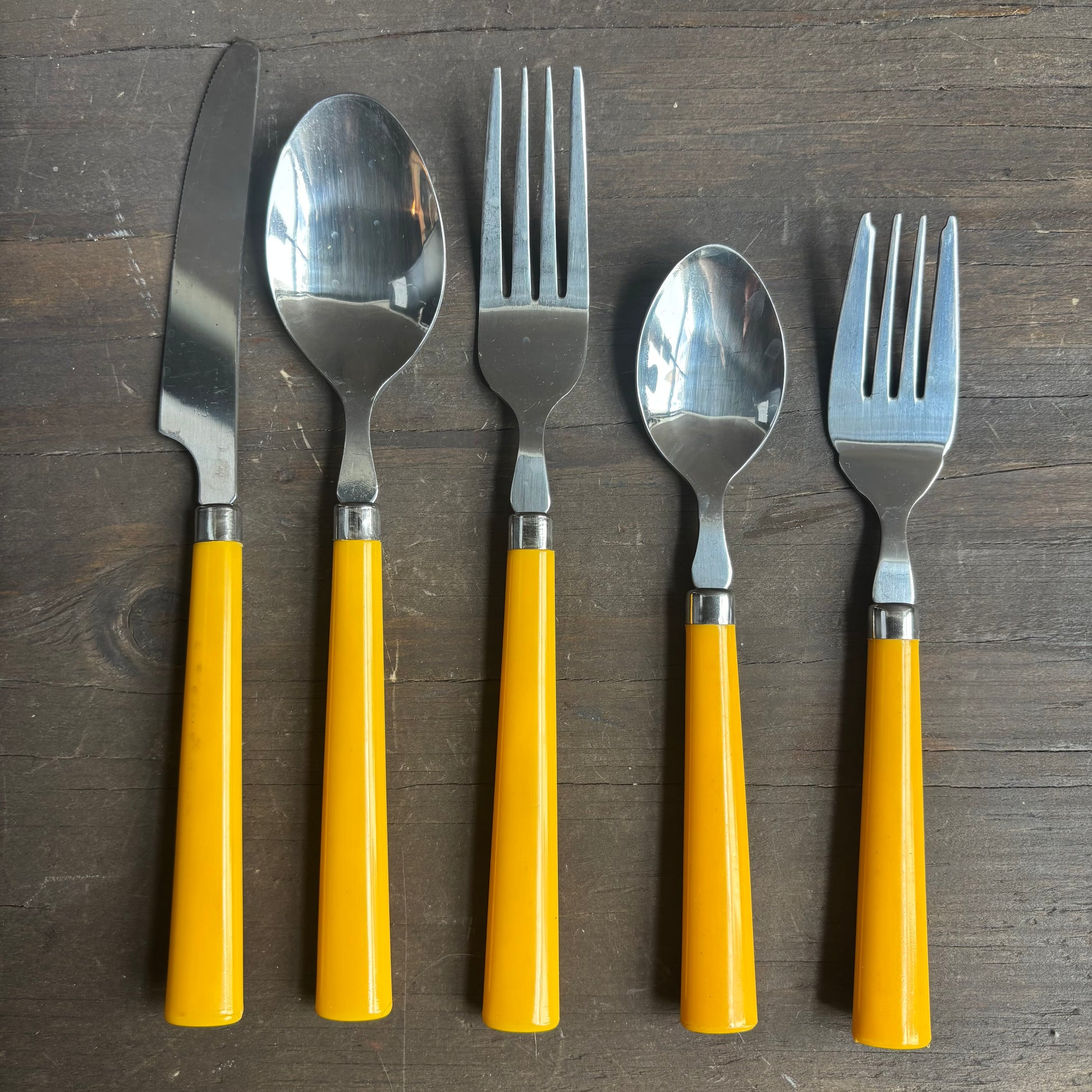Charming vintage Bakelite silverware set in bright yellow, full 5-piece set of 3, stainless steel, includes: