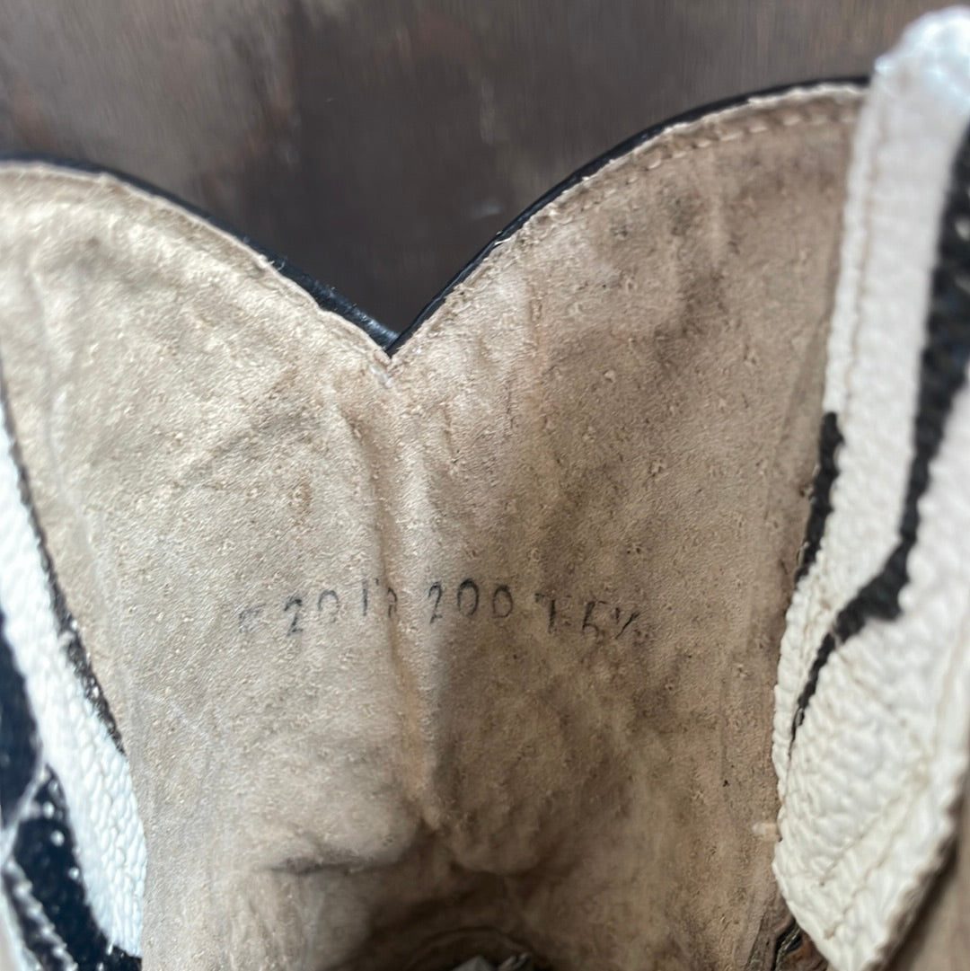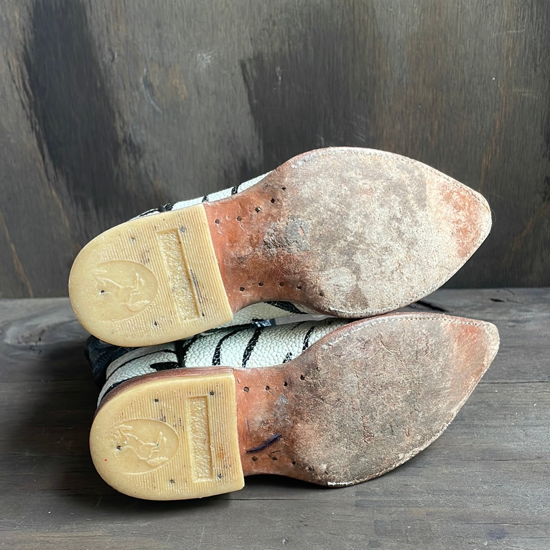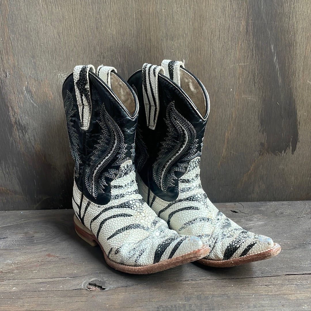Vintage zebra print kids cowboy boots with point toe. Crocodile leather lower with black, blue and white stitched upper. Pre-loved vintage condition with wear and scuffed toes accordingly. No size marked but these measure like a kids MX 10 / US 2