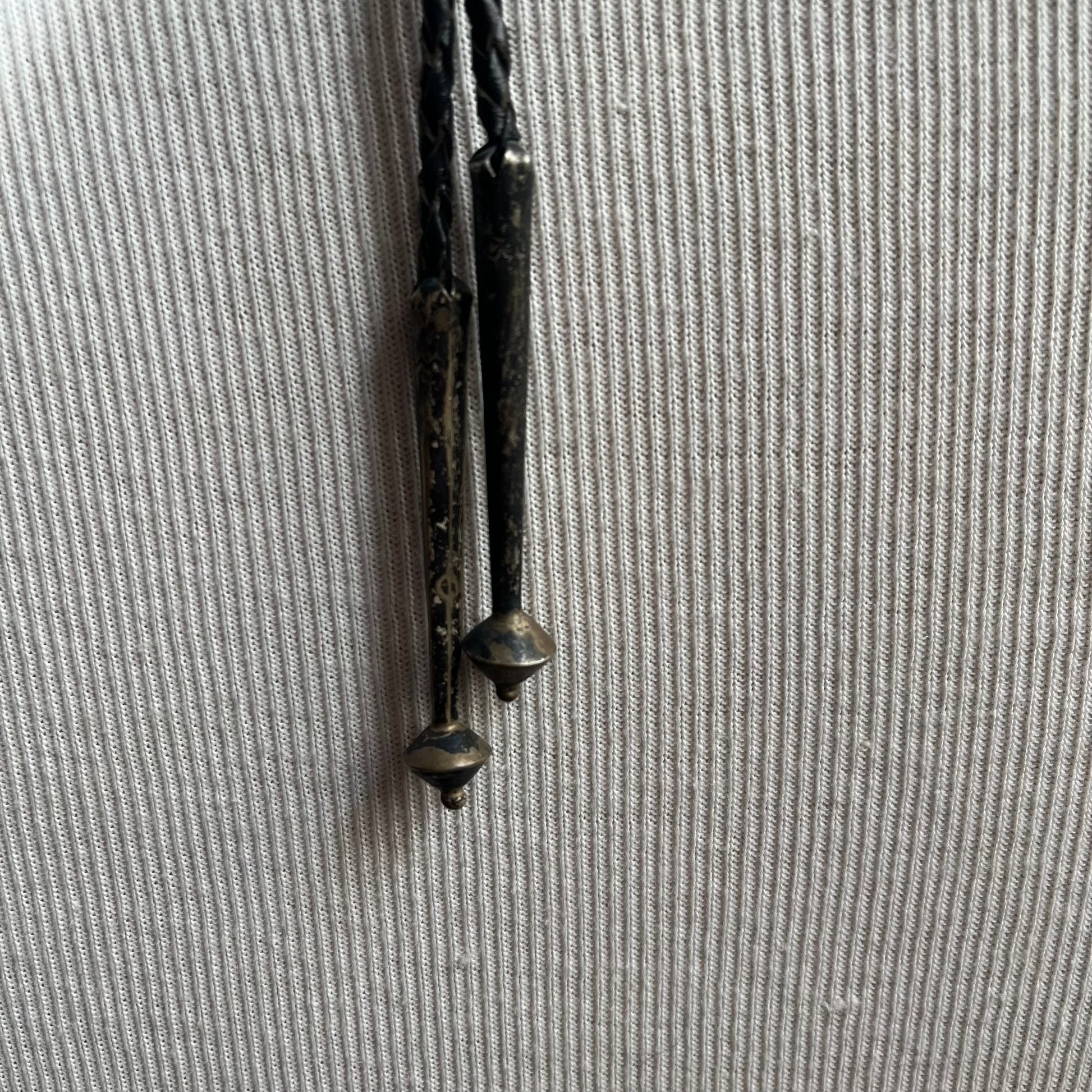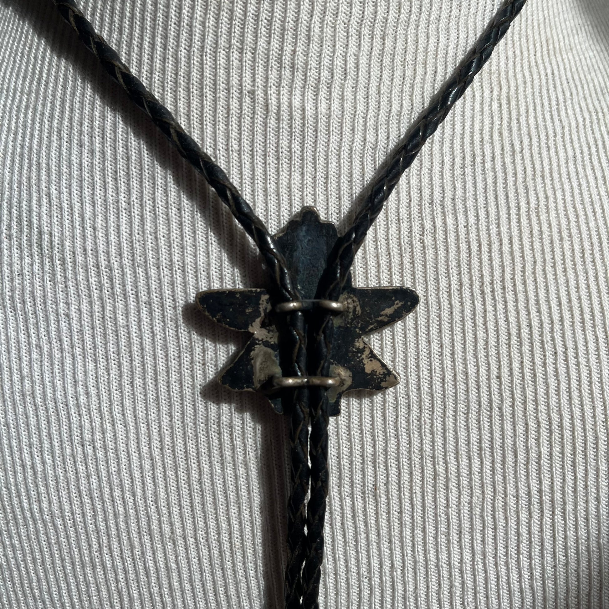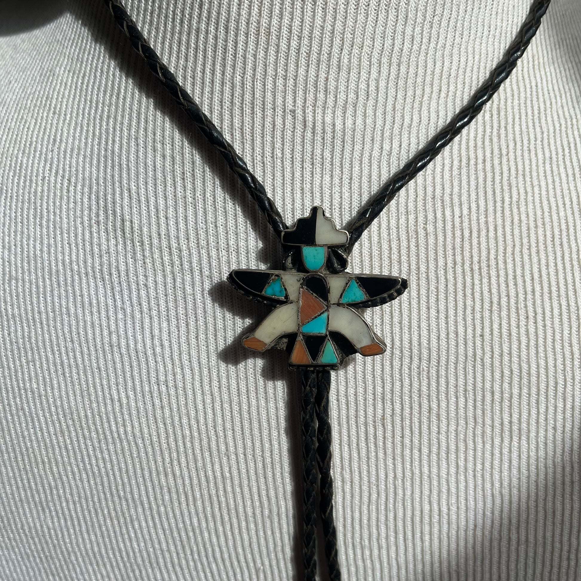 This Zuni Knifewing bolo showcases the intricate traditional design of the Knifewing deity, representing protection and strength. The pendant is set on a sleek black leather tie. Sterling silver and real stones.